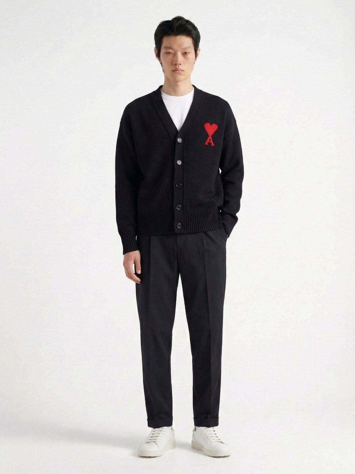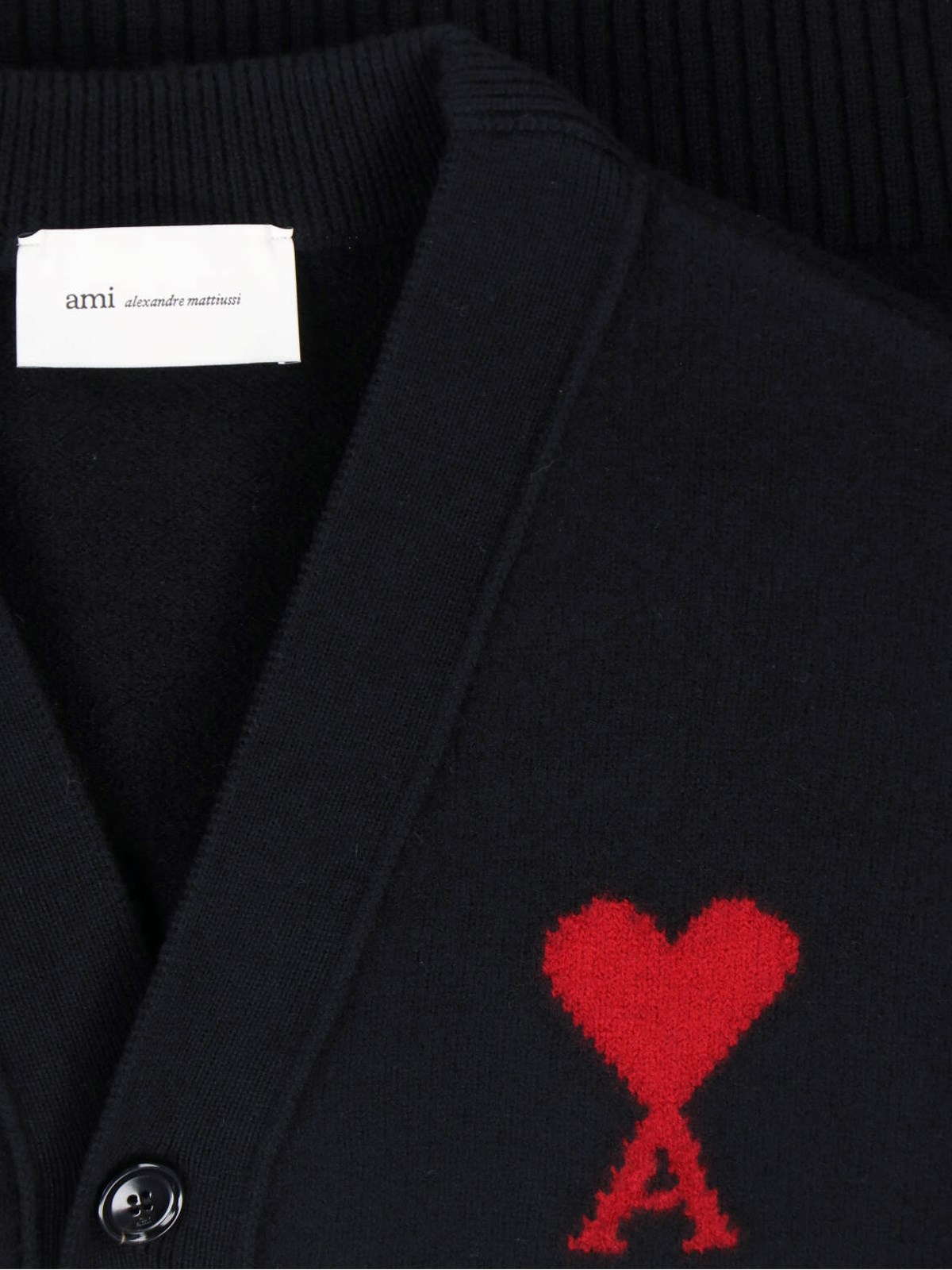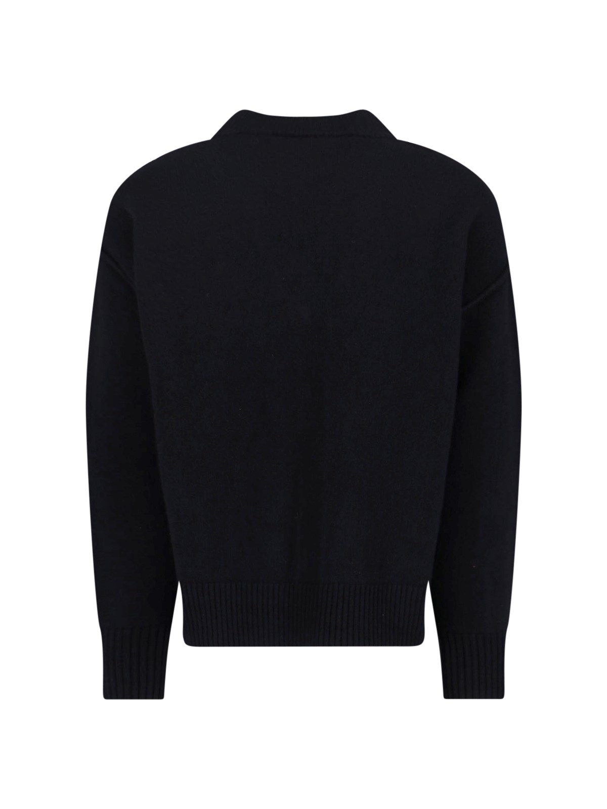 Ami "Ami de Coeur" black wool cardigan with V-neck, dropped shoulders, button closure, contrasting logo on the front, elastic cuffs, straight hem.