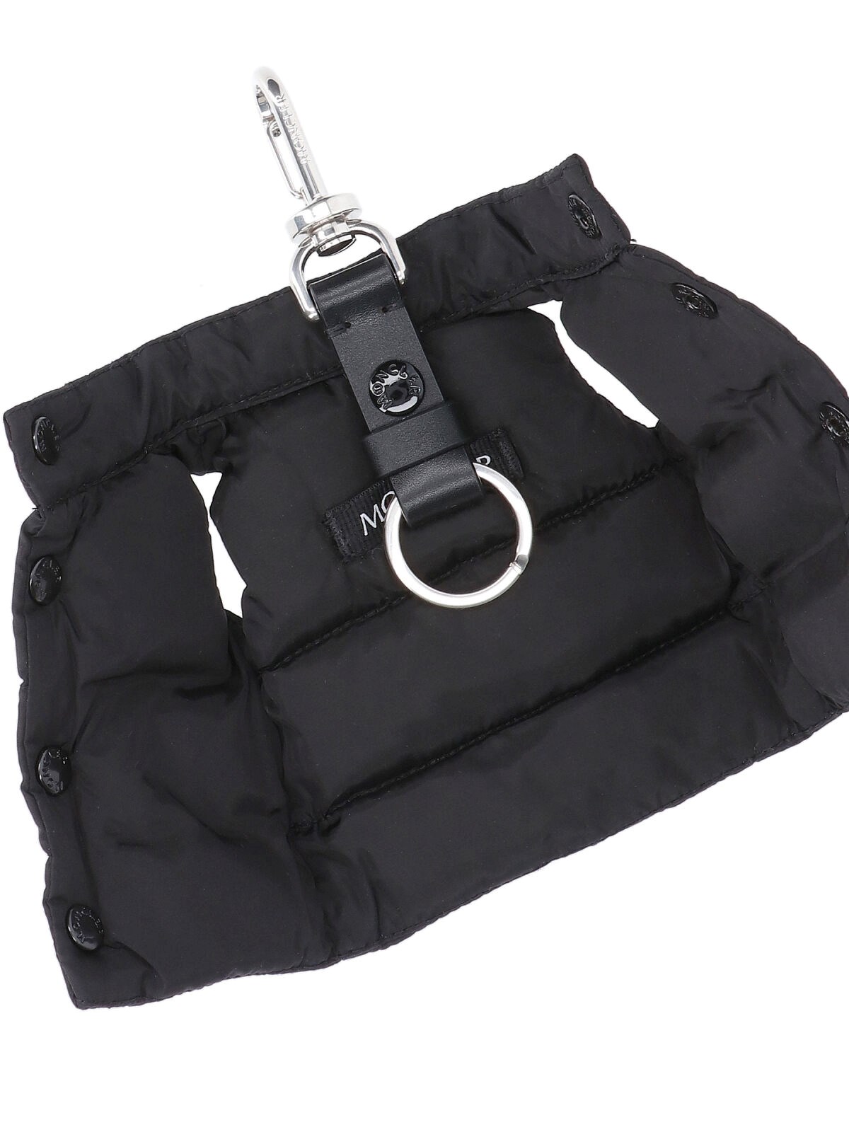 Moncler waistband in black fabric with silver hardware, leather strap with snap button closure, and front logo patch.