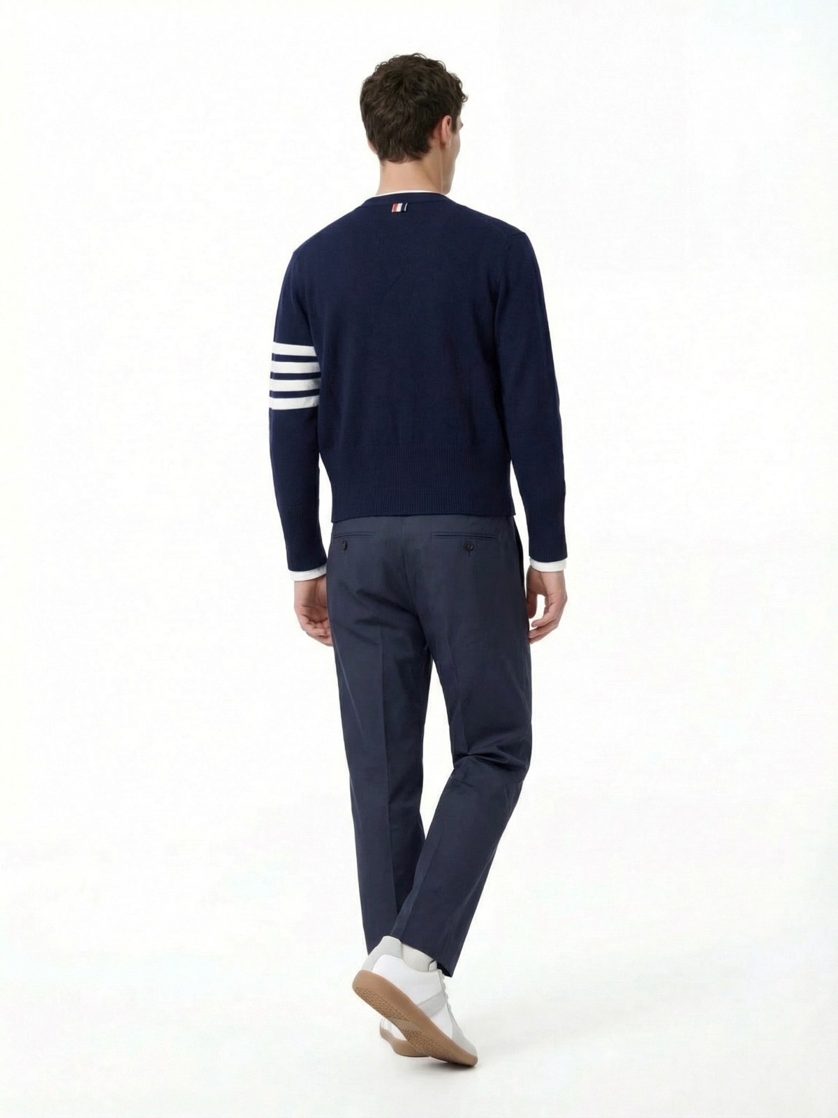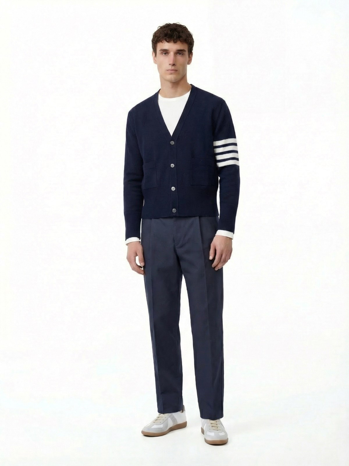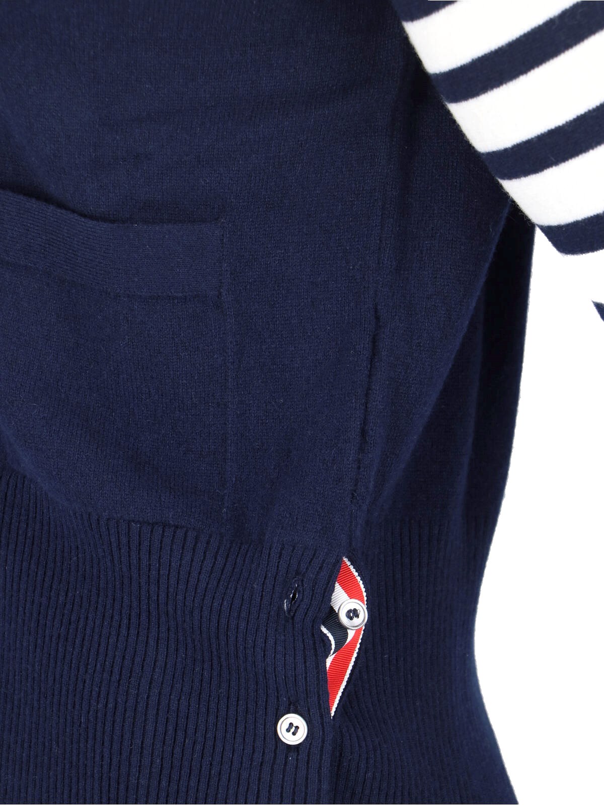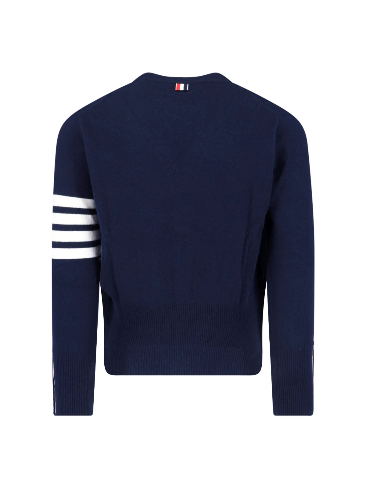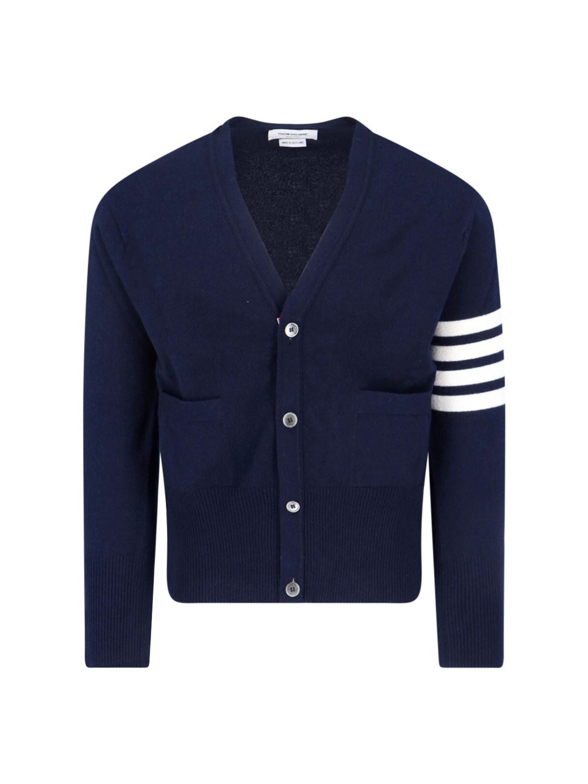 Thom Browne 4-Bar Cardigan, cashmere, blue, v-neck, long sleeves, front buttoning with tricolor detail, iconic white stripes on the sleeve, front patch pockets, ribbed hem and cuffs with buttons and tricolor detail.