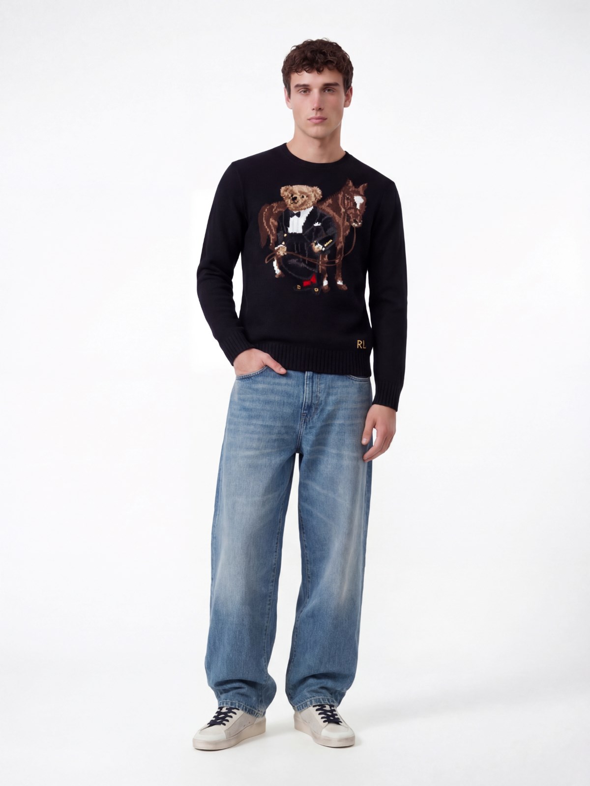 Polo Ralph Lauren "Polo Bear" sweater in black wool with ribbed crew neck, maxi logo inlaid on the front, contrast side logo embroidery, ribbed trims, straight hem.