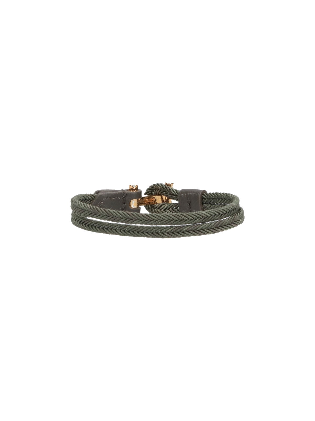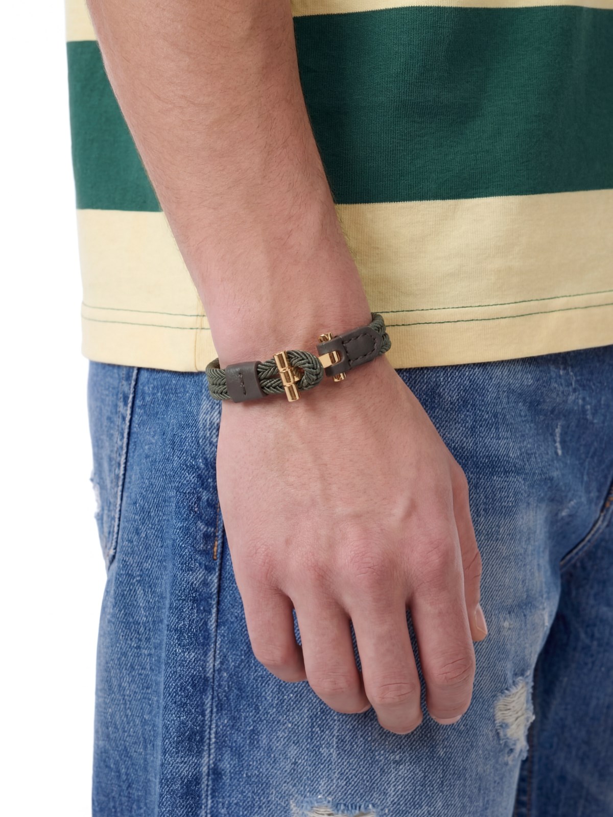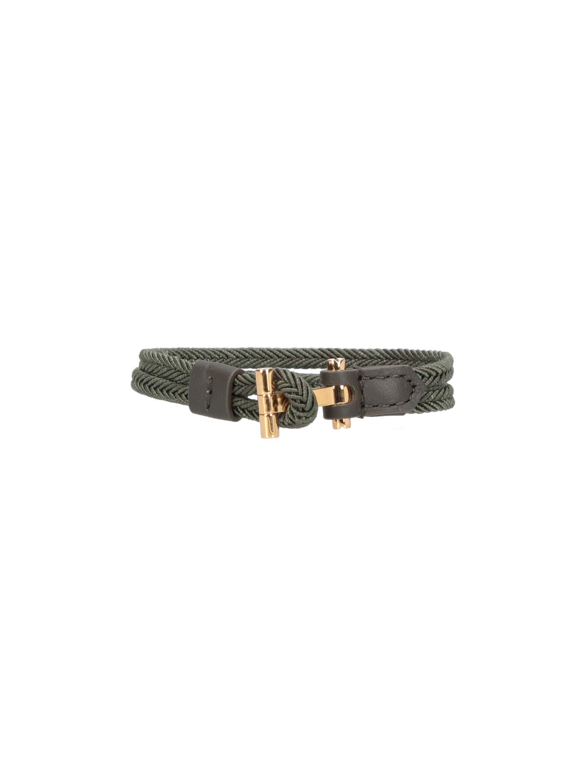 Tom Ford "T-wrap" bracelet in green braided nylon with gold metal logo hardware, adjustable.