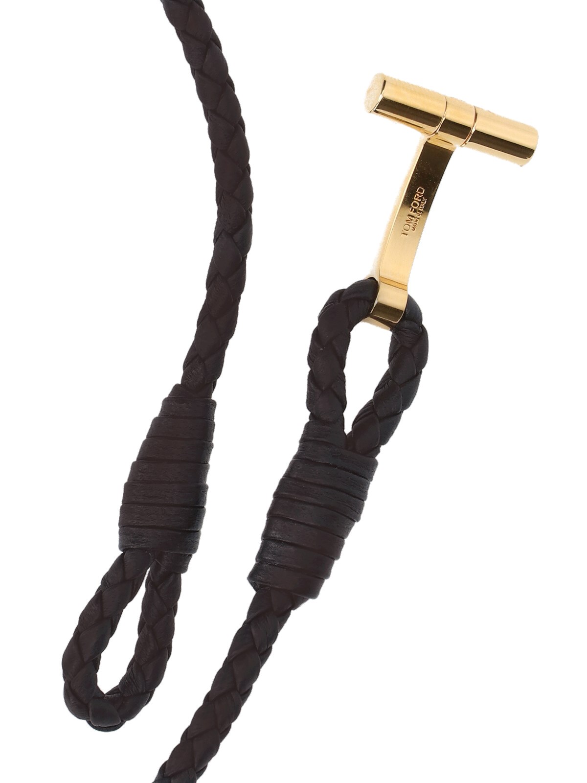 Tom Ford "T-Wrap" bracelet in black woven calf leather with gold metal logo hardware on the front, adjustable.