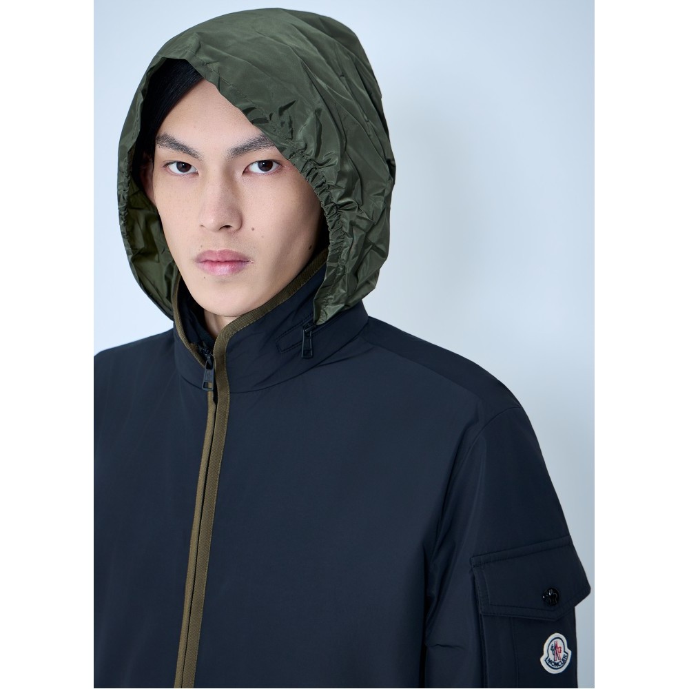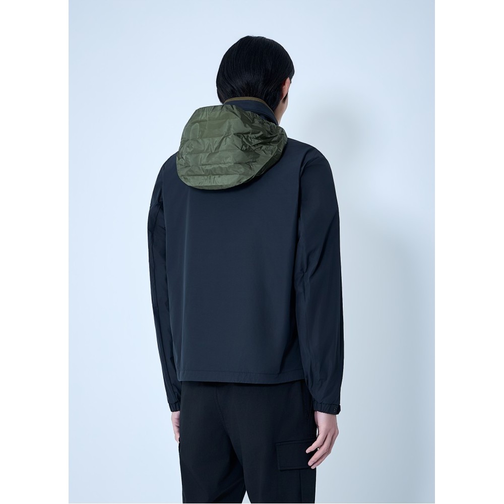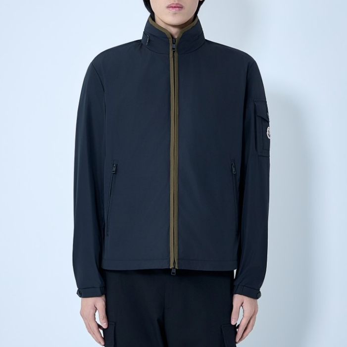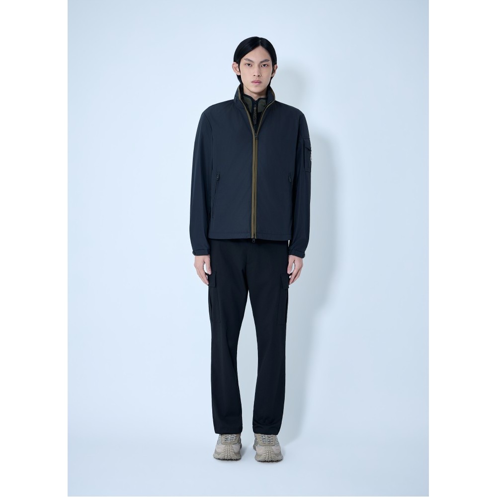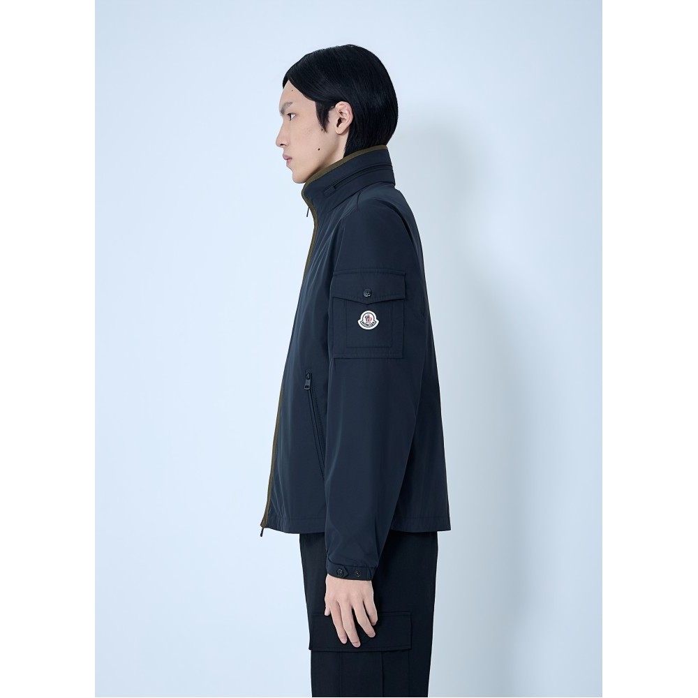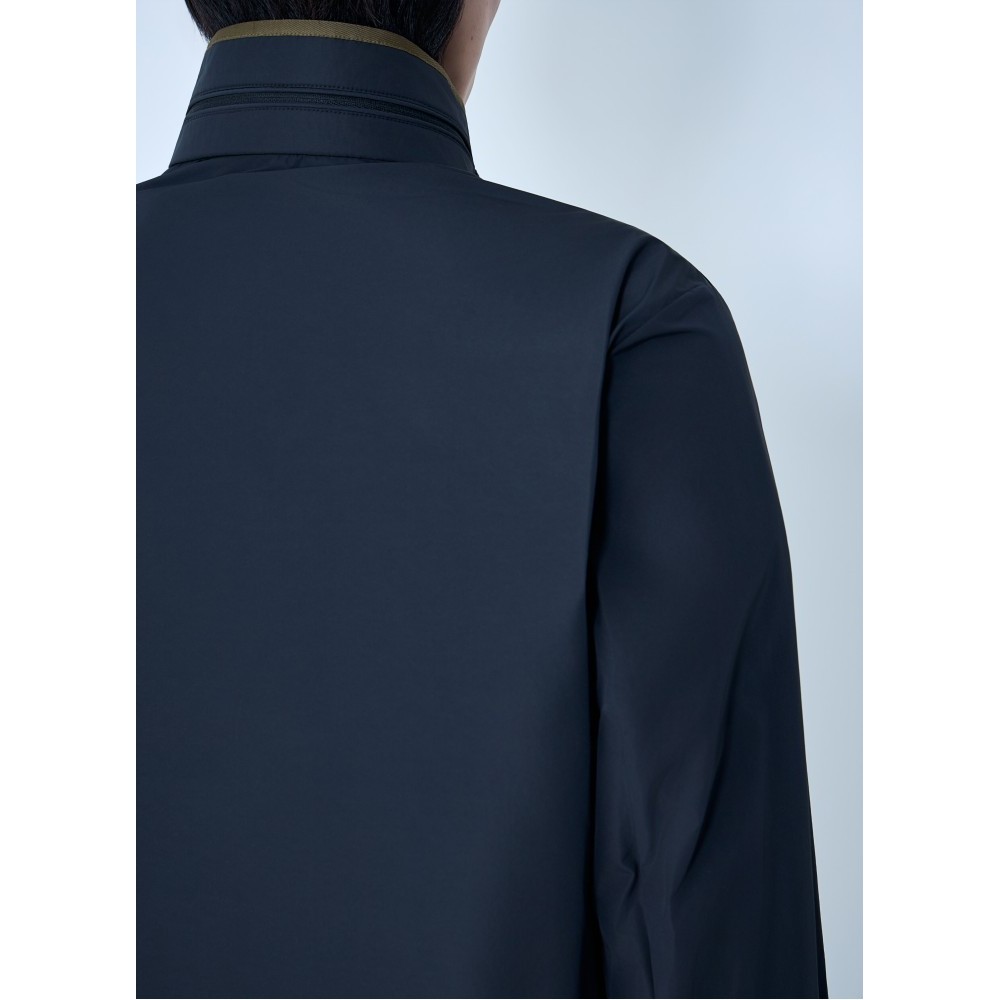 High-collar technical jacket with front zip closure.