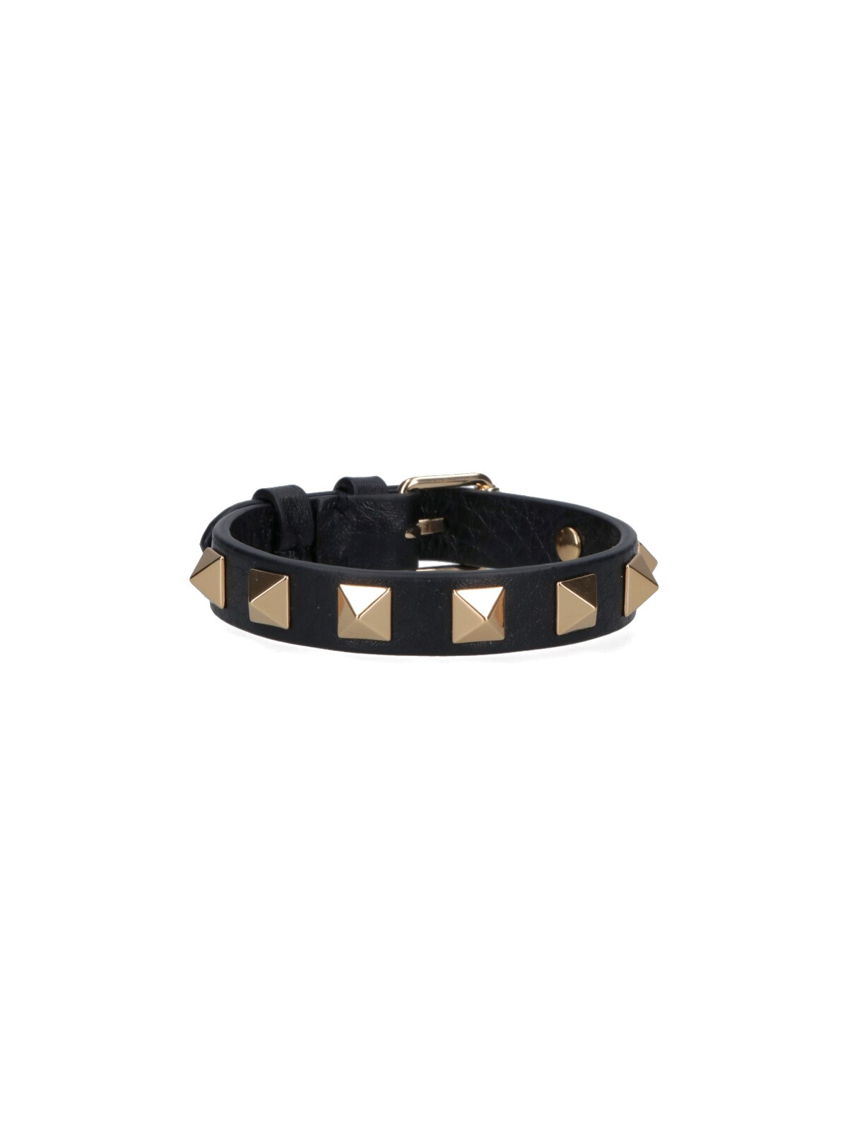 Valentino Garavani rockstud bracelet in black leather and gold brass, all-over gold brass rockstud studs details, adjustable back strap.