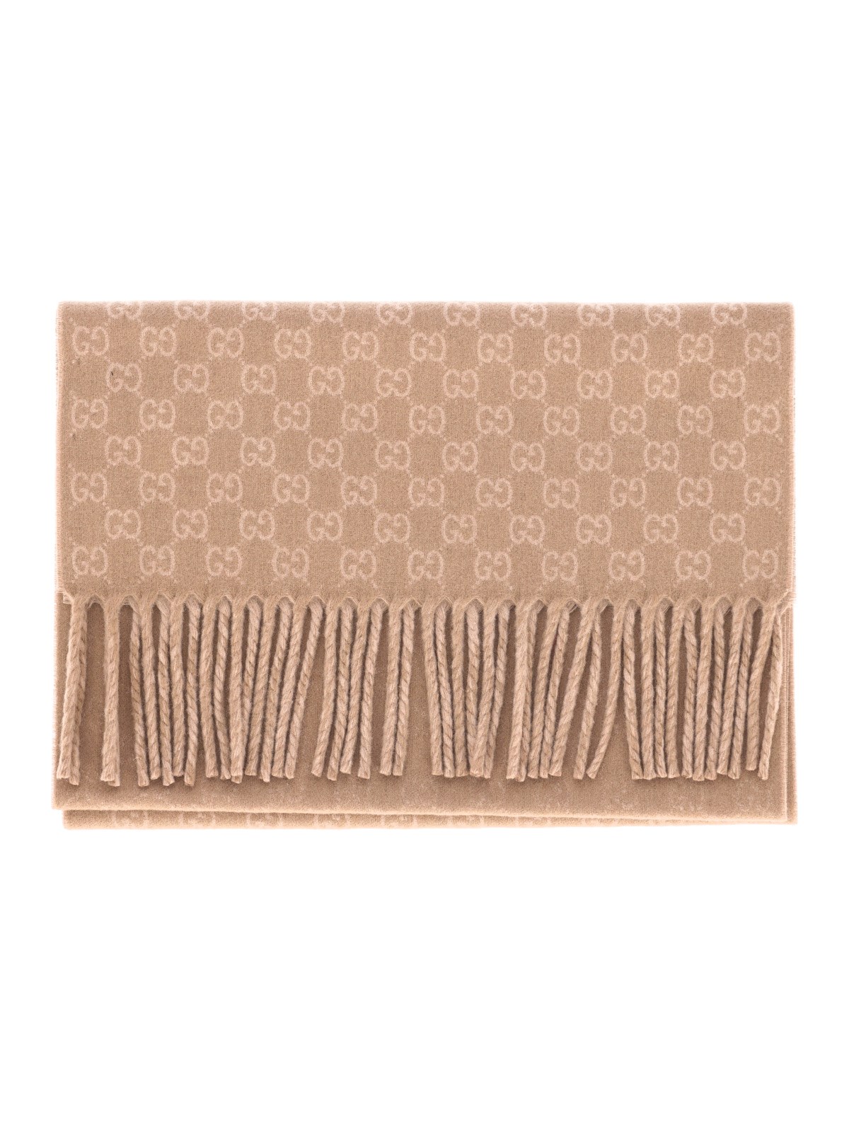 Gucci 'gg supreme' scarf in beige fabric with all-over gg supreme logo pattern, rectangular design, fringed trim.