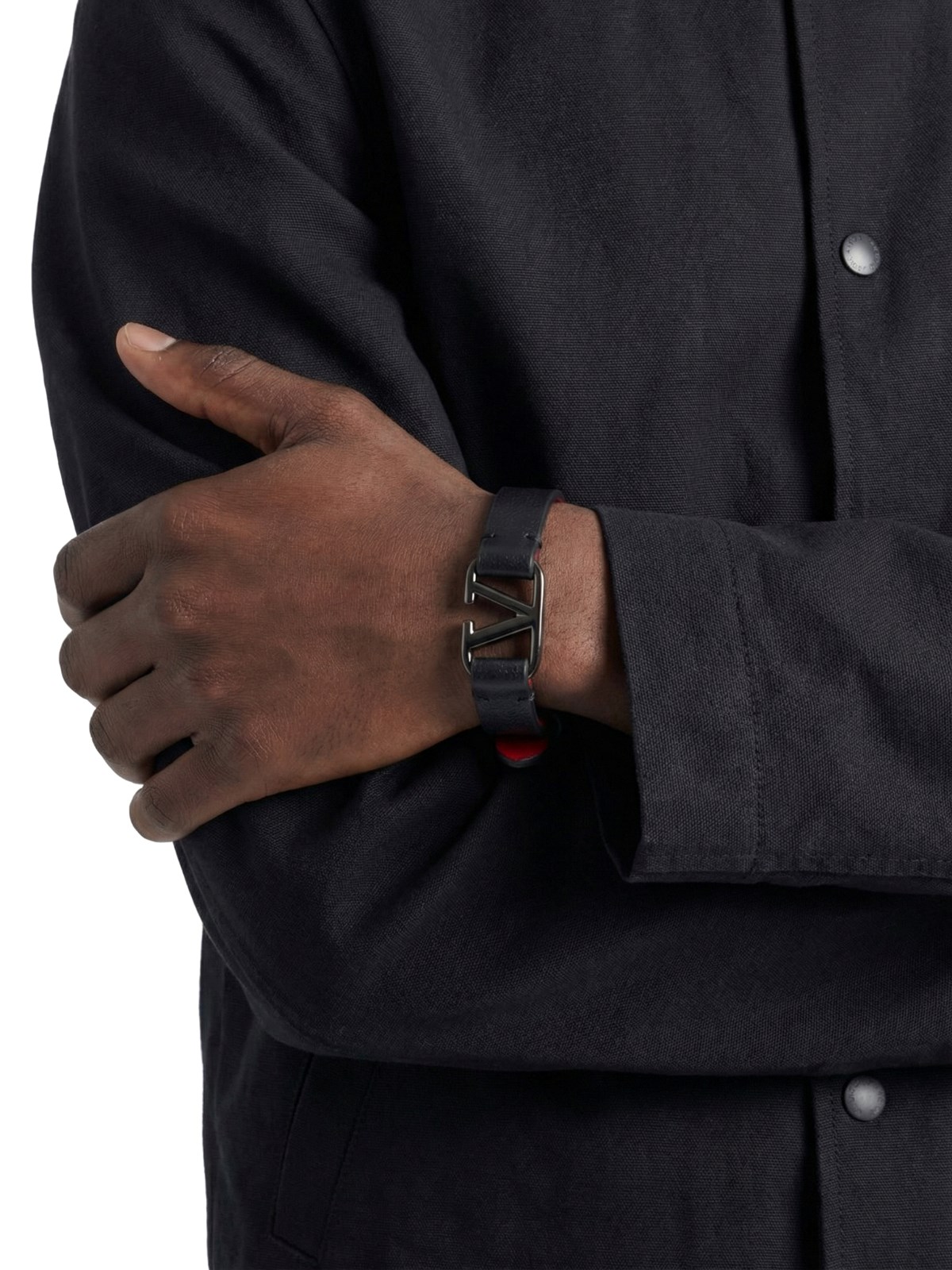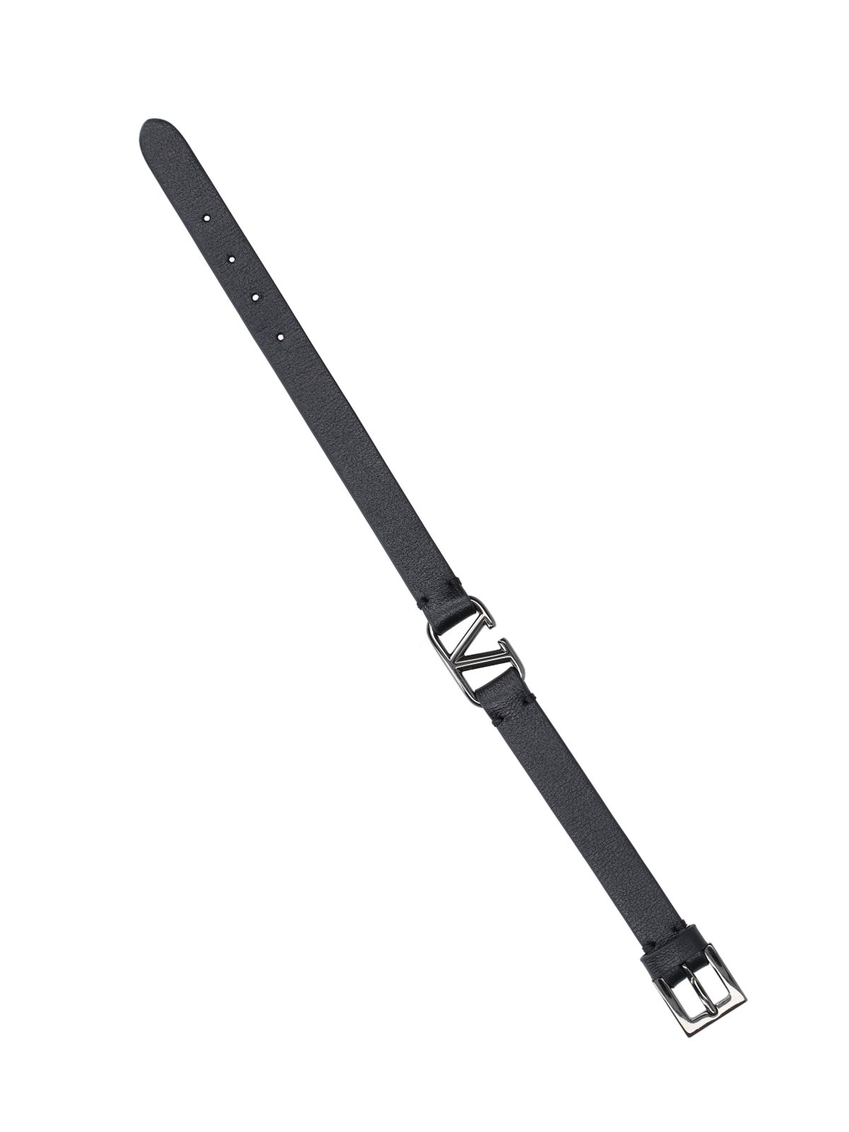 Valentino Garavani vlogo signature bracelet in black leather, silver brass vlogo signature logo, adjustable back buckle closure.