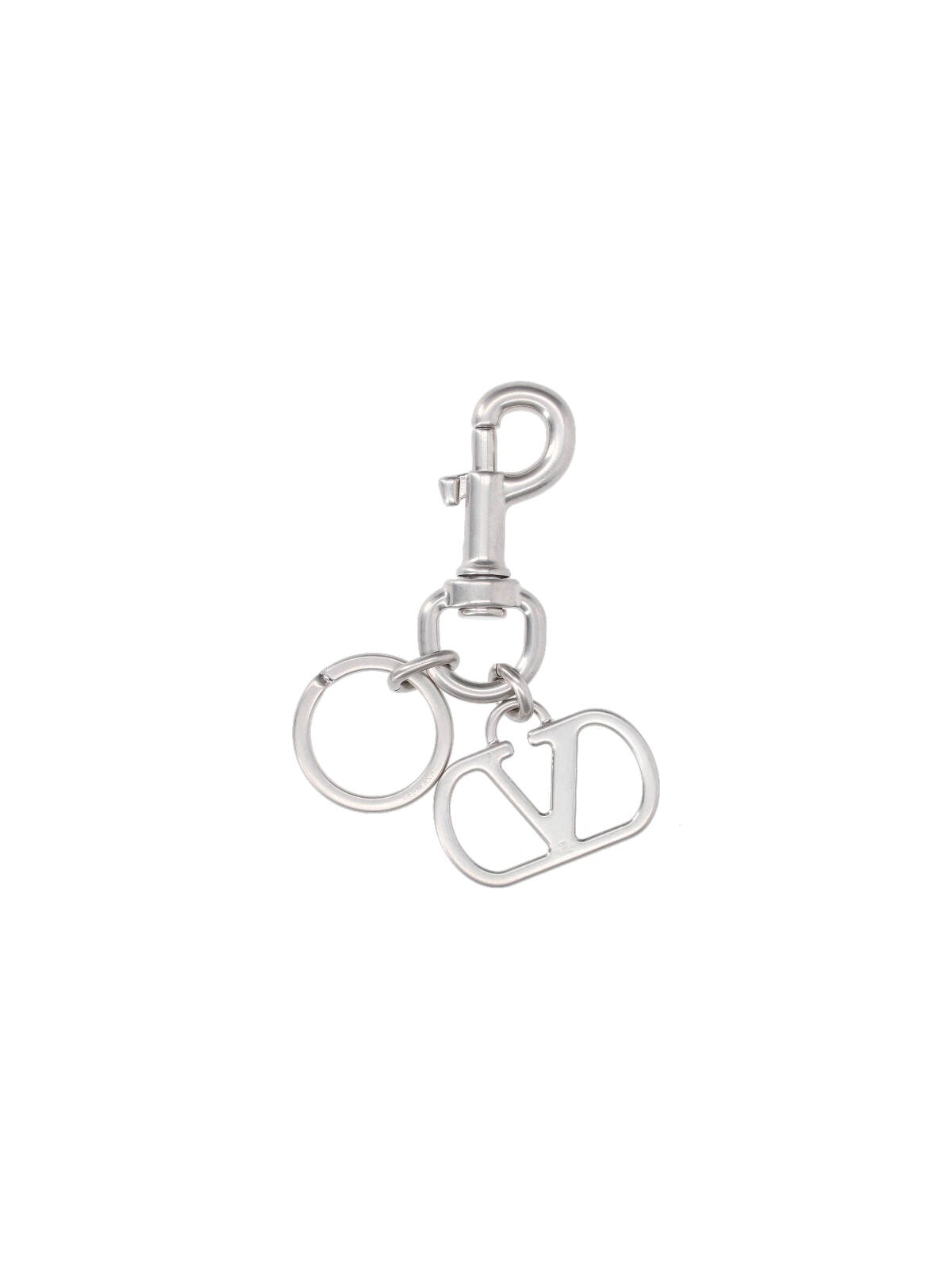 Valentino Garavani VLogo Signature keyring in silver-plated brass, front logo, ring keyring, and snap hook closure.