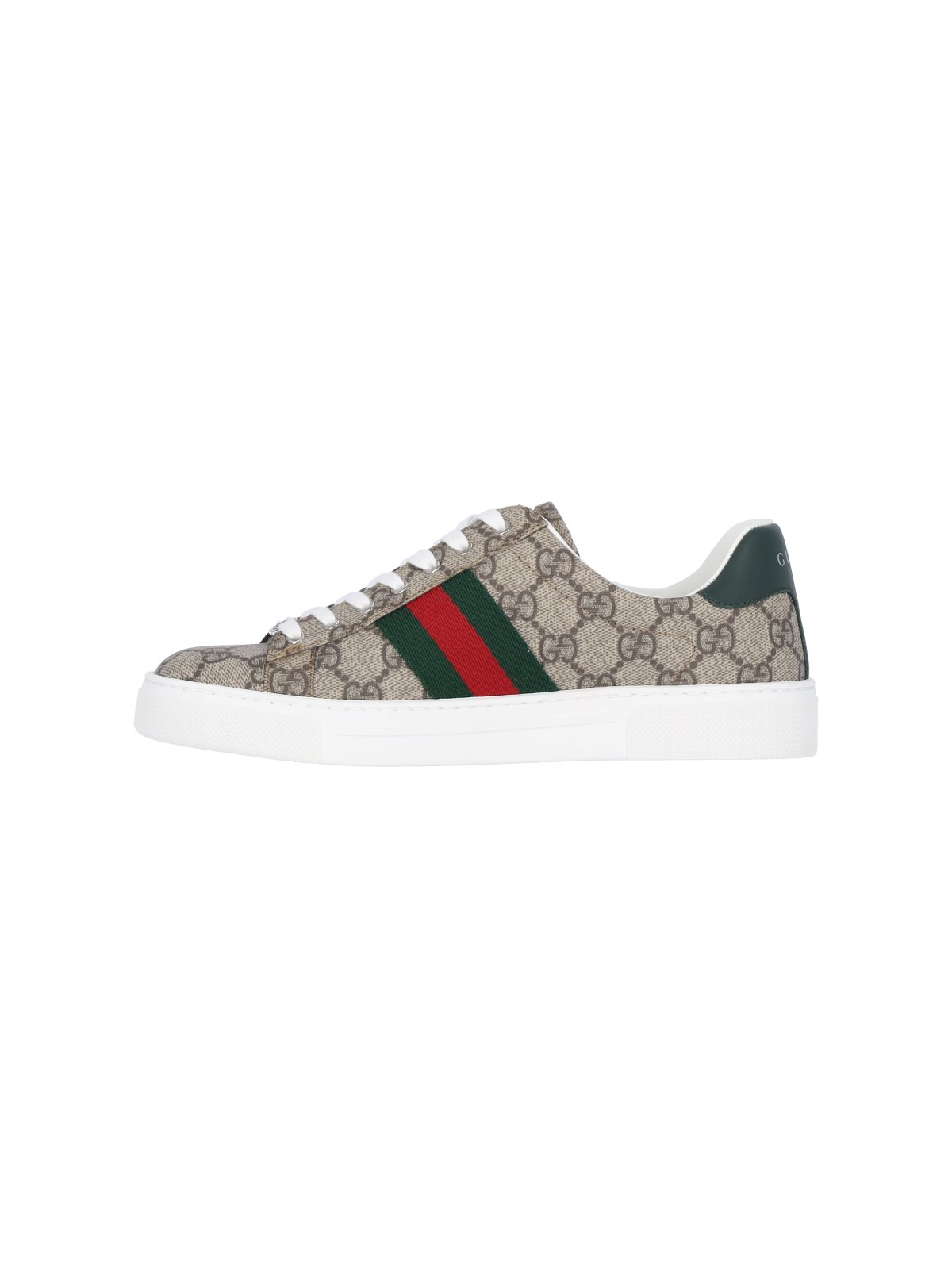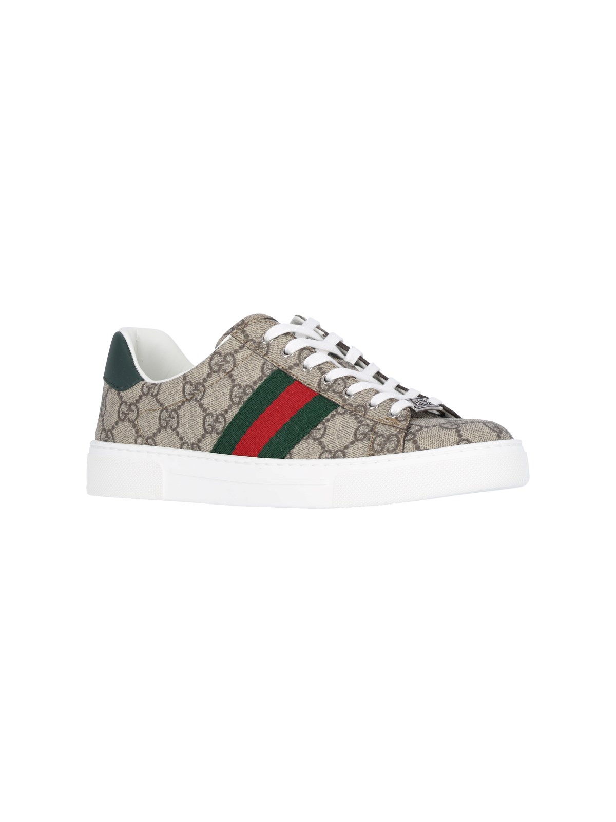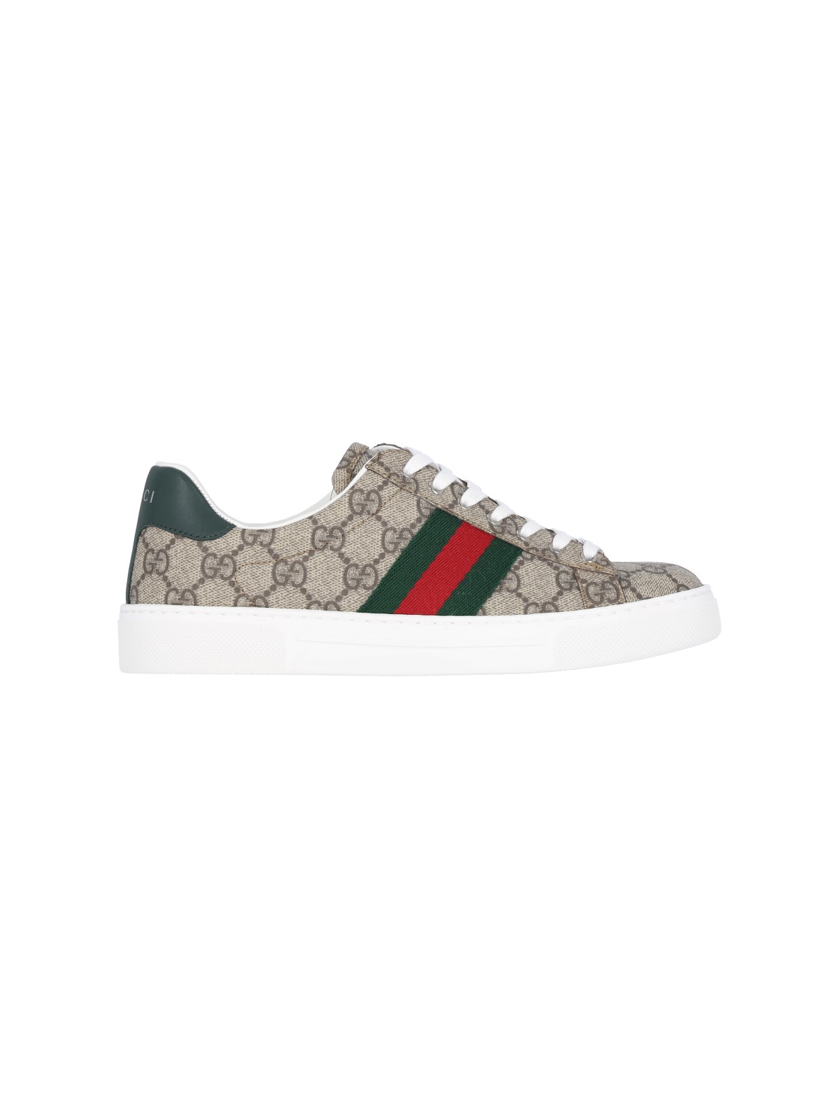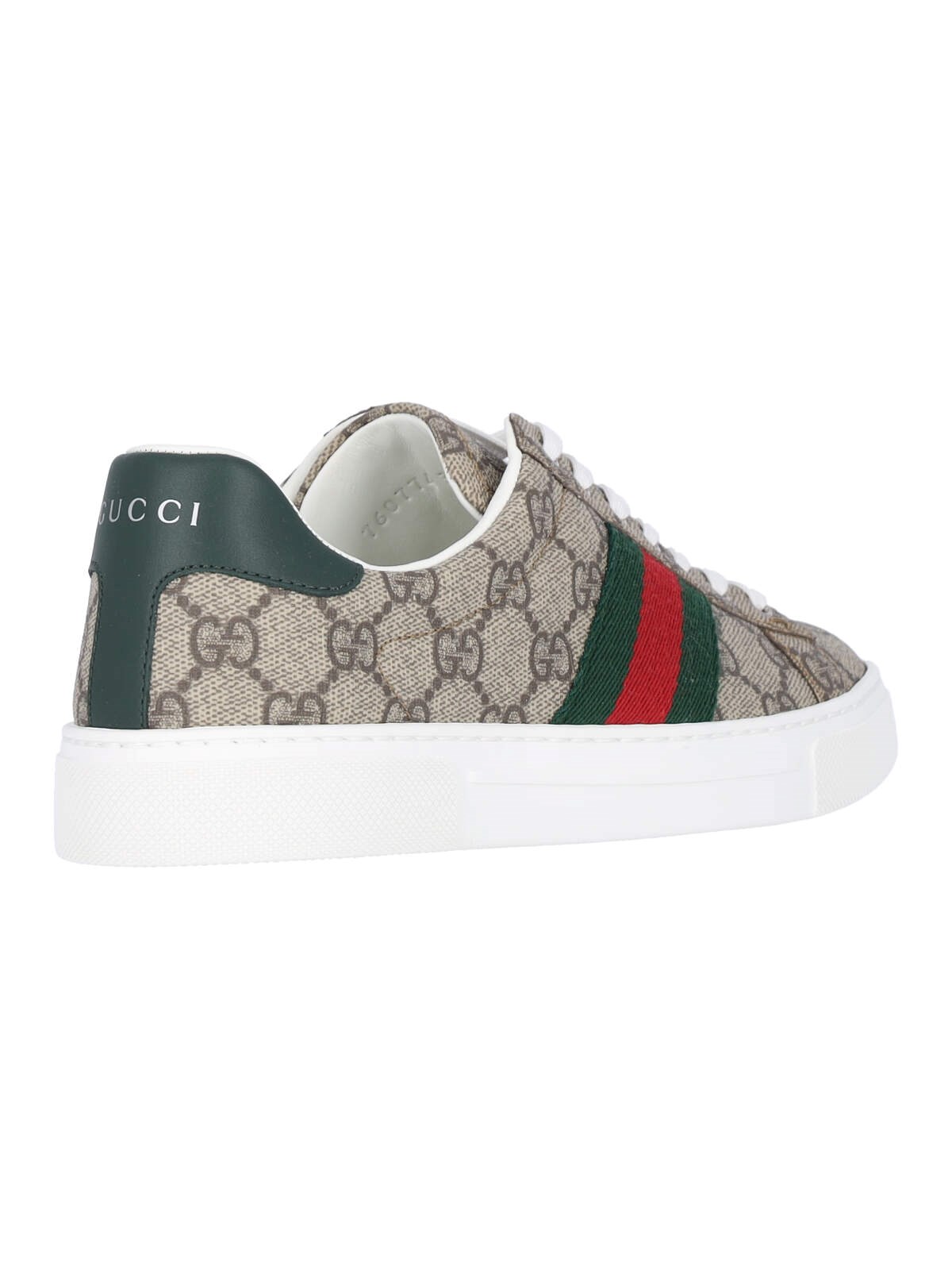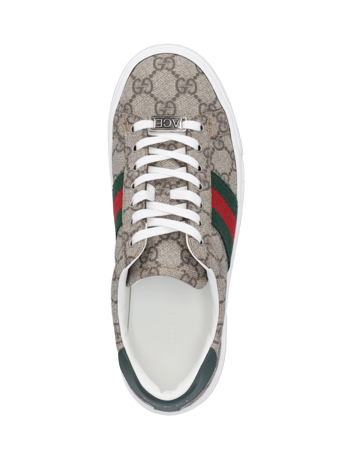 Gucci "Ace" sneakers in beige "GG Supreme" fabric with brown details, round toe, metal buckle detail on the front, green and red web ribbon on the side, green tab on the back with white logo print detail, rubber sole.