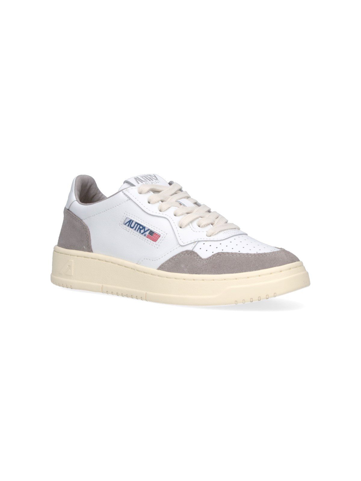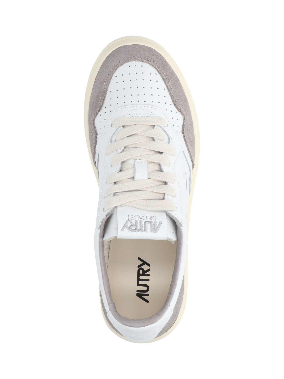 Autry Low "Medalist" white leather sneakers with round toe, lace-up closure, logo label on the tongue, multicolor logo tag on the side, back tab, contrast suede trim, rubber sole.
