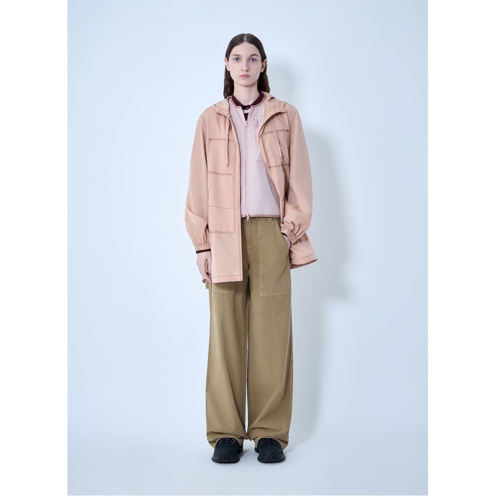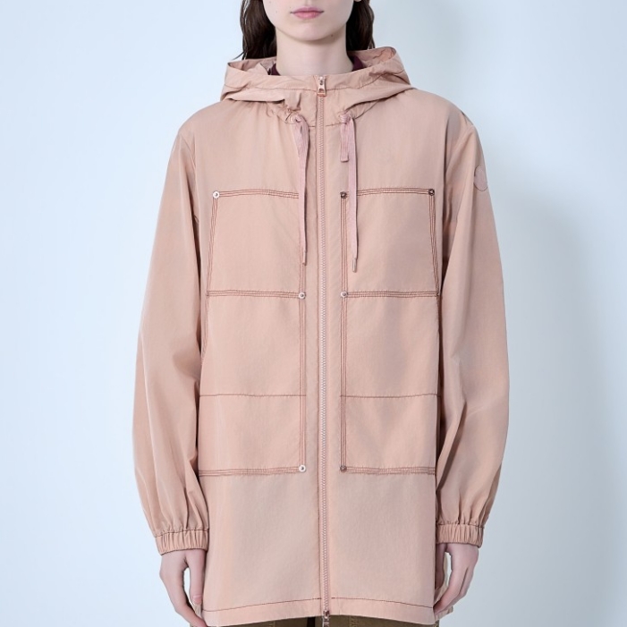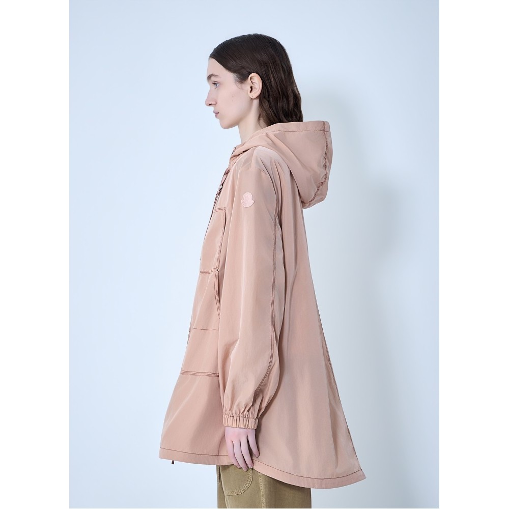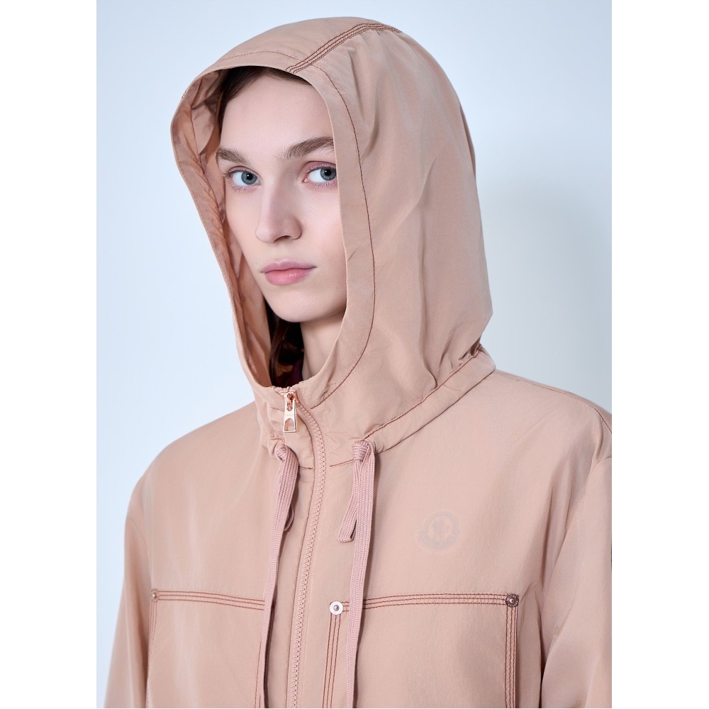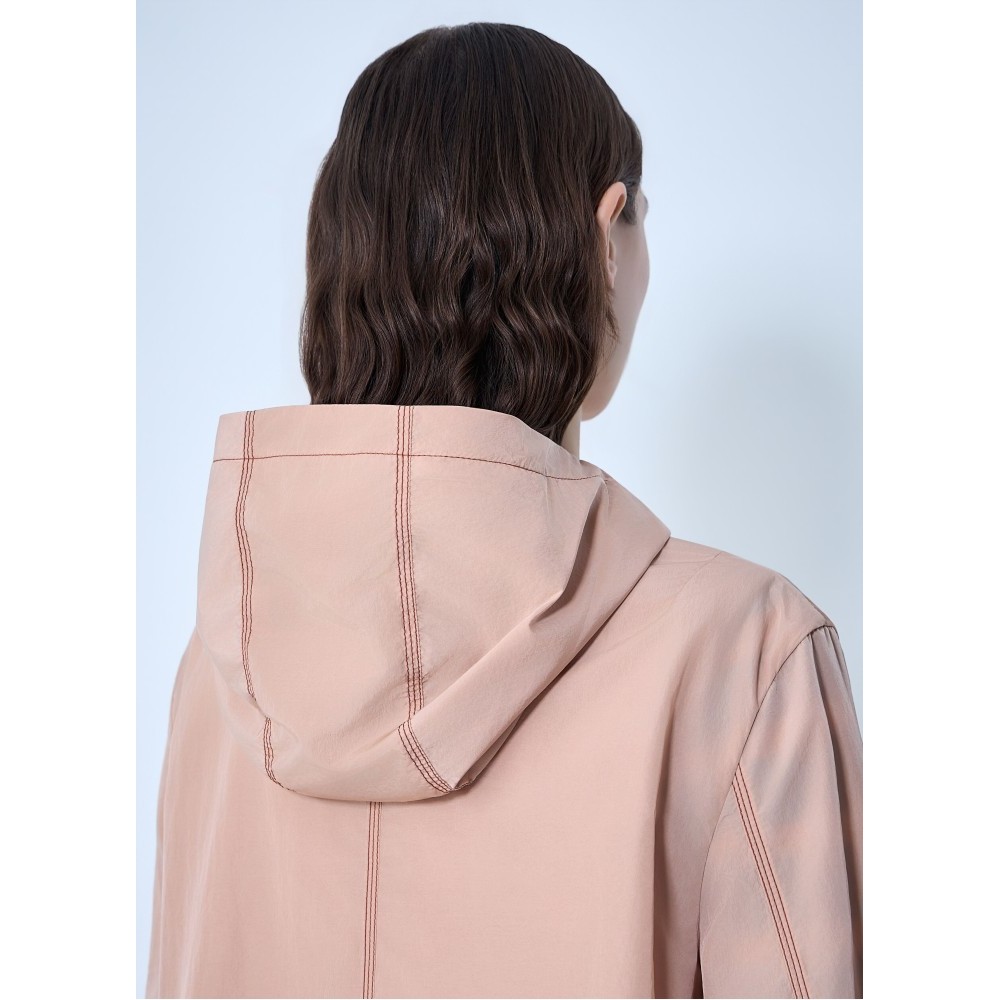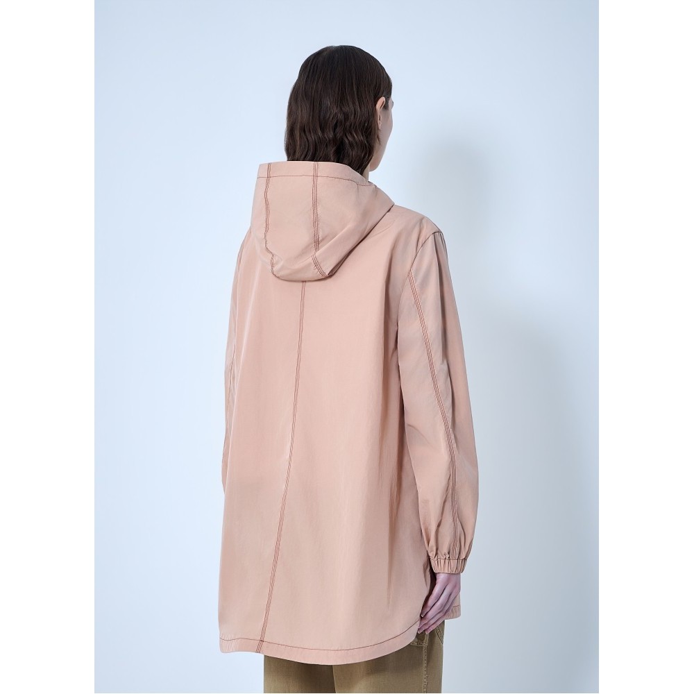 Hooded jacket with central zip closure.