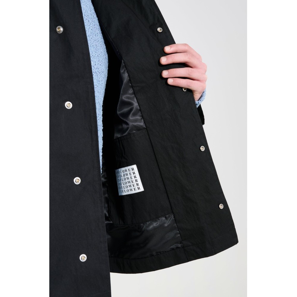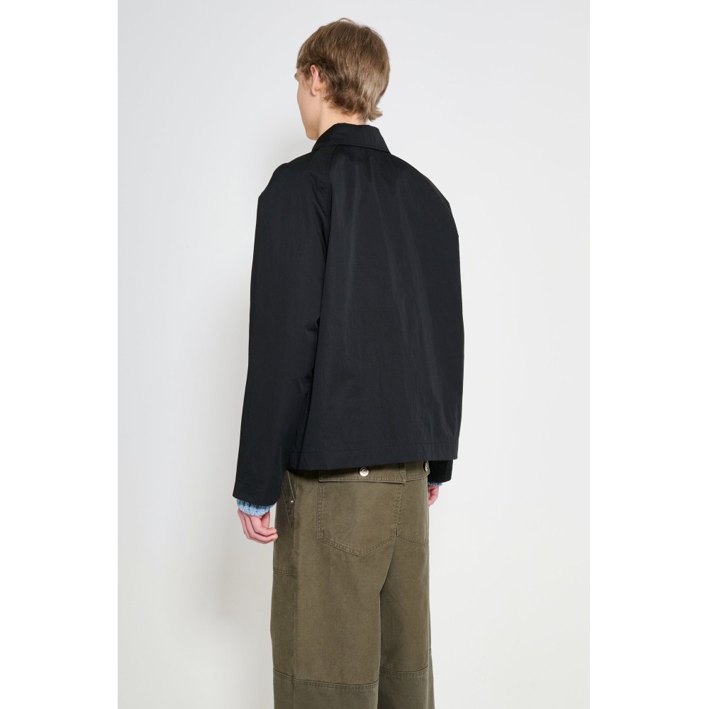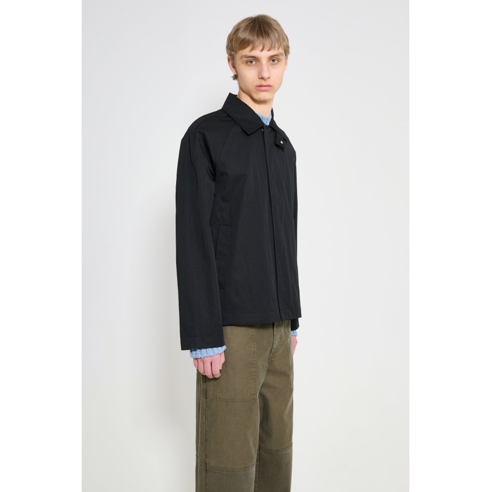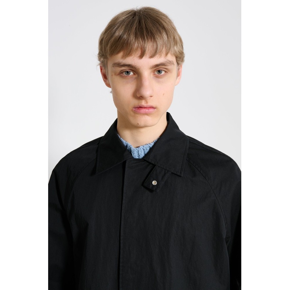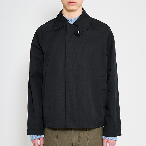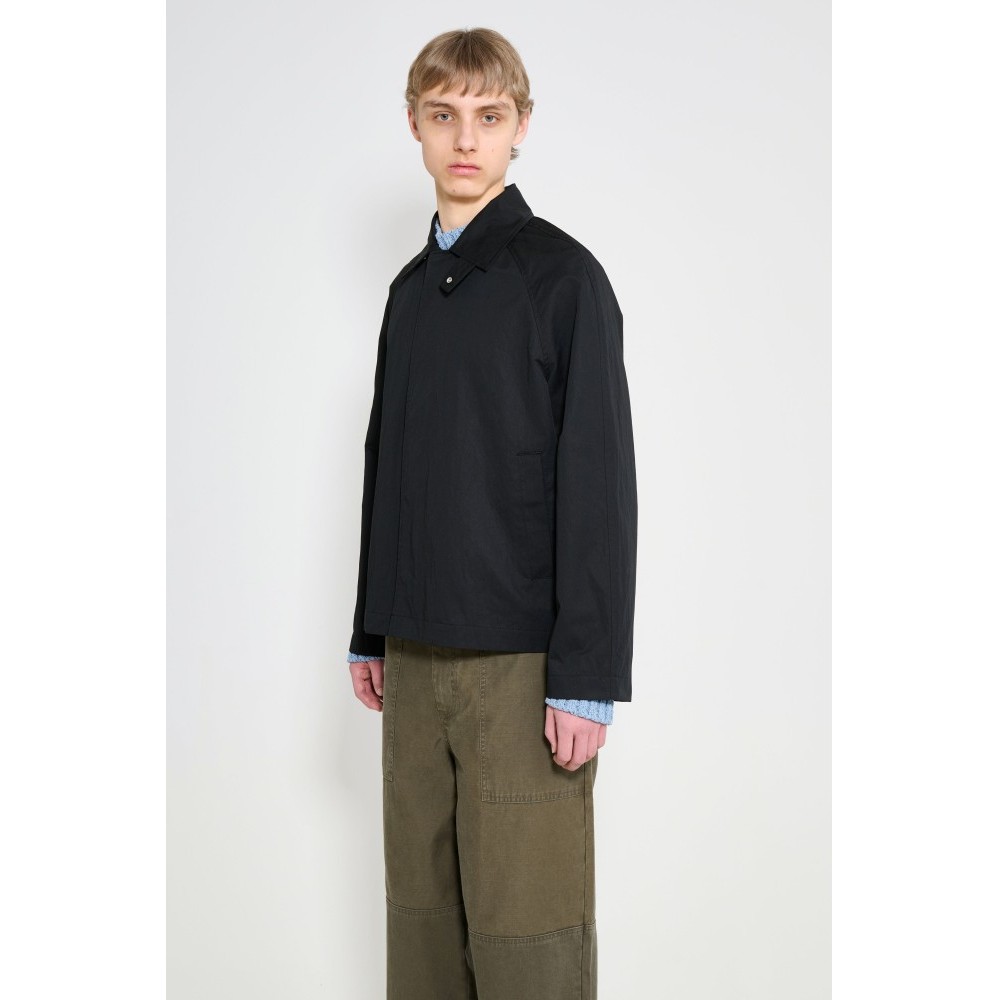 Short raglan coat from Sunflower. Constructed from double-face cotton nylon coating fabric with a smooth, structured surface. Designed with a cropped car coat length, raglan sleeves and a contrast corduroy collar. The front has a concealed push button placket, while paspel pockets sit at the sides. Fully lined in viscose.