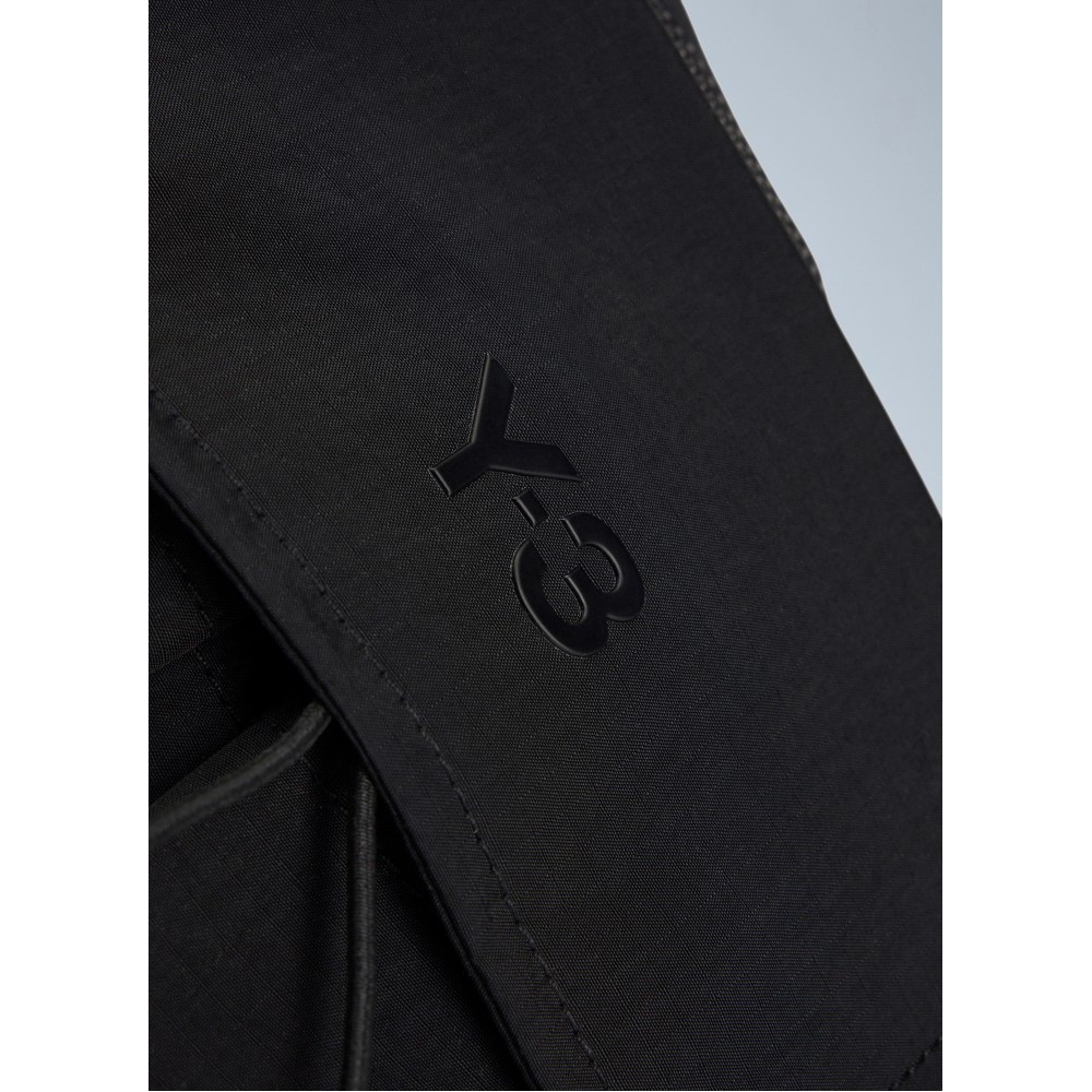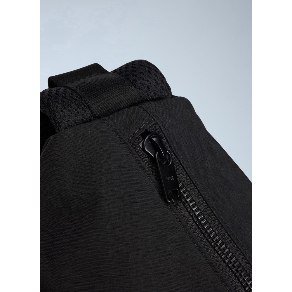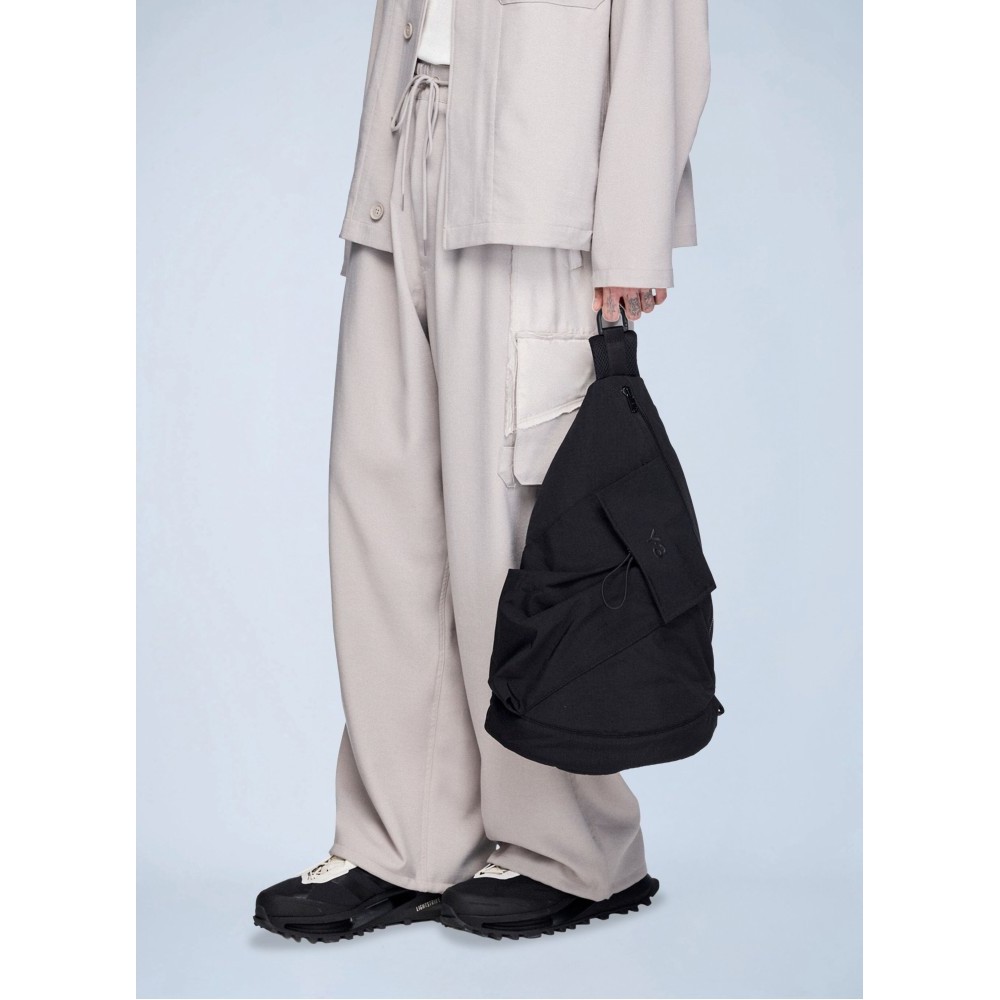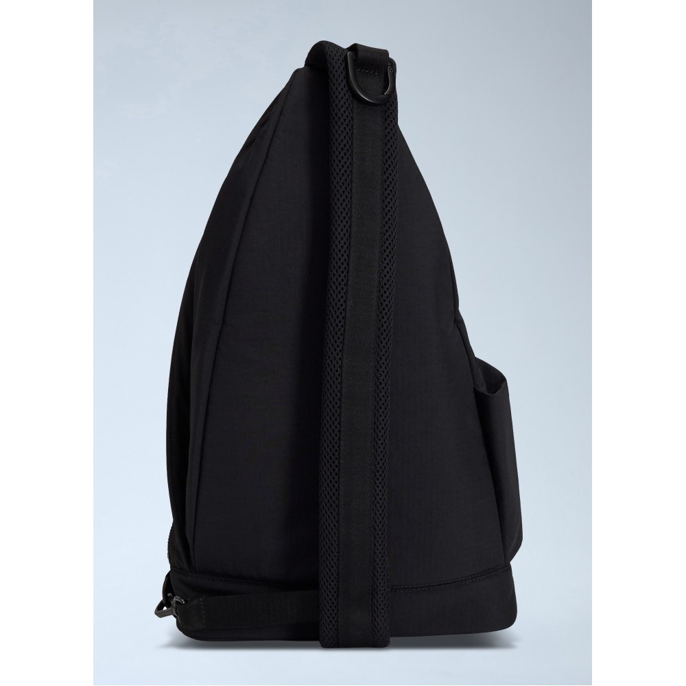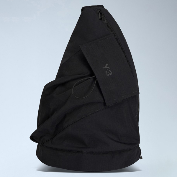 Asymmetric sling bag with zip fastening and exterior pocket.