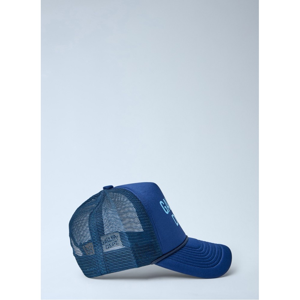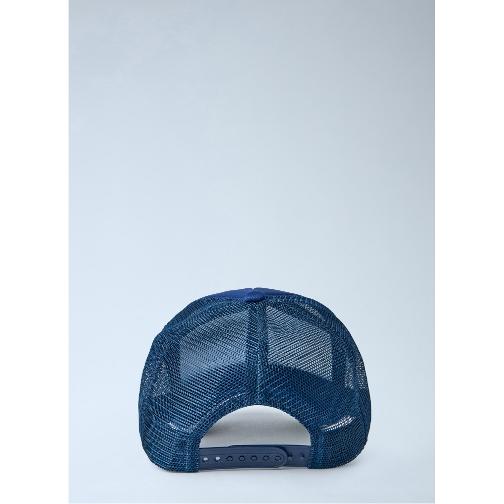 Cap with mesh panels and curved peak.
