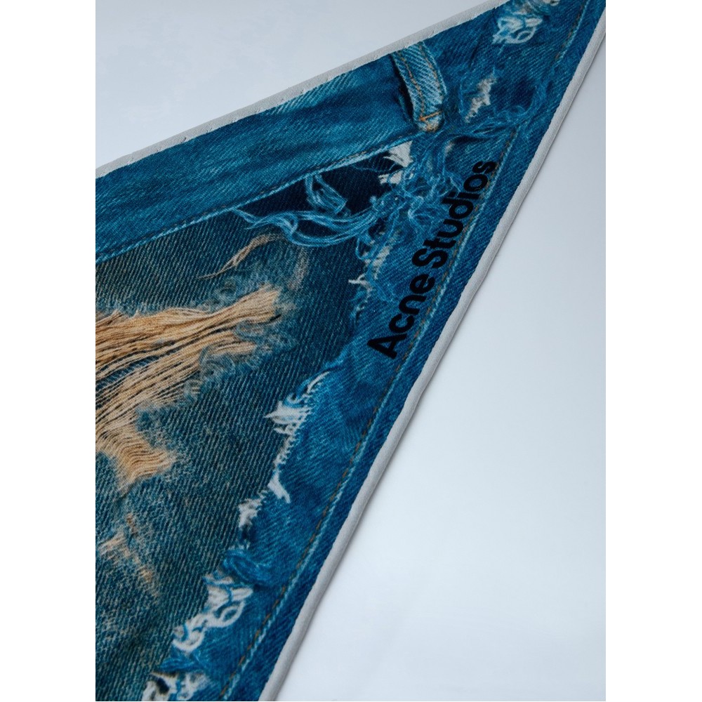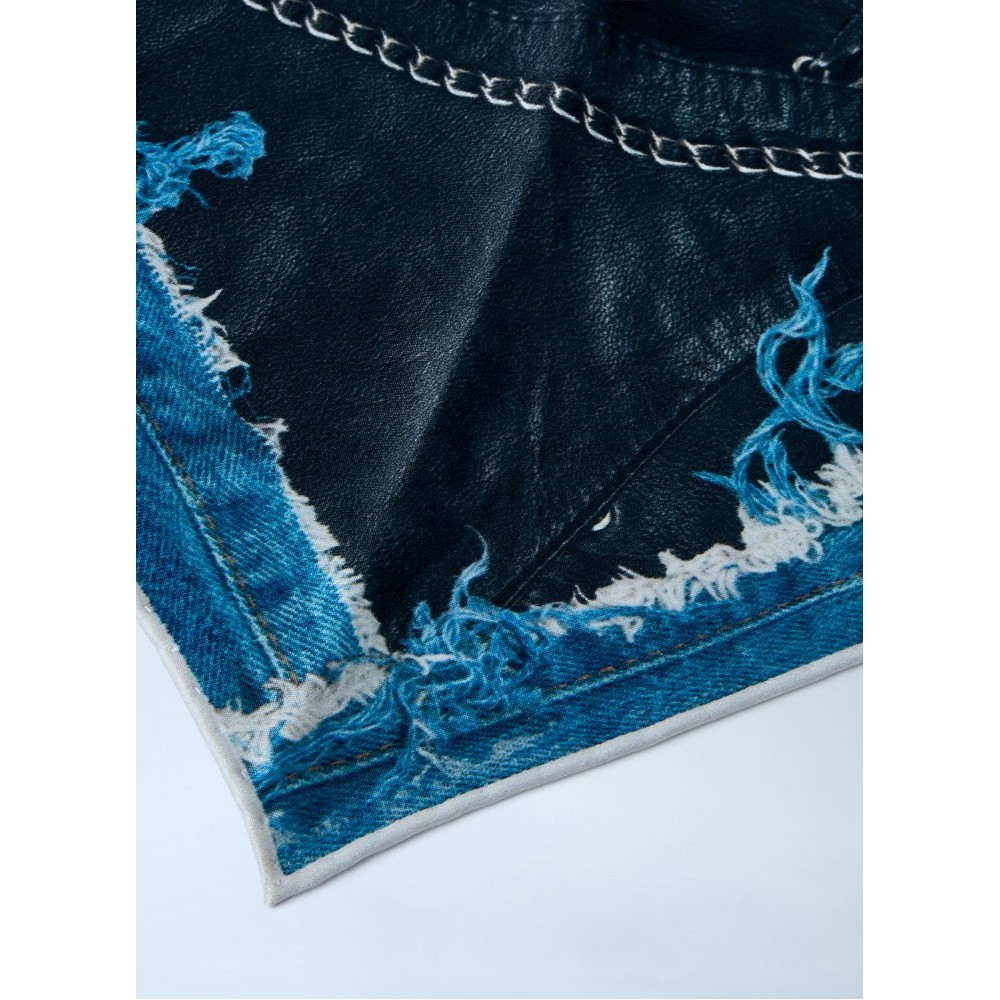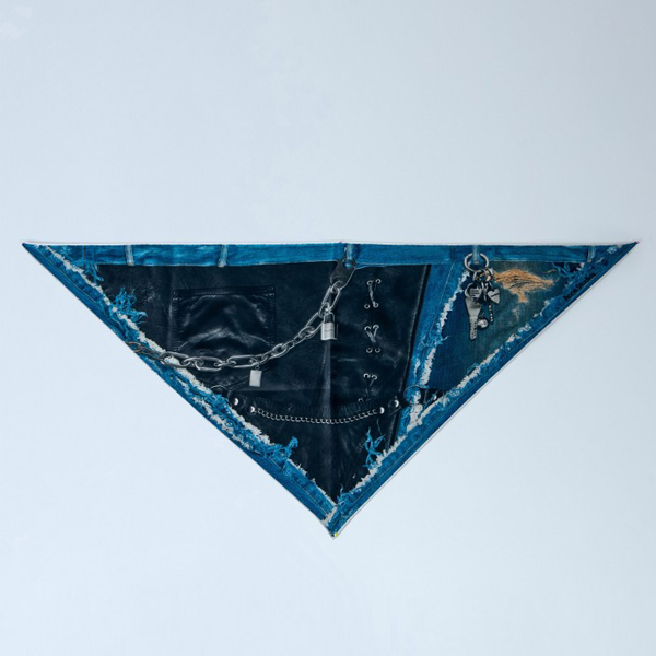 Triangular scarf in distressed denim with metal chains.