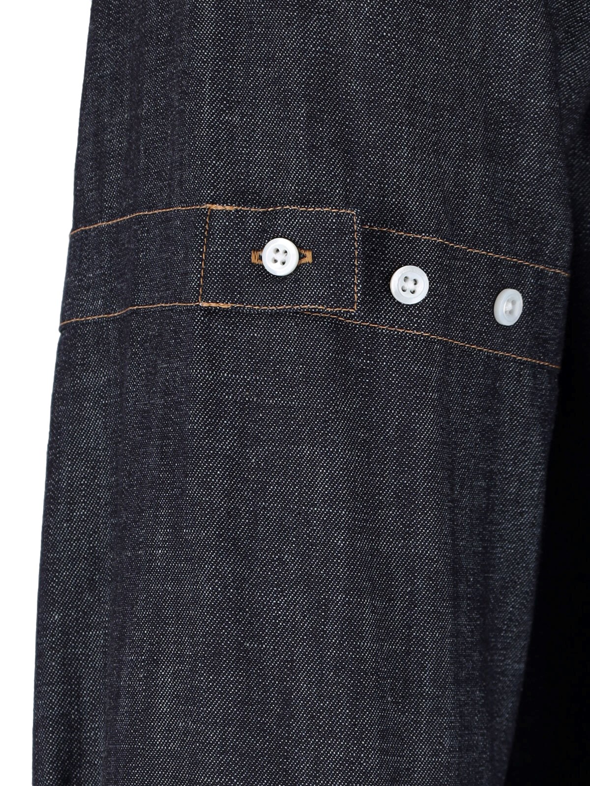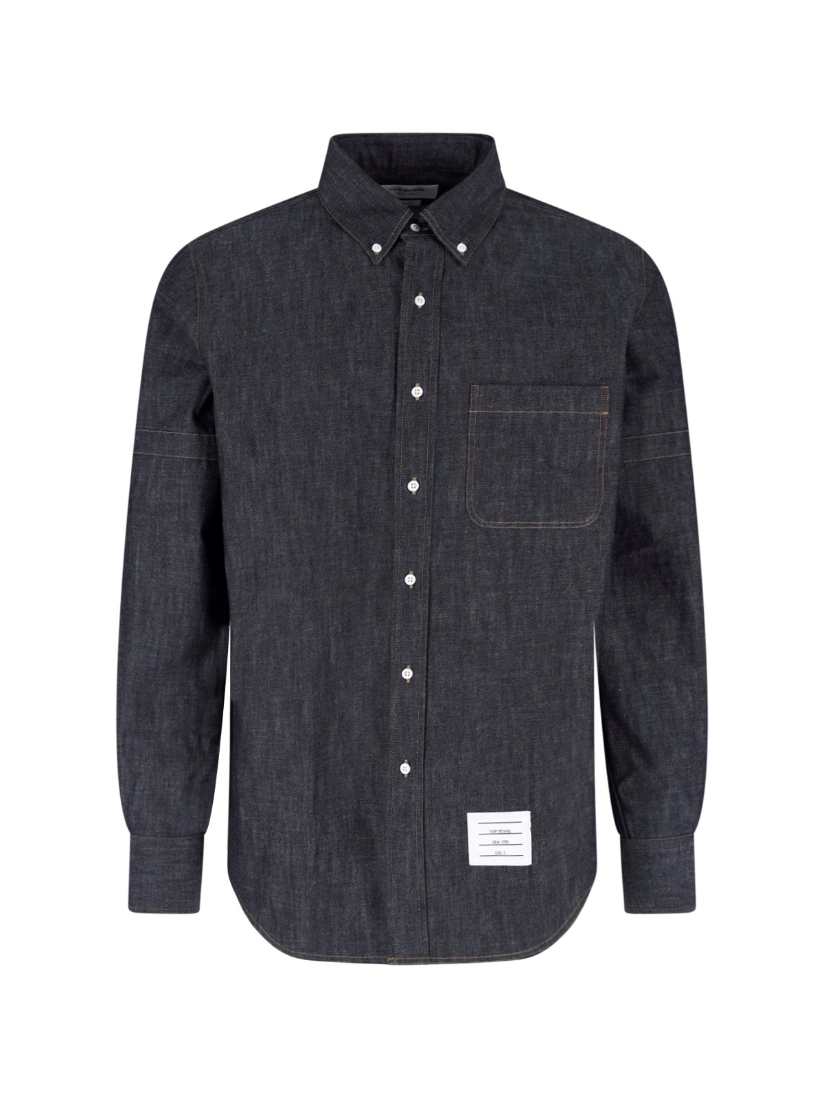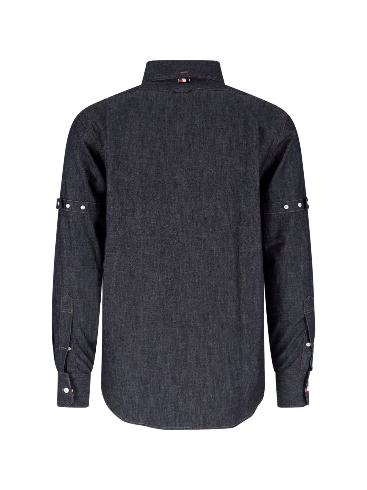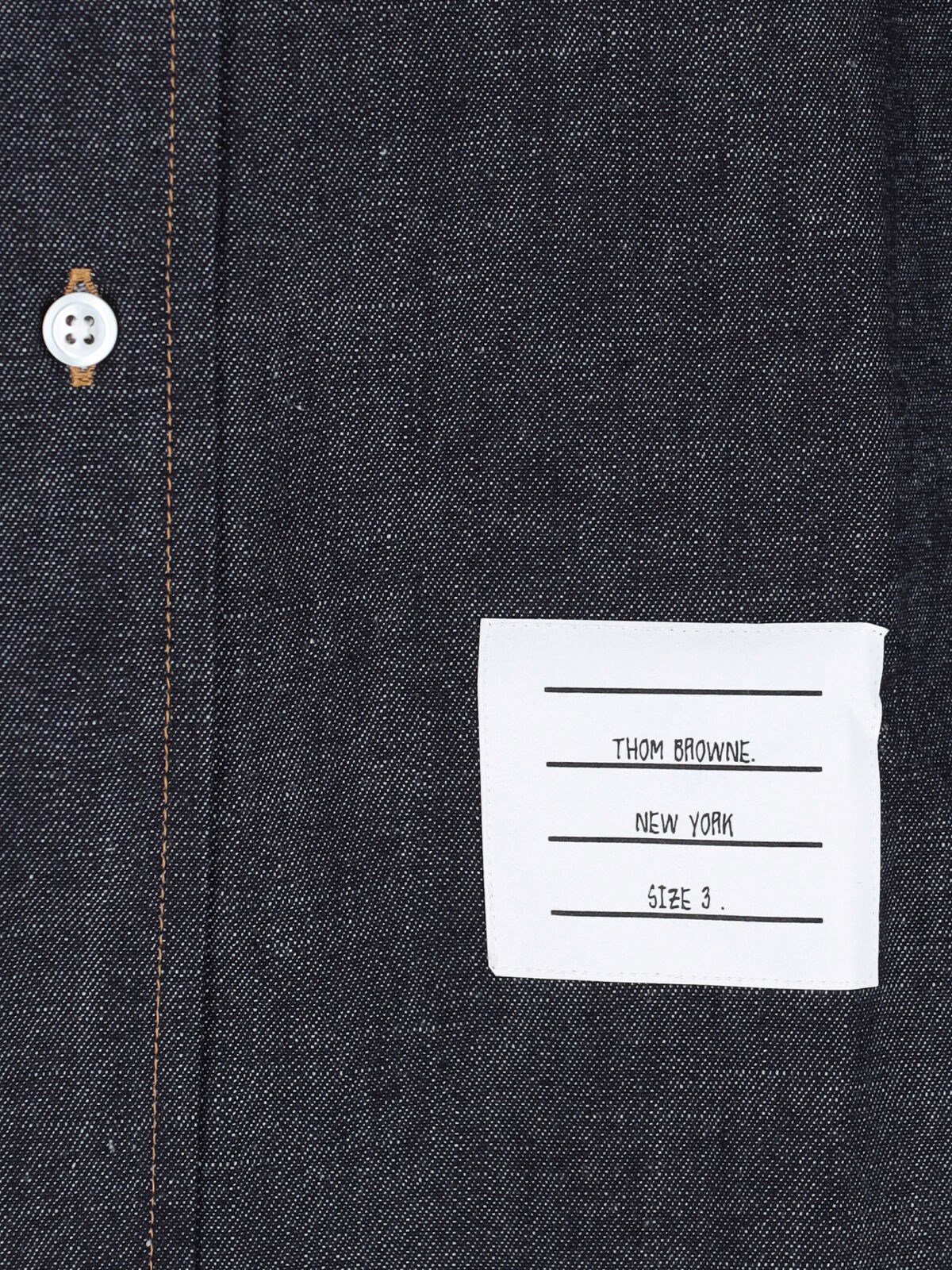 Thom Browne "Armband" dark blue cotton denim shirt with button-down collar, chest patch pocket, button closure, logo label on the front, button cuffs, multicolor striped loop detail on the back, button detail sleeves at the back, curved hem.