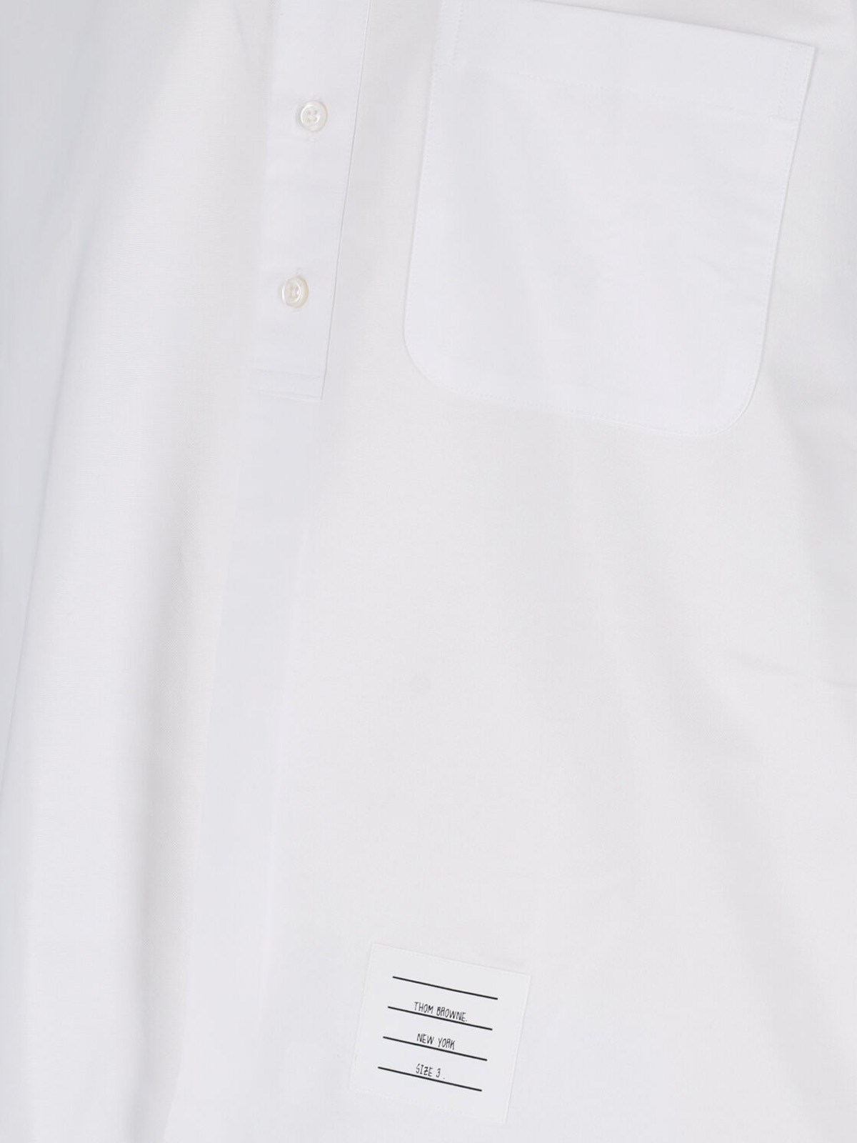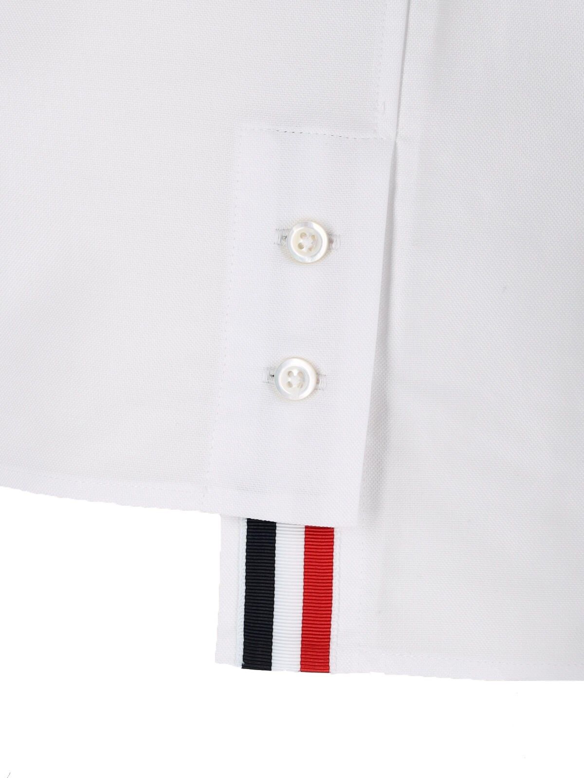Thom Browne 4-Bar oxford shirt in white cotton with classic collar, button closure, patch chest pocket, blue 4-Bar detail on the sleeve, logo label on the front, button cuffs, multicolor striped loop detail on the back, straight hem.