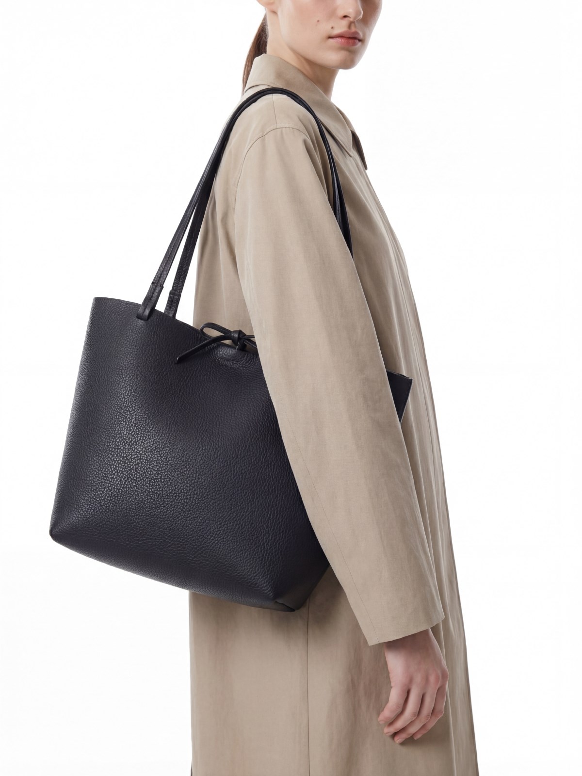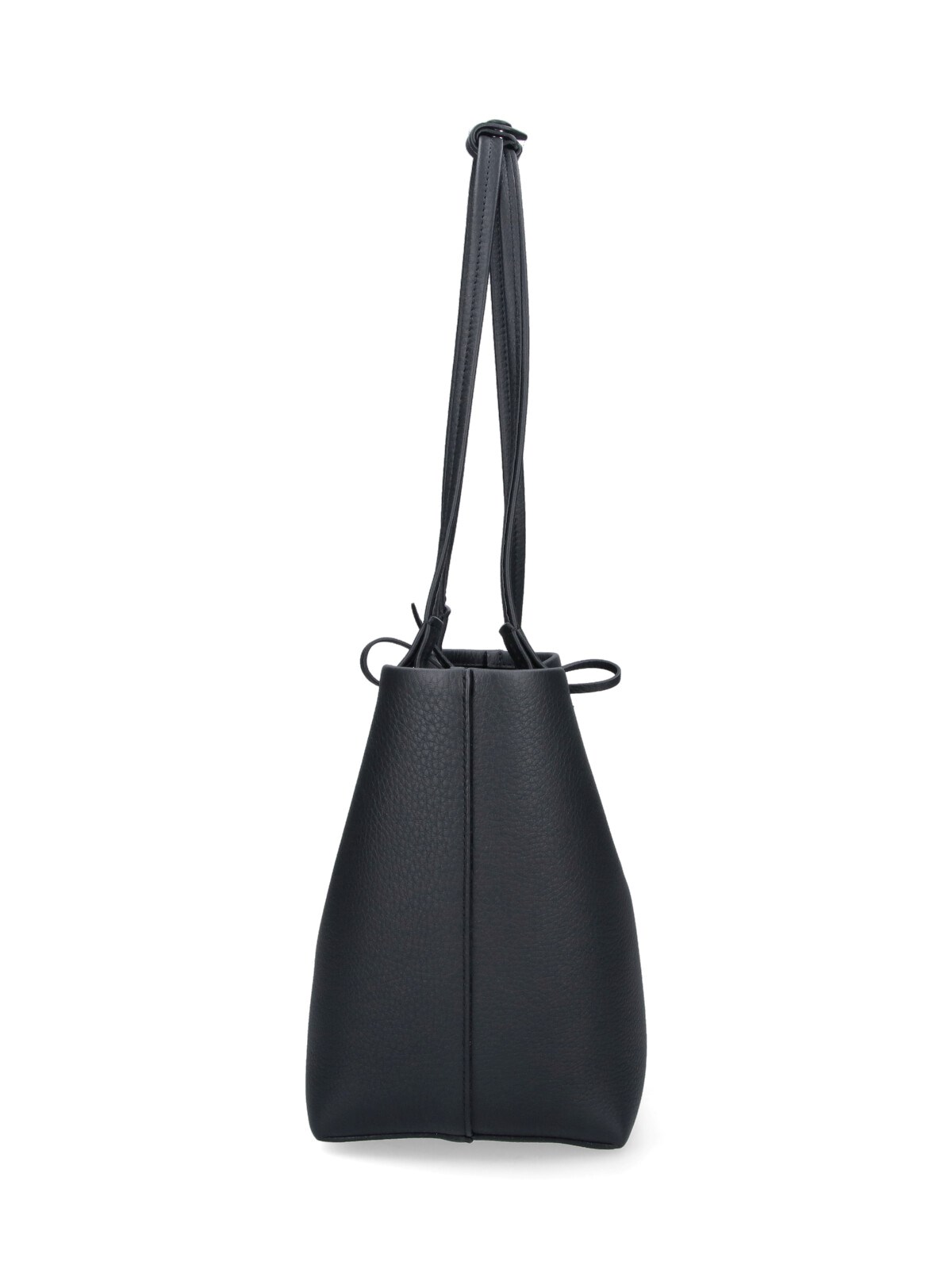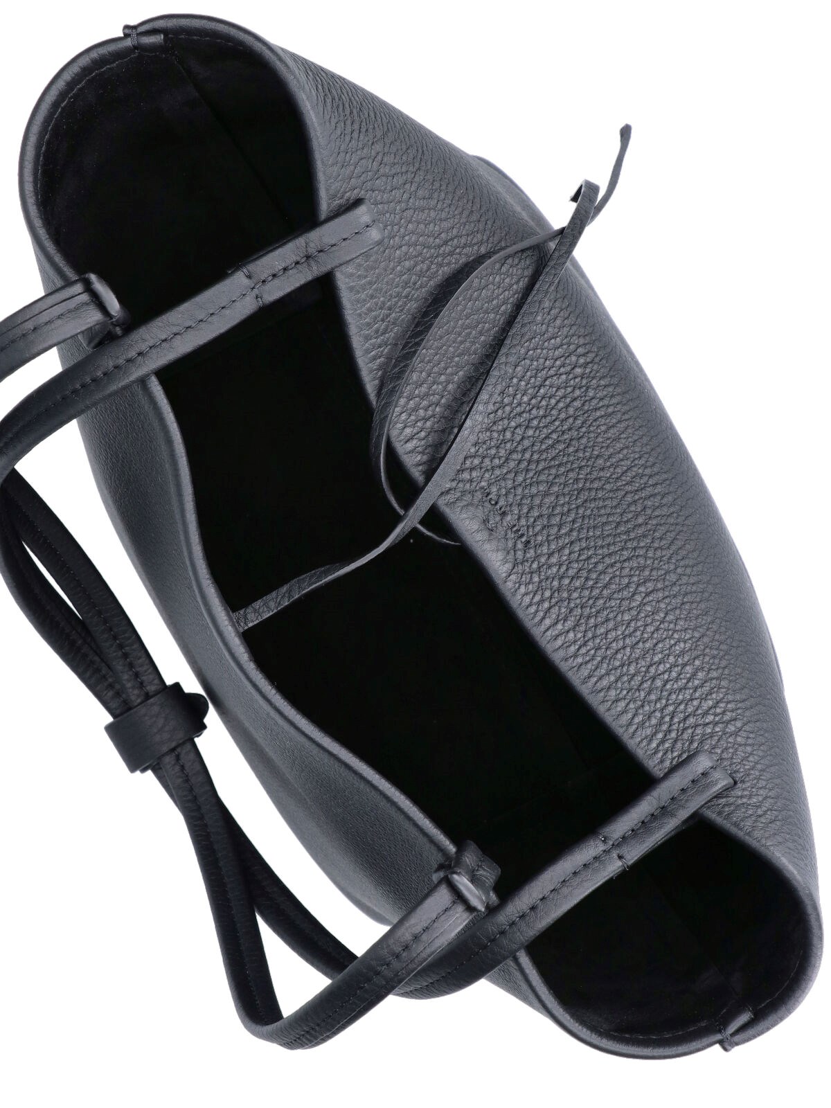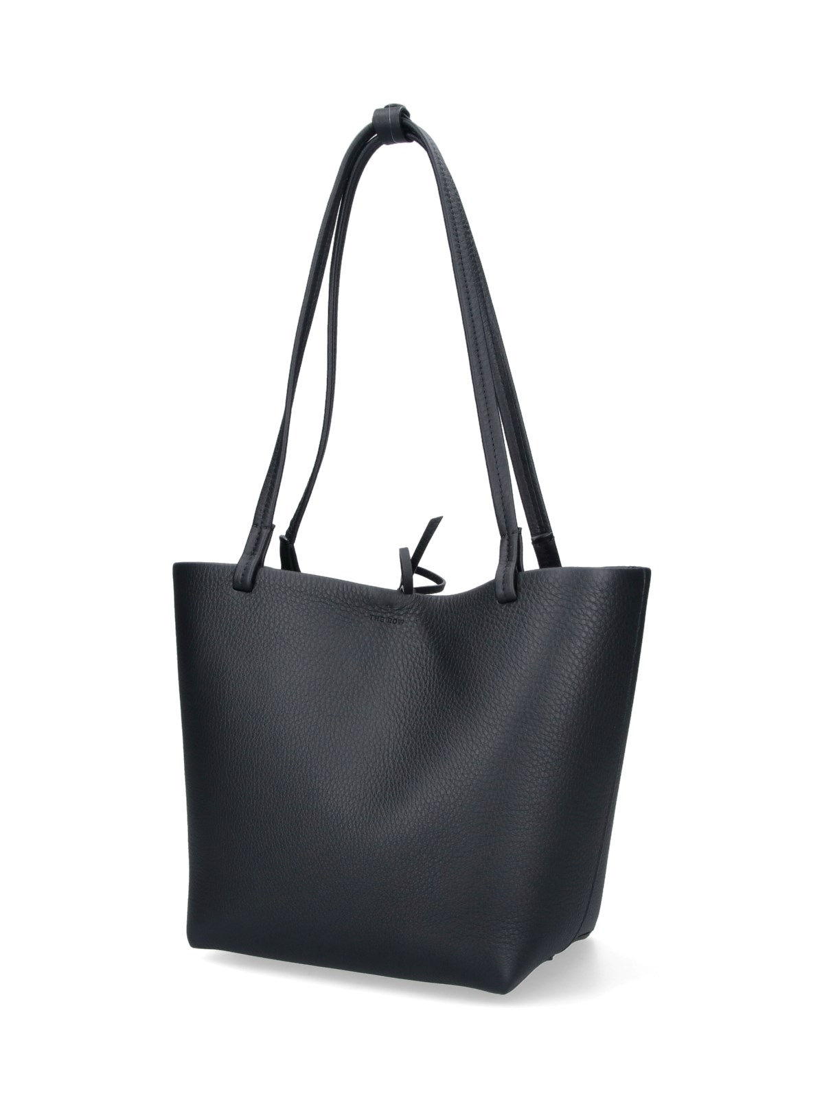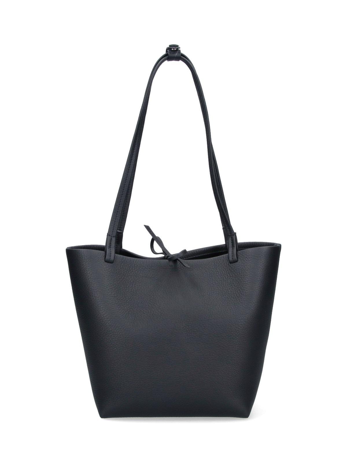 The Row "Park" medium tote bag in black calf leather with two top button handles, lace-up closure, tonal embossed logo on the front, main inner compartment.