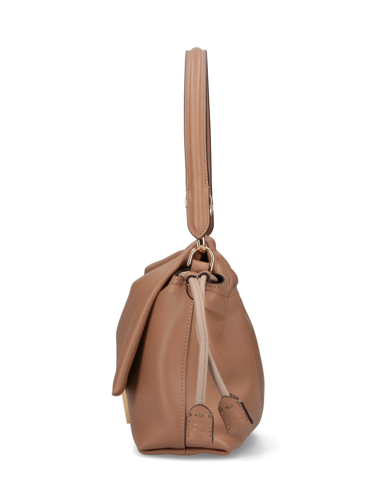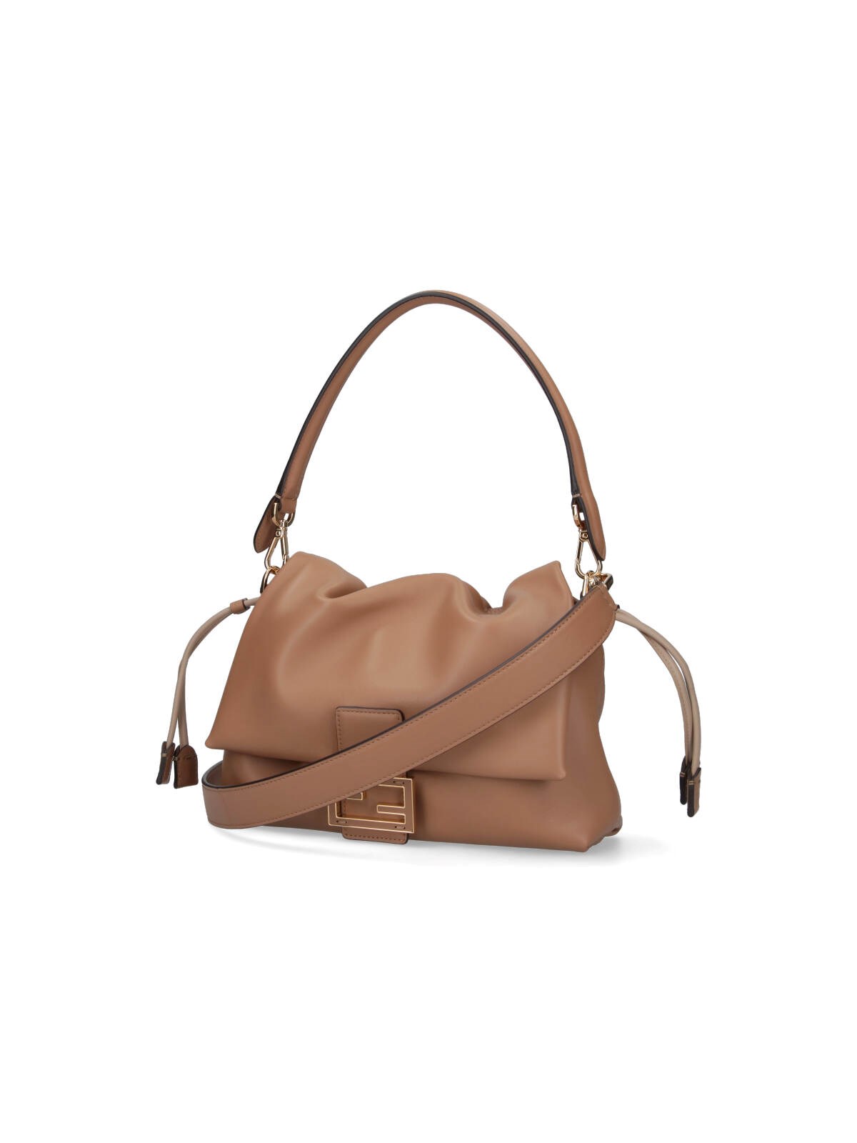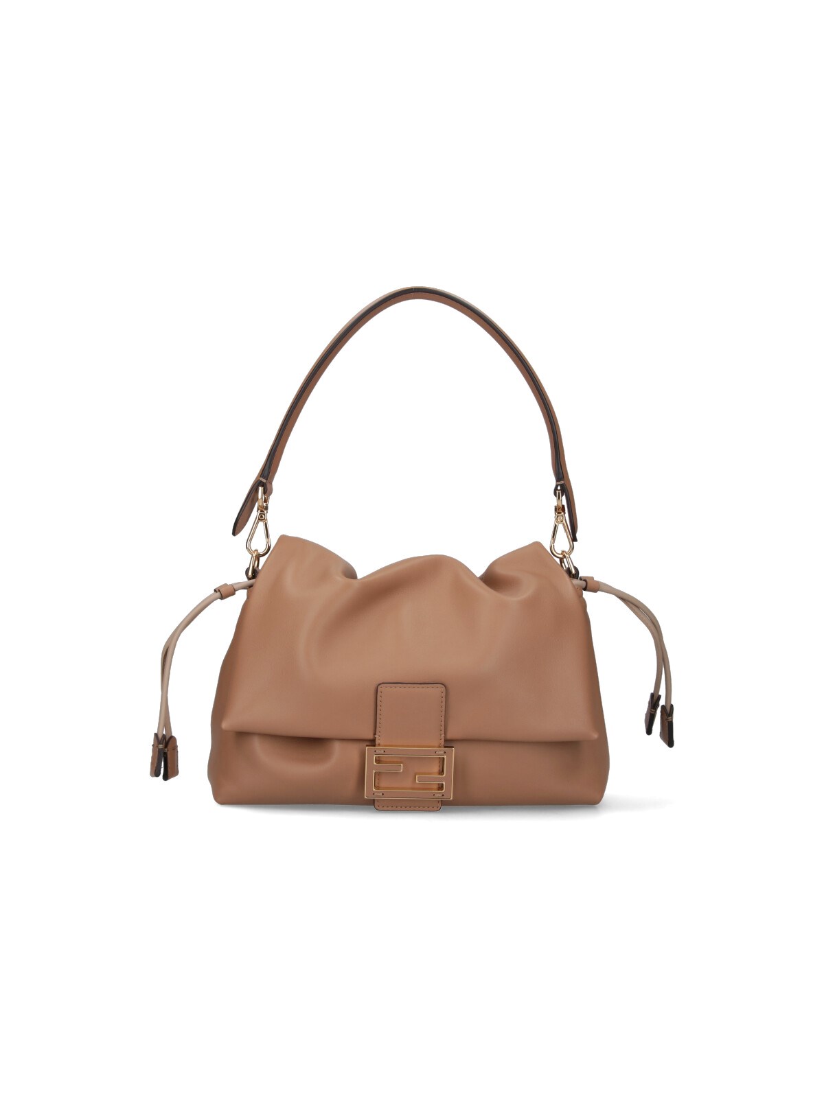 Fendi medium 'Mamma Baguette' shoulder bag in beige lamb nappa leather with removable handle, removable shoulder strap, flap closure, magnetic strap and drawstring, gold metal 'FF' logo buckle detail on the front, a single inner compartment.
