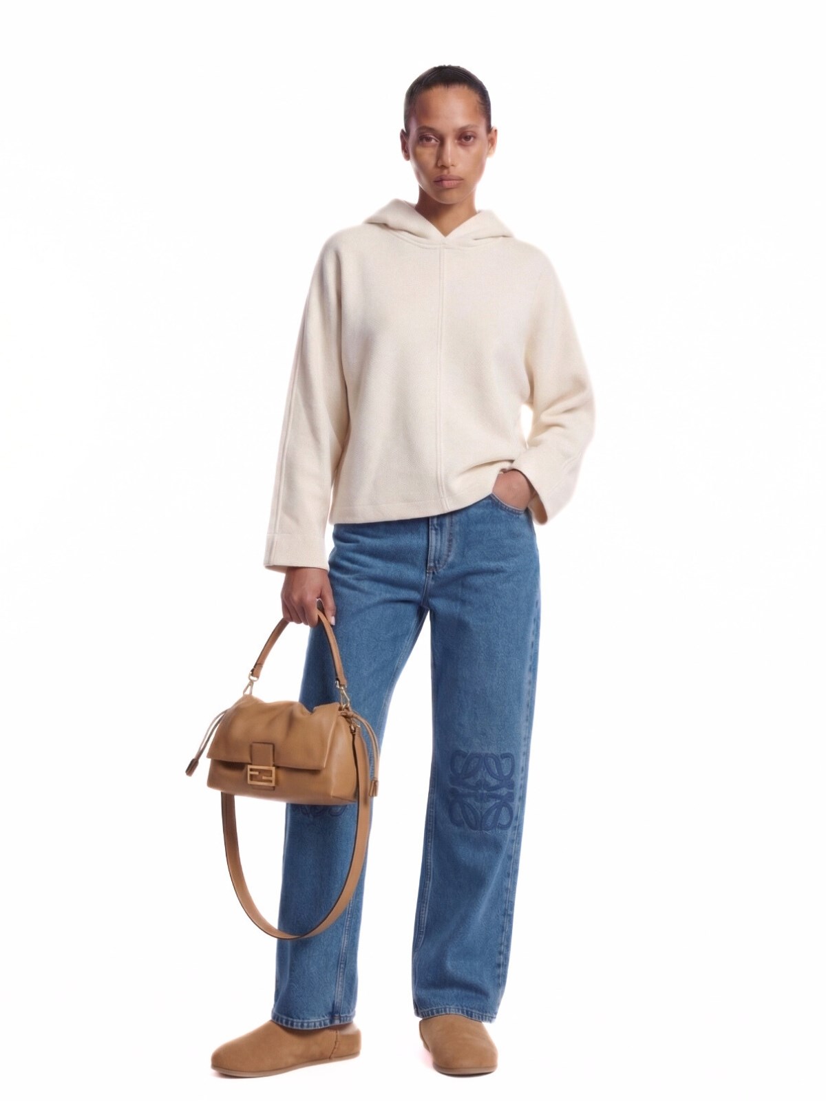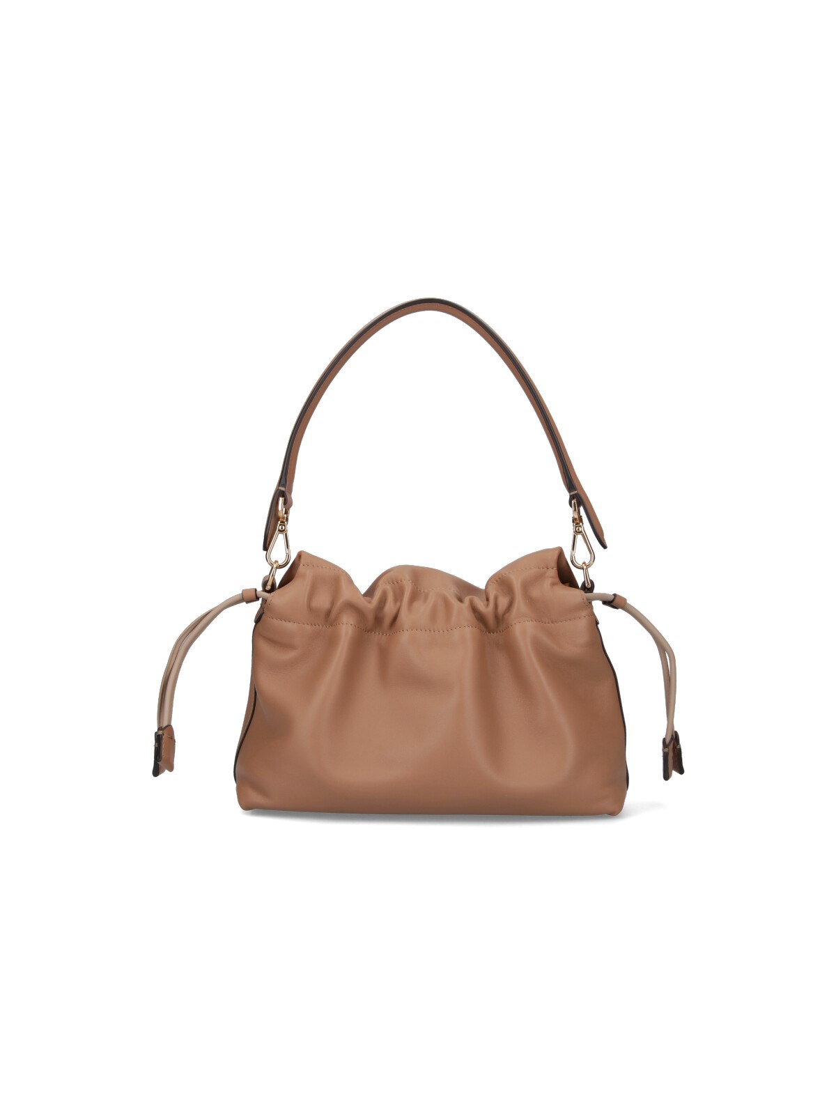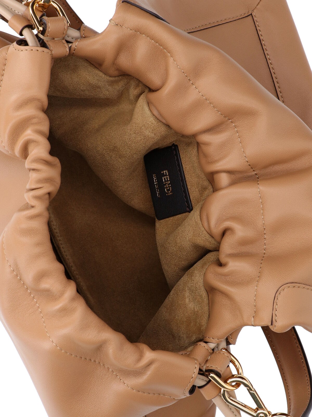 Fendi medium 'Mamma Baguette' shoulder bag in beige lamb nappa leather with removable handle, removable shoulder strap, flap closure, magnetic strap and drawstring, gold metal 'FF' logo buckle detail on the front, a single inner compartment.