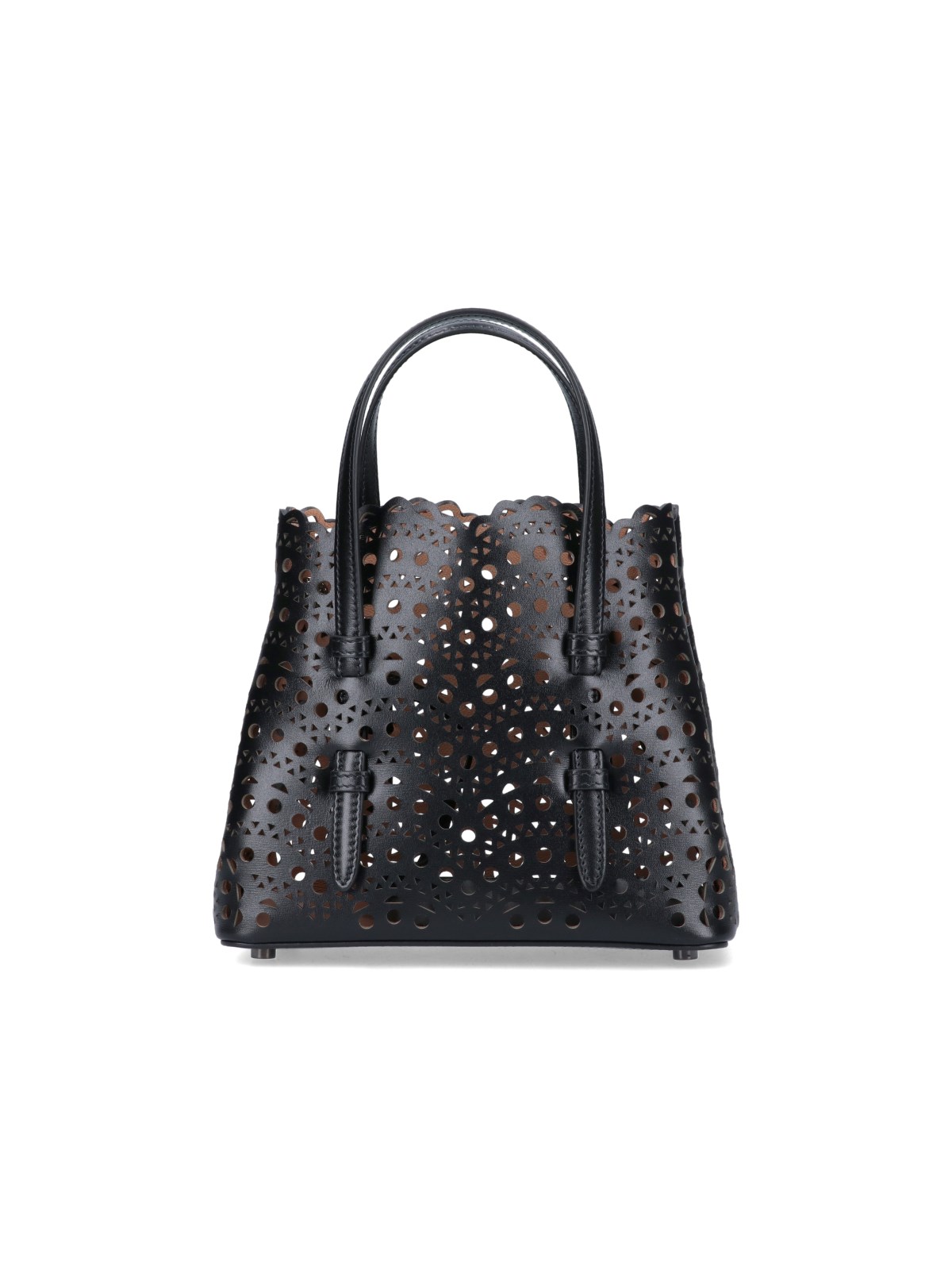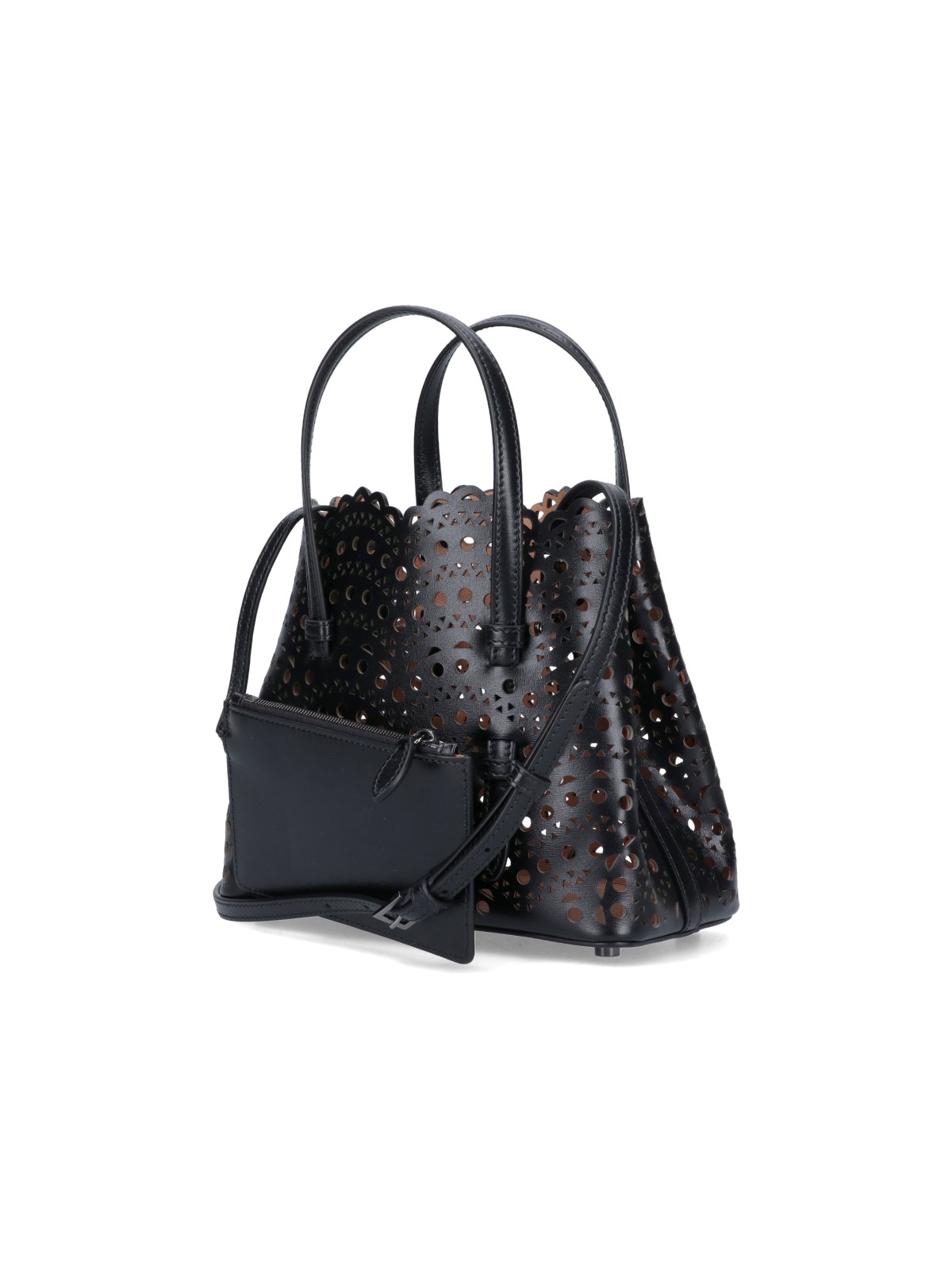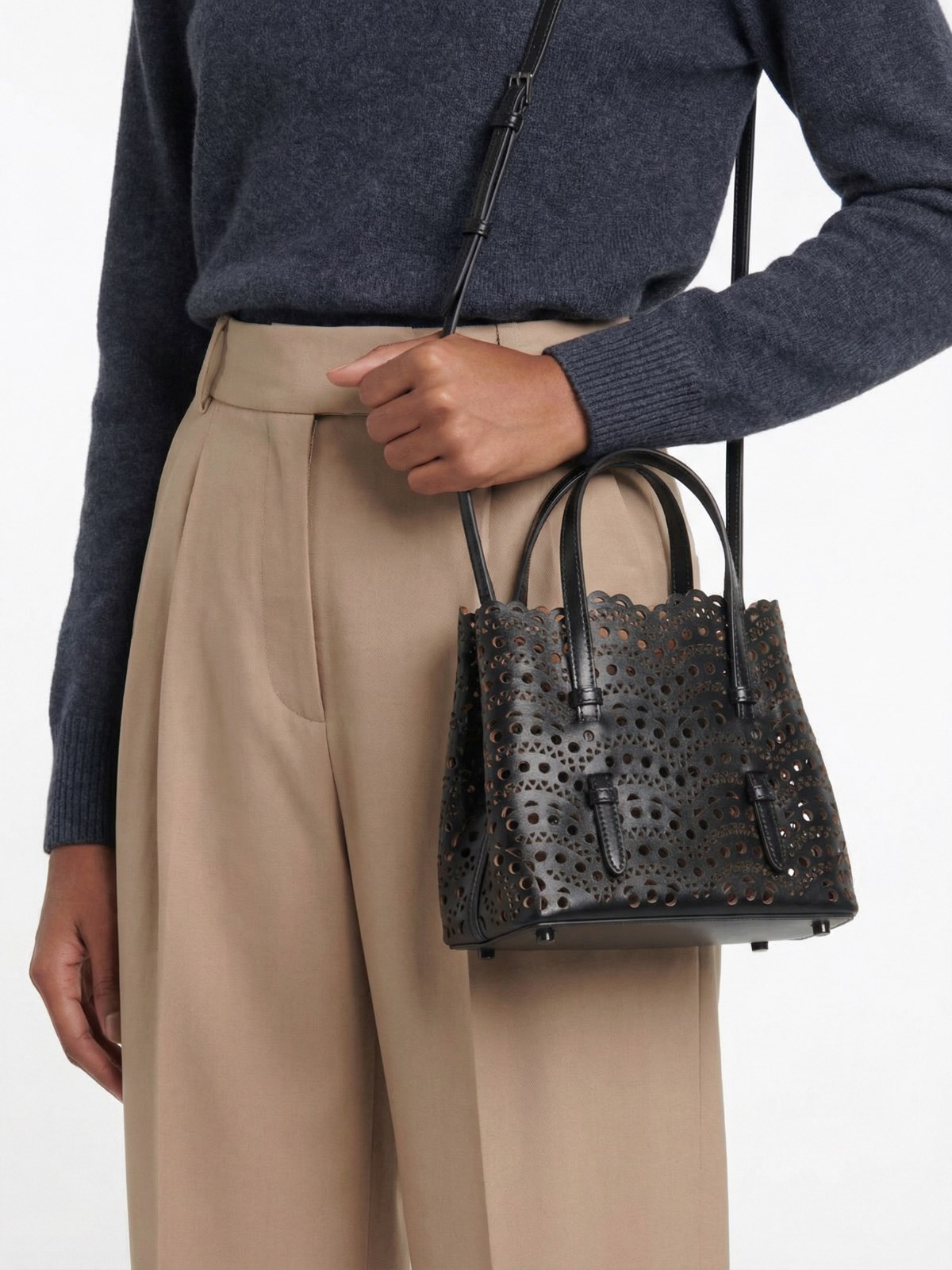 Alaia "Mina 20" Hand Bag, black perforated leather, two top handles, adjustable and removable shoulder strap, side buttons, one interior pouch zipper closure, one main interior compartment.