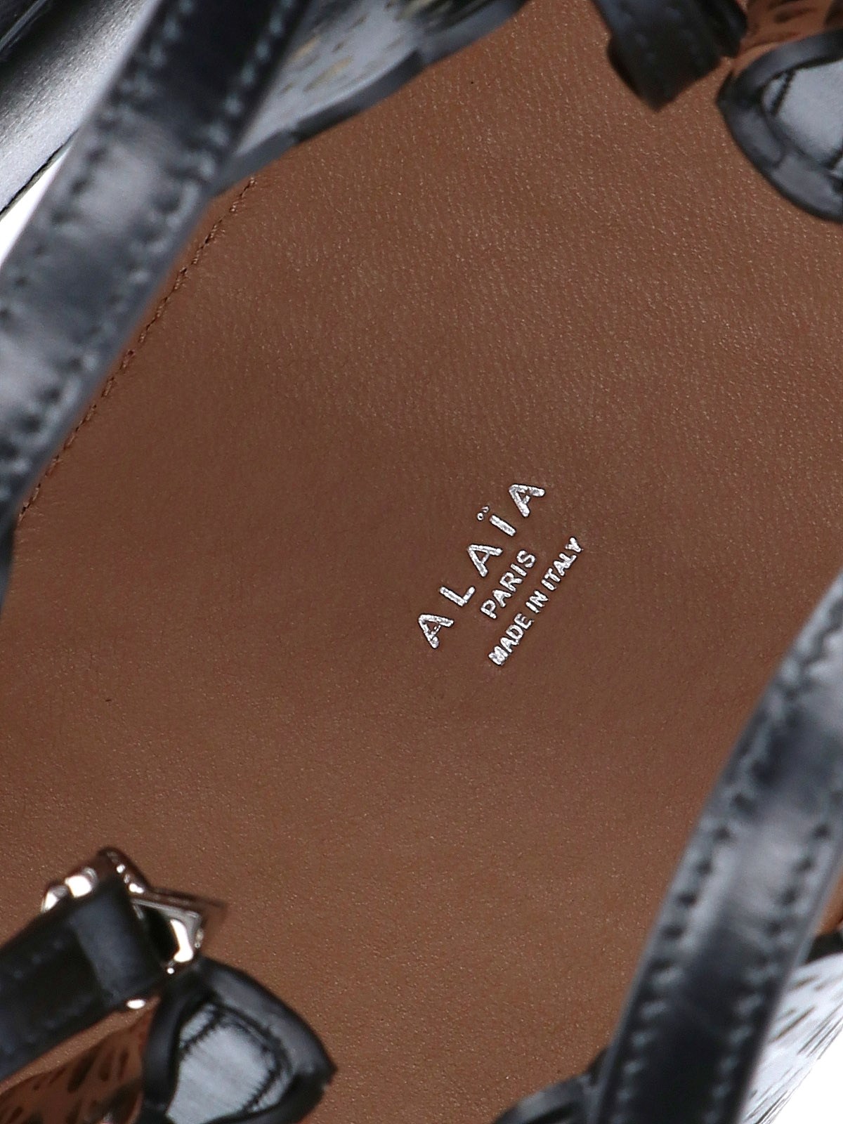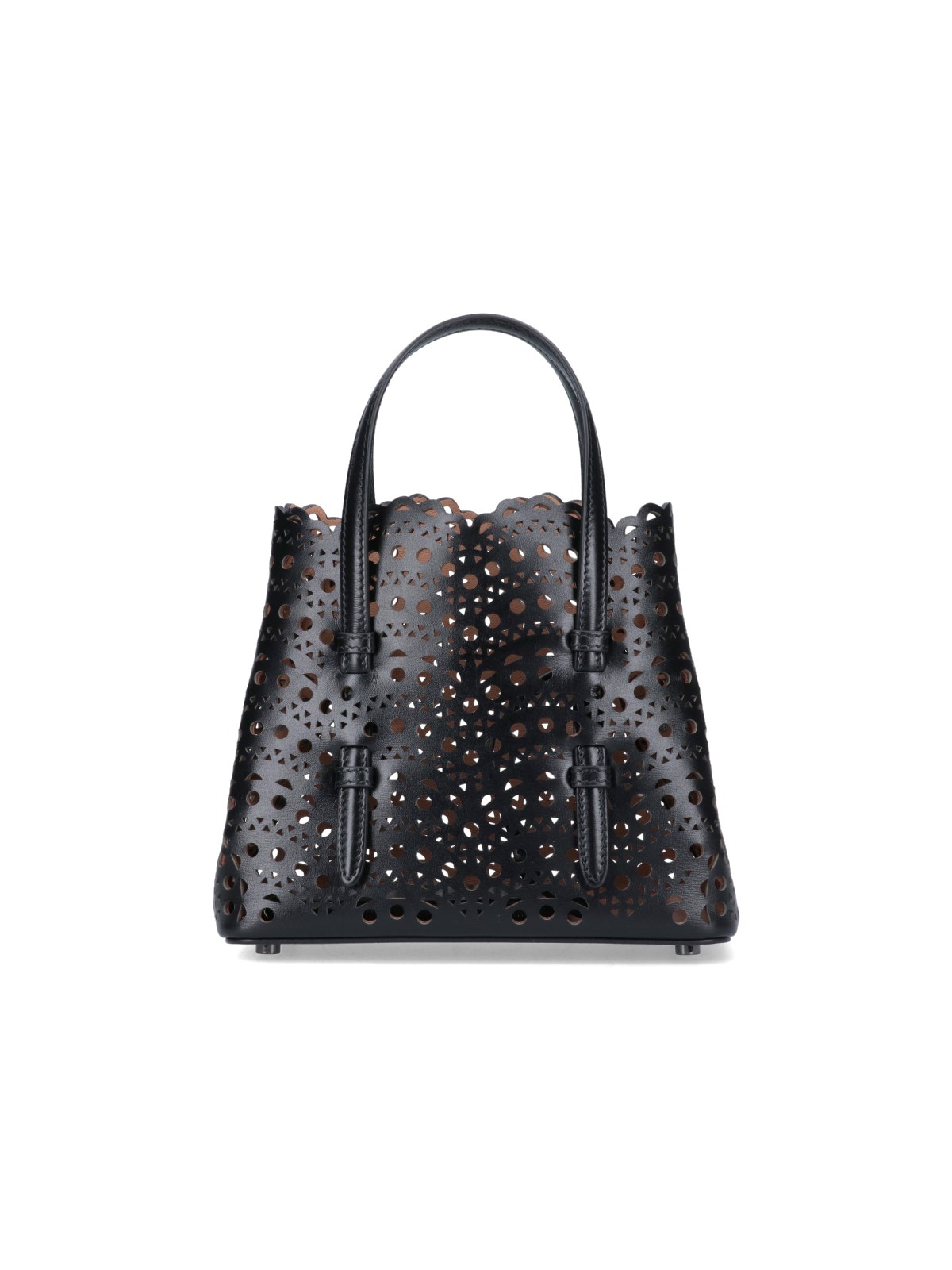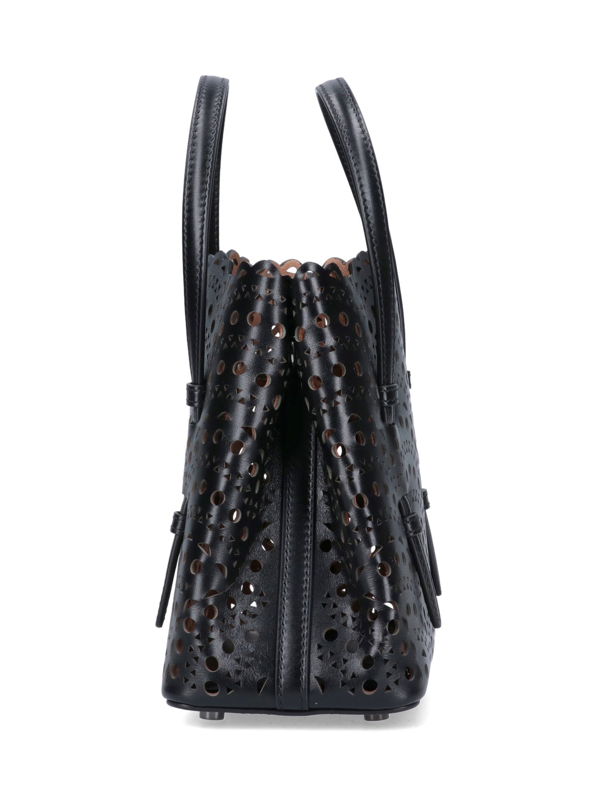 Alaia "Mina 20" Hand Bag, black perforated leather, two top handles, adjustable and removable shoulder strap, side buttons, one interior pouch zipper closure, one main interior compartment.