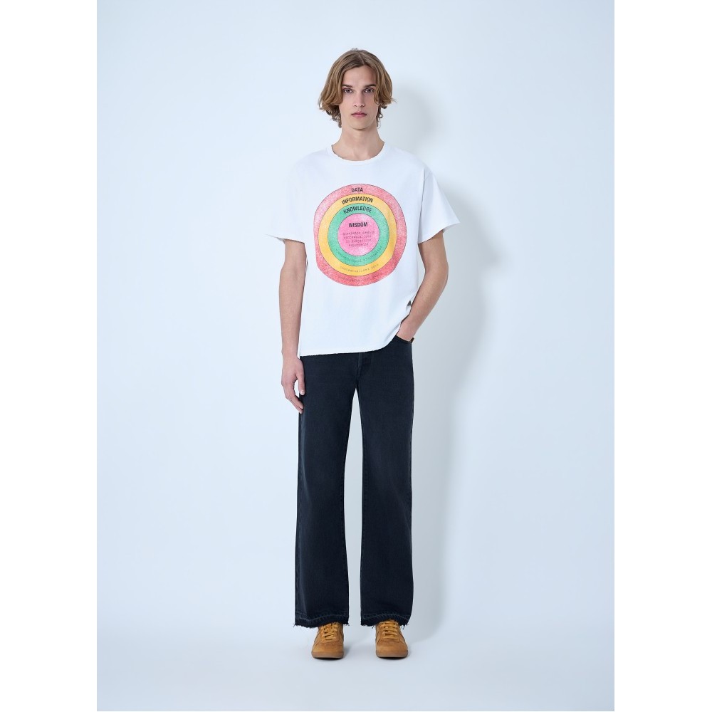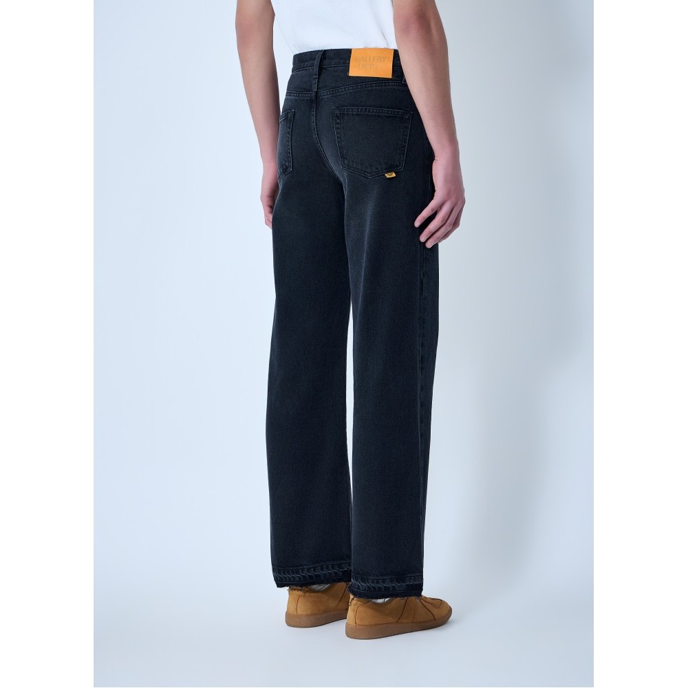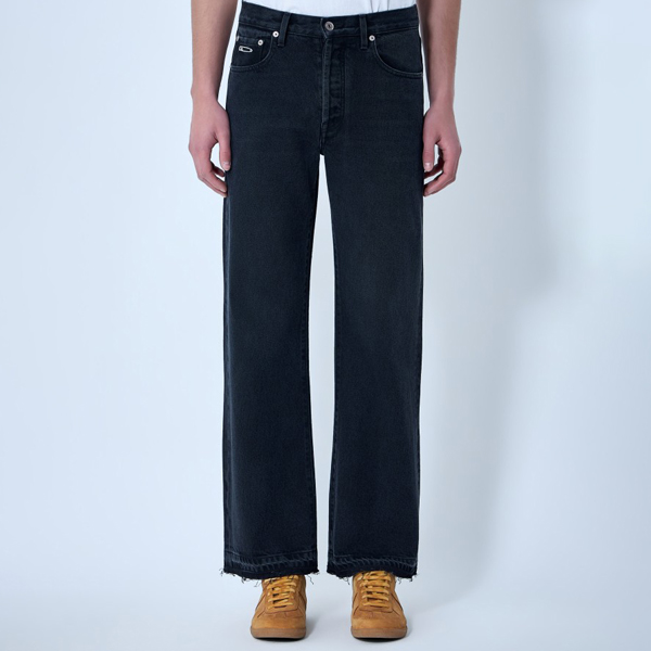 Five-pocket wide-leg jeans with raw-edge hems.