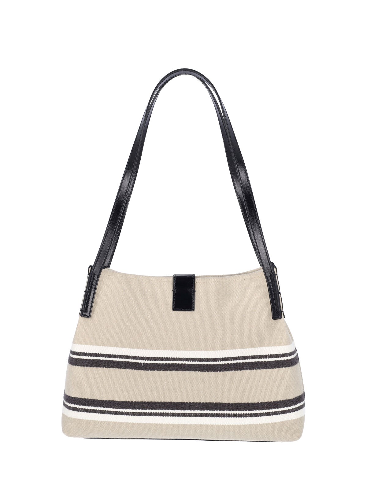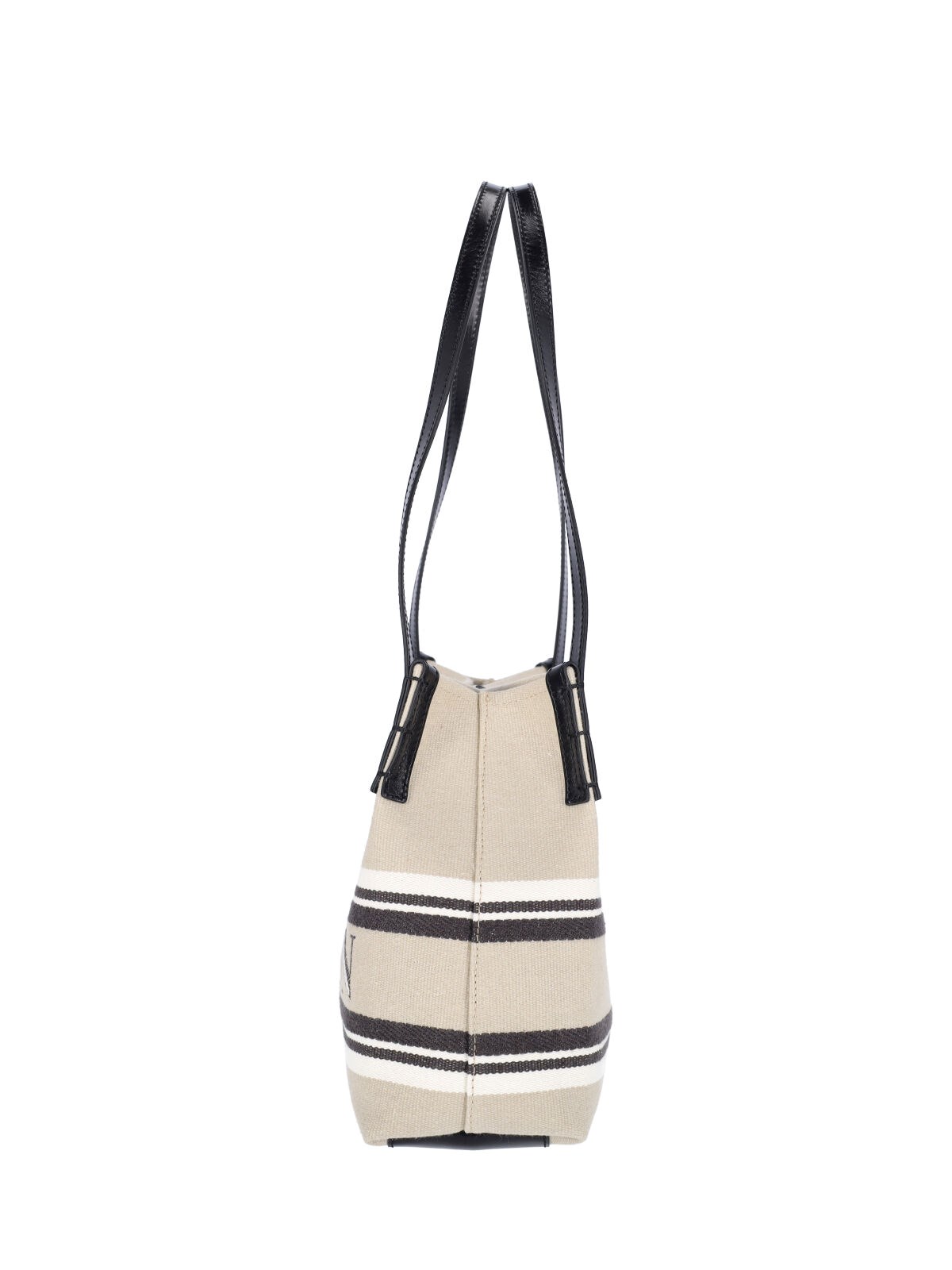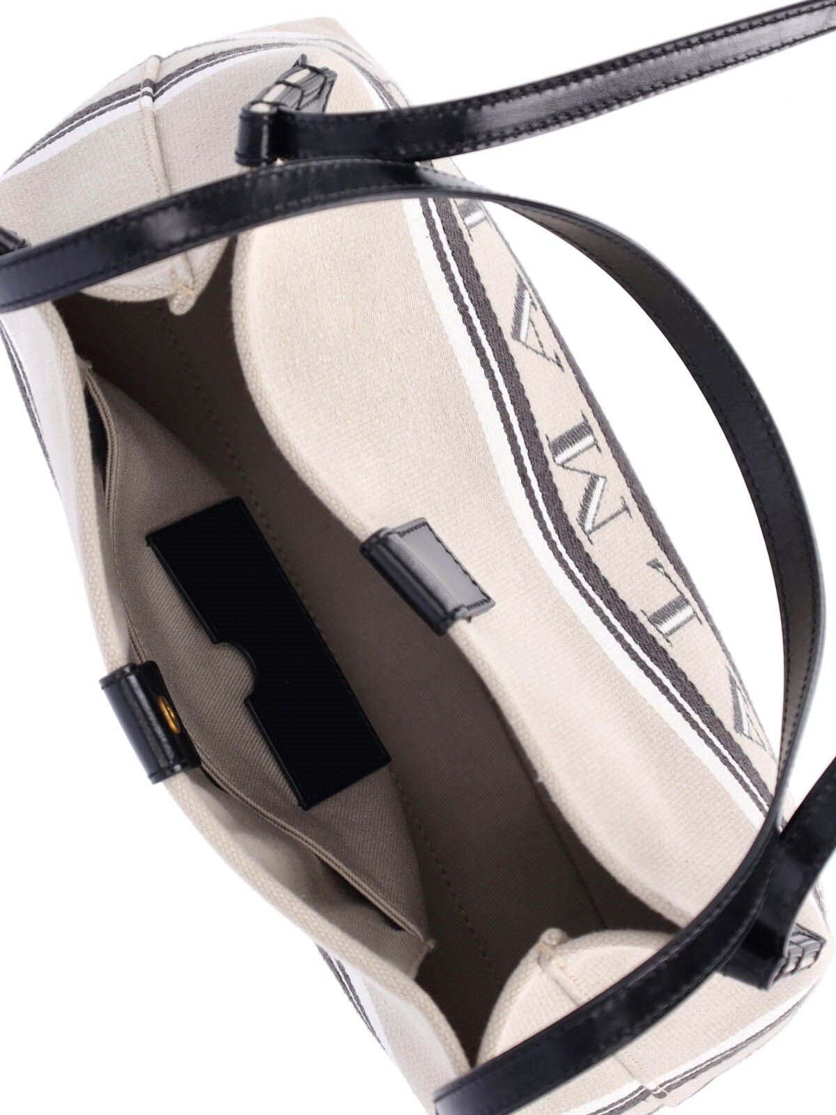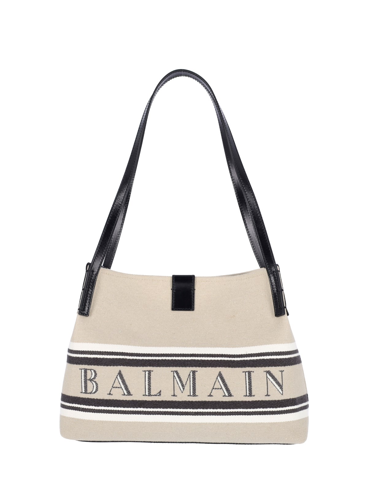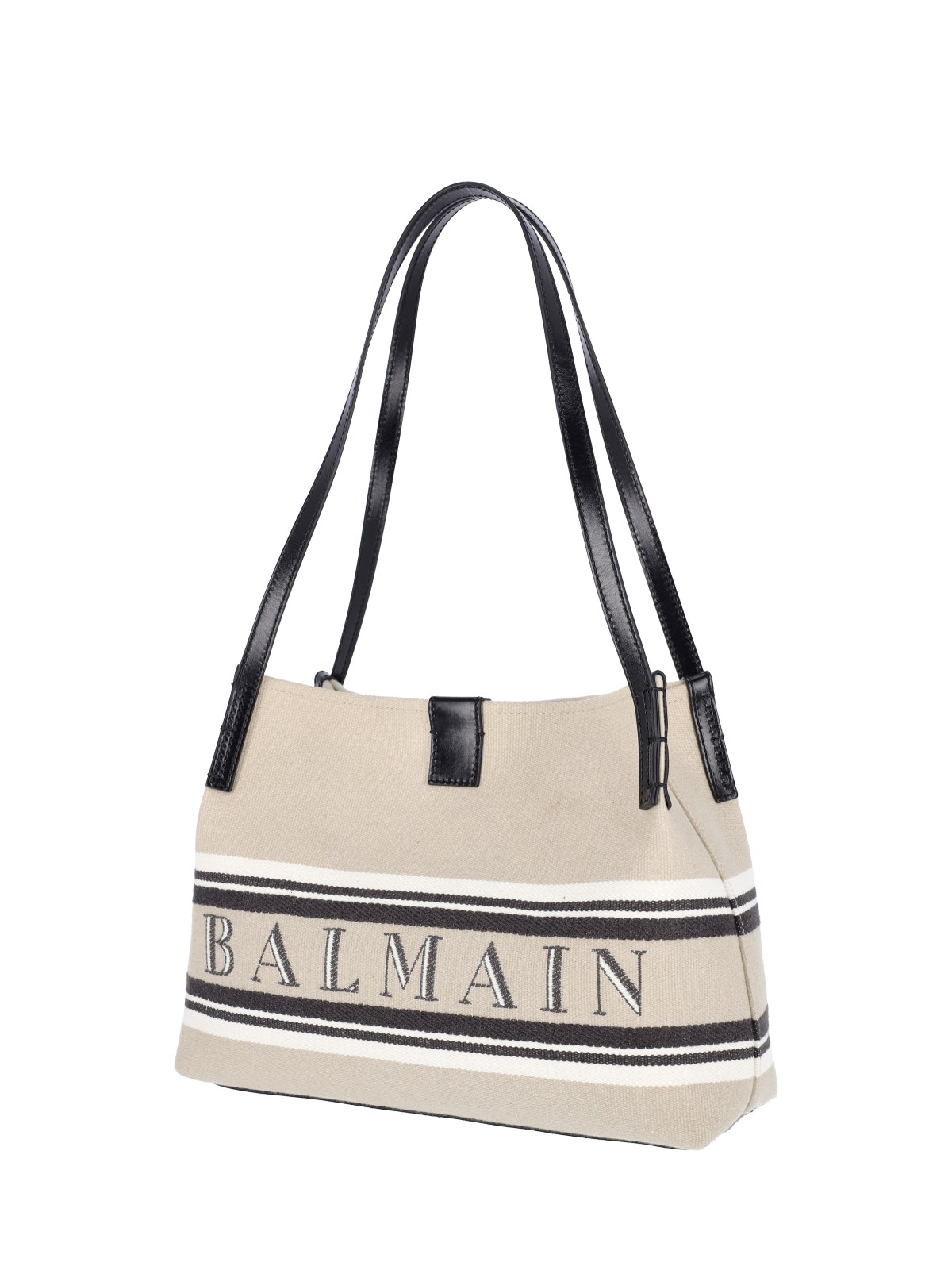 Balmain 'Release' small tote bag in white canvas, two black leather top handles, snap button closure, front logo detail, main inner compartment.