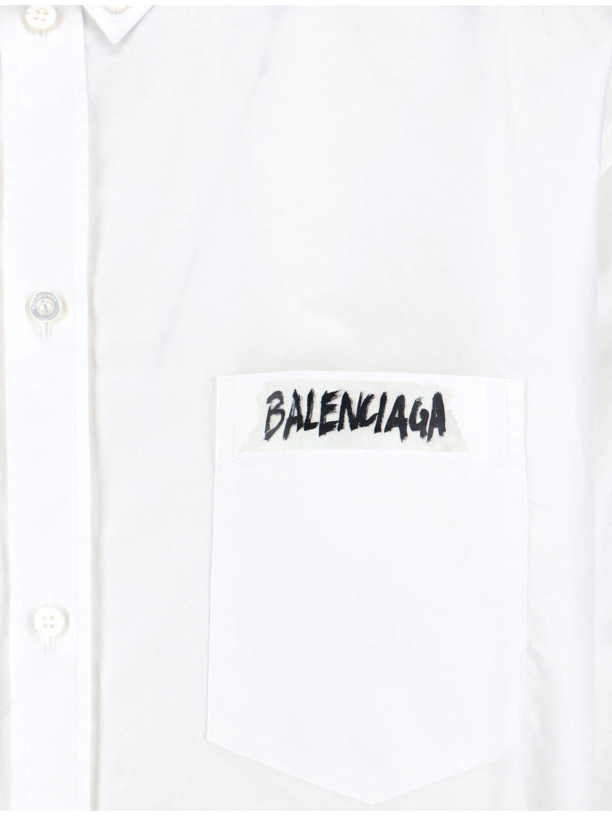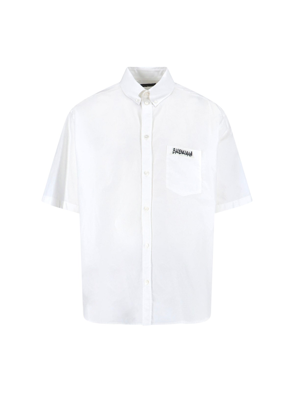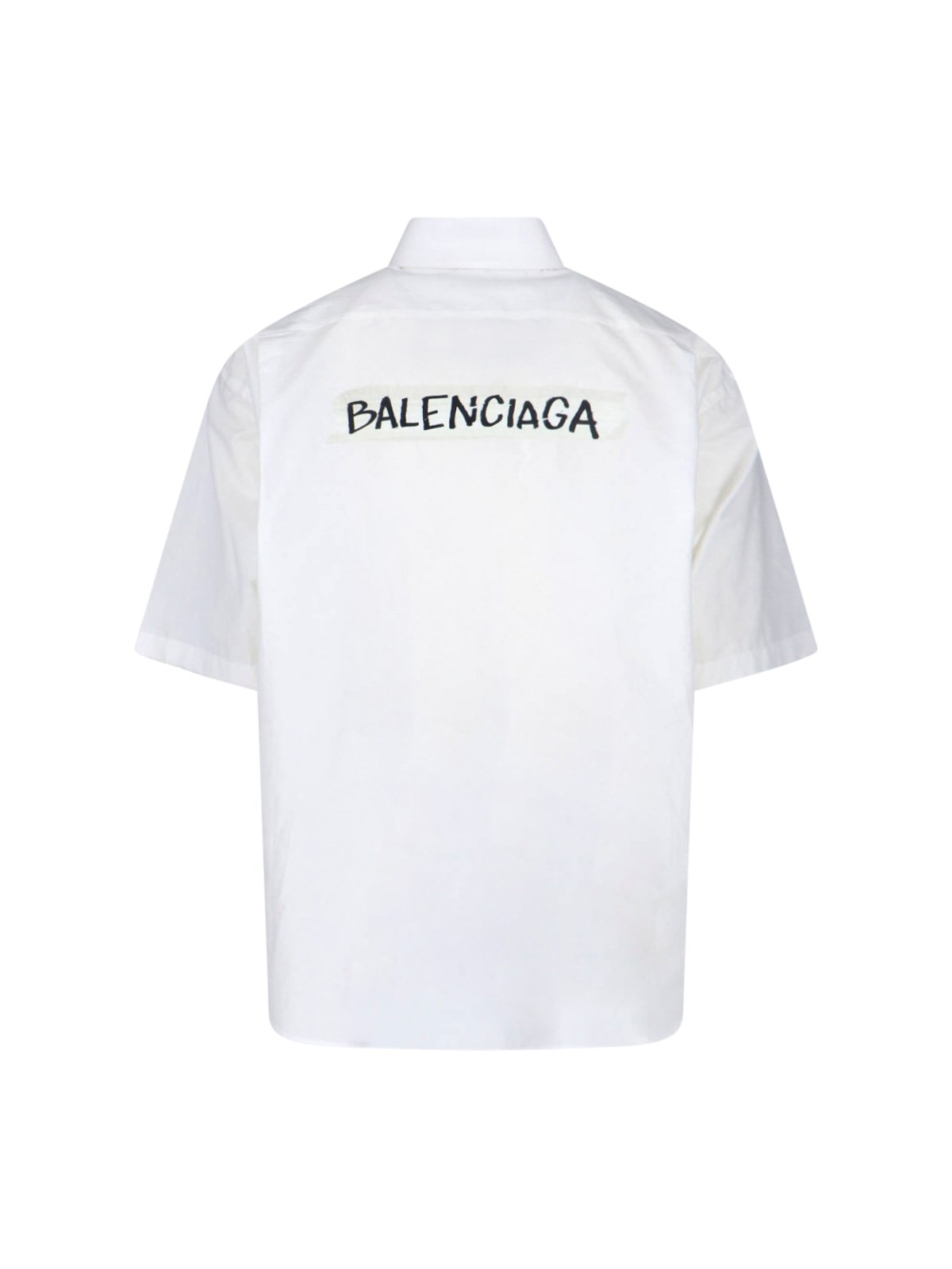 Balenciaga "Masking tape" shirt in white cotton poplin with button collar, short sleeves, front button closure, front logo, chest pocket, contrasting maxi logo on the back, straight hem.