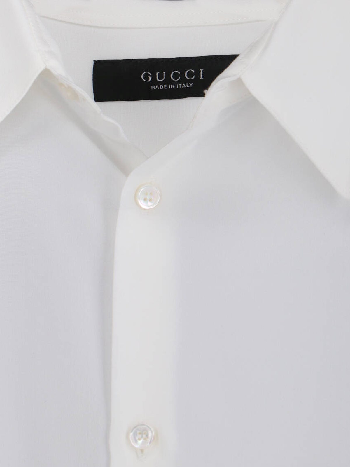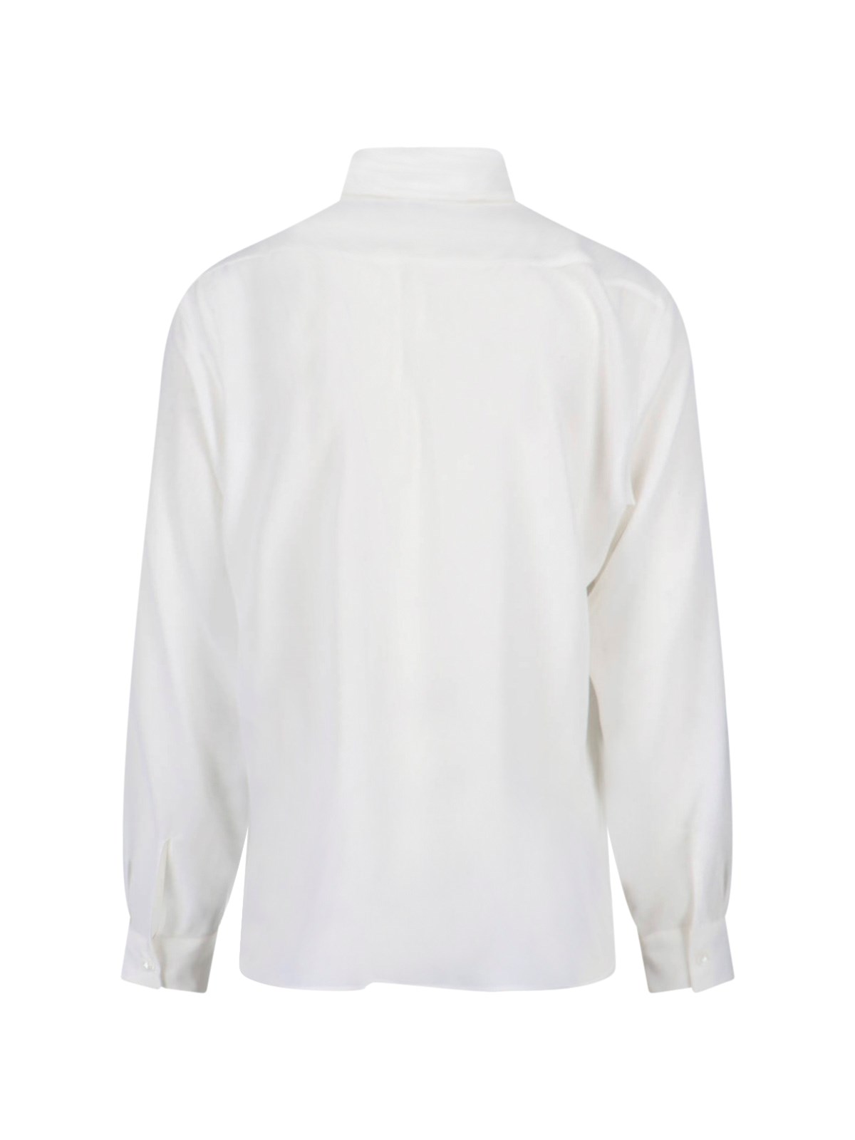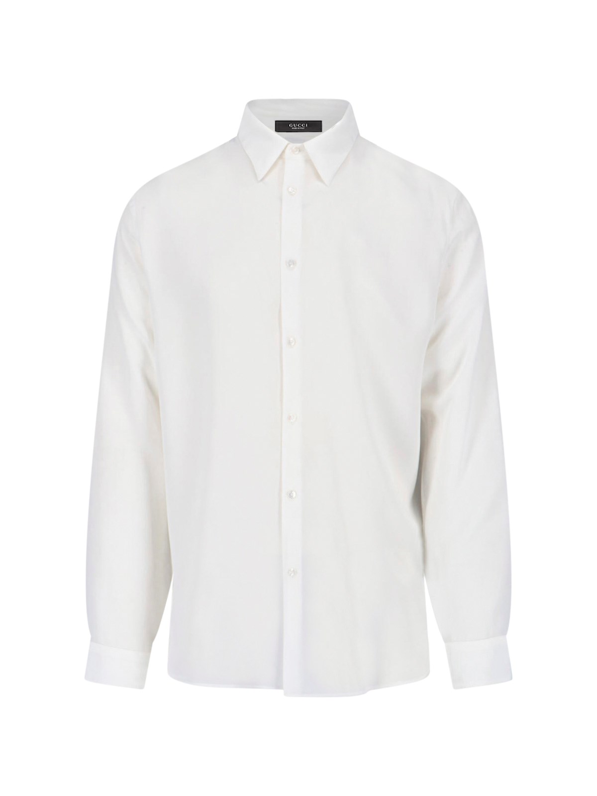 Gucci white crepe de Chine silk shirt with classic collar, button closure, button cuffs, curved hem.