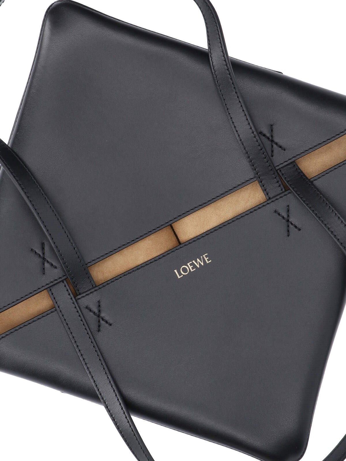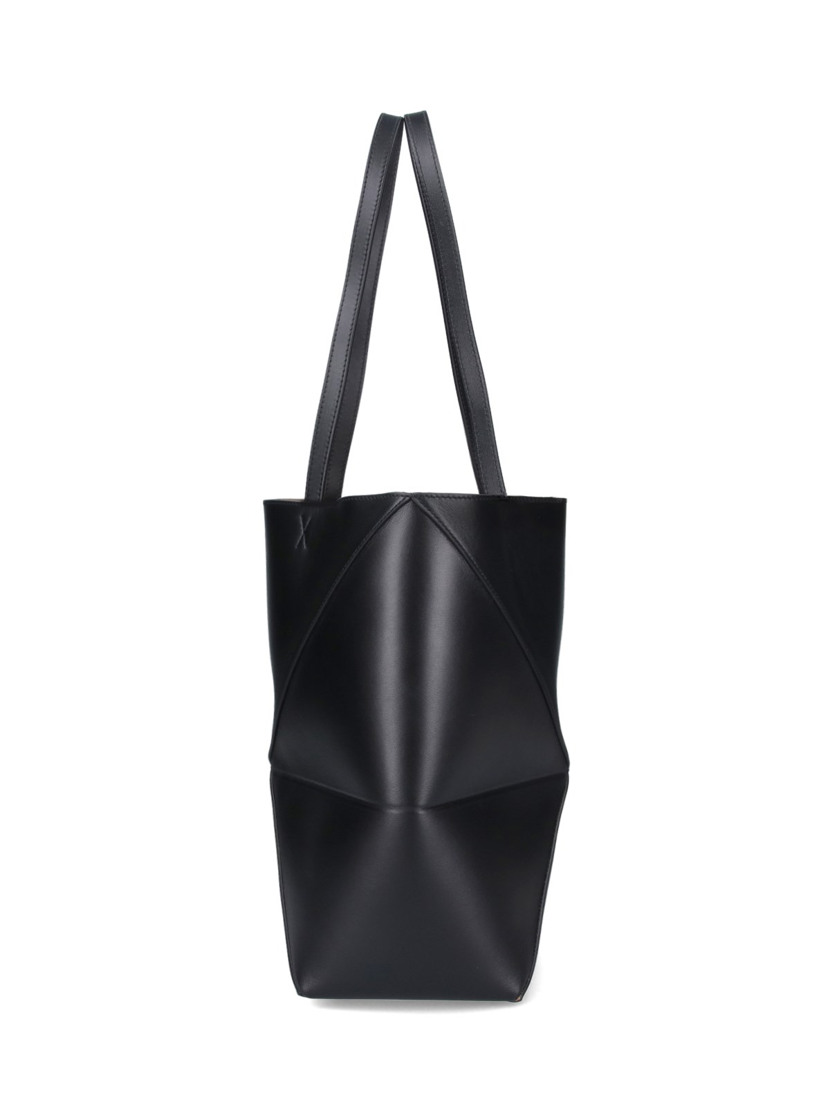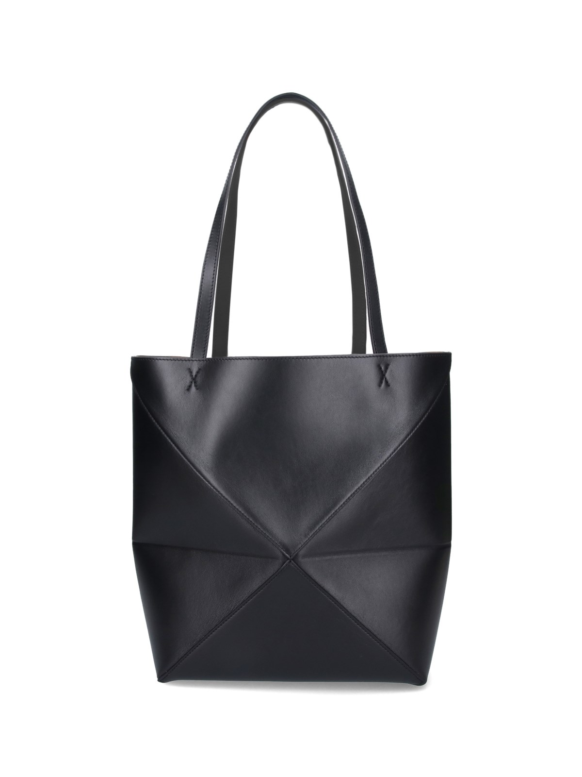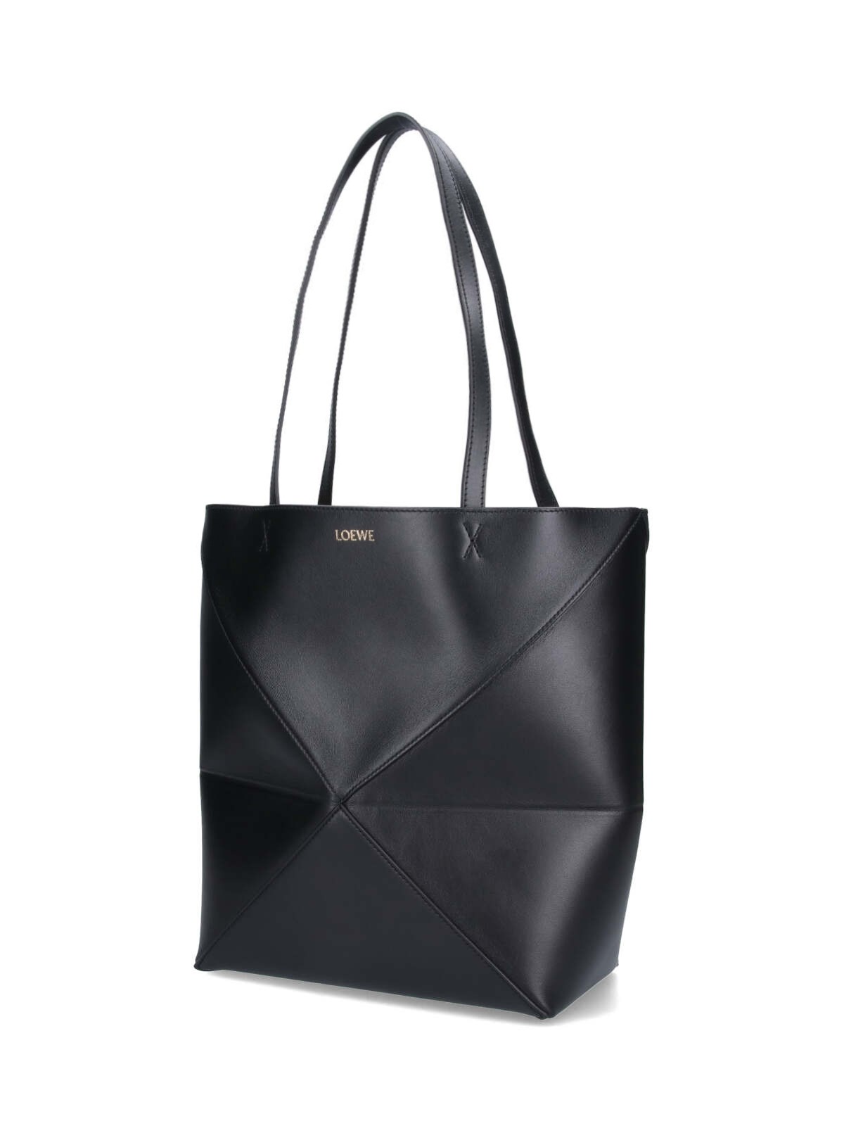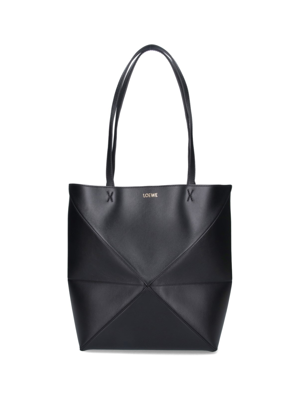 Loewe 'Puzzle Fold' tote bag, black leather, two top handles, golden logo engraved on the front, single internal compartment, folding panel design.