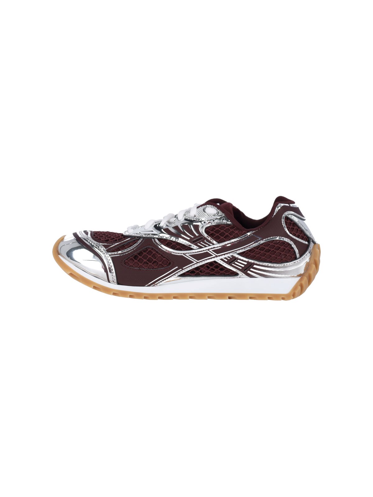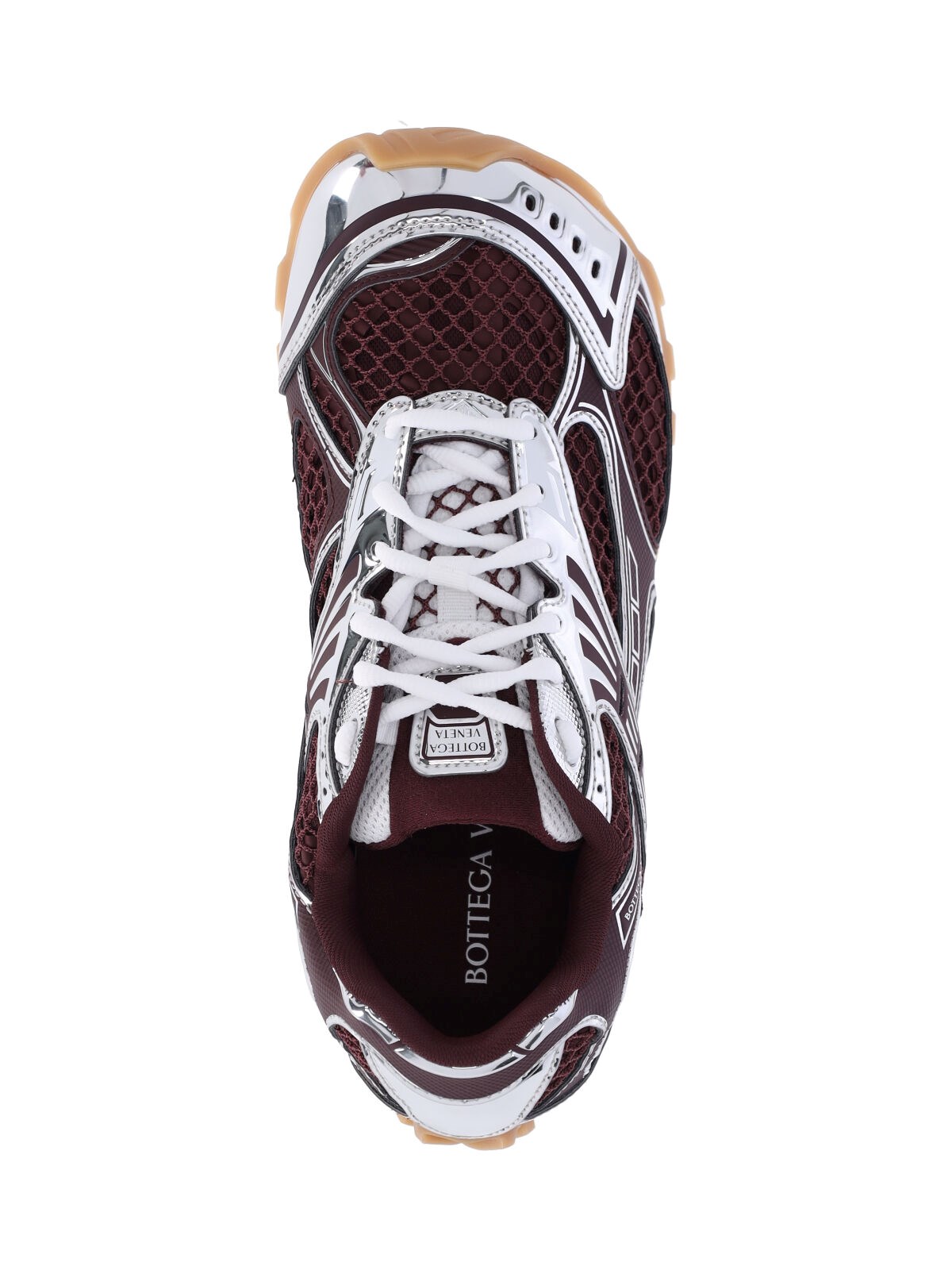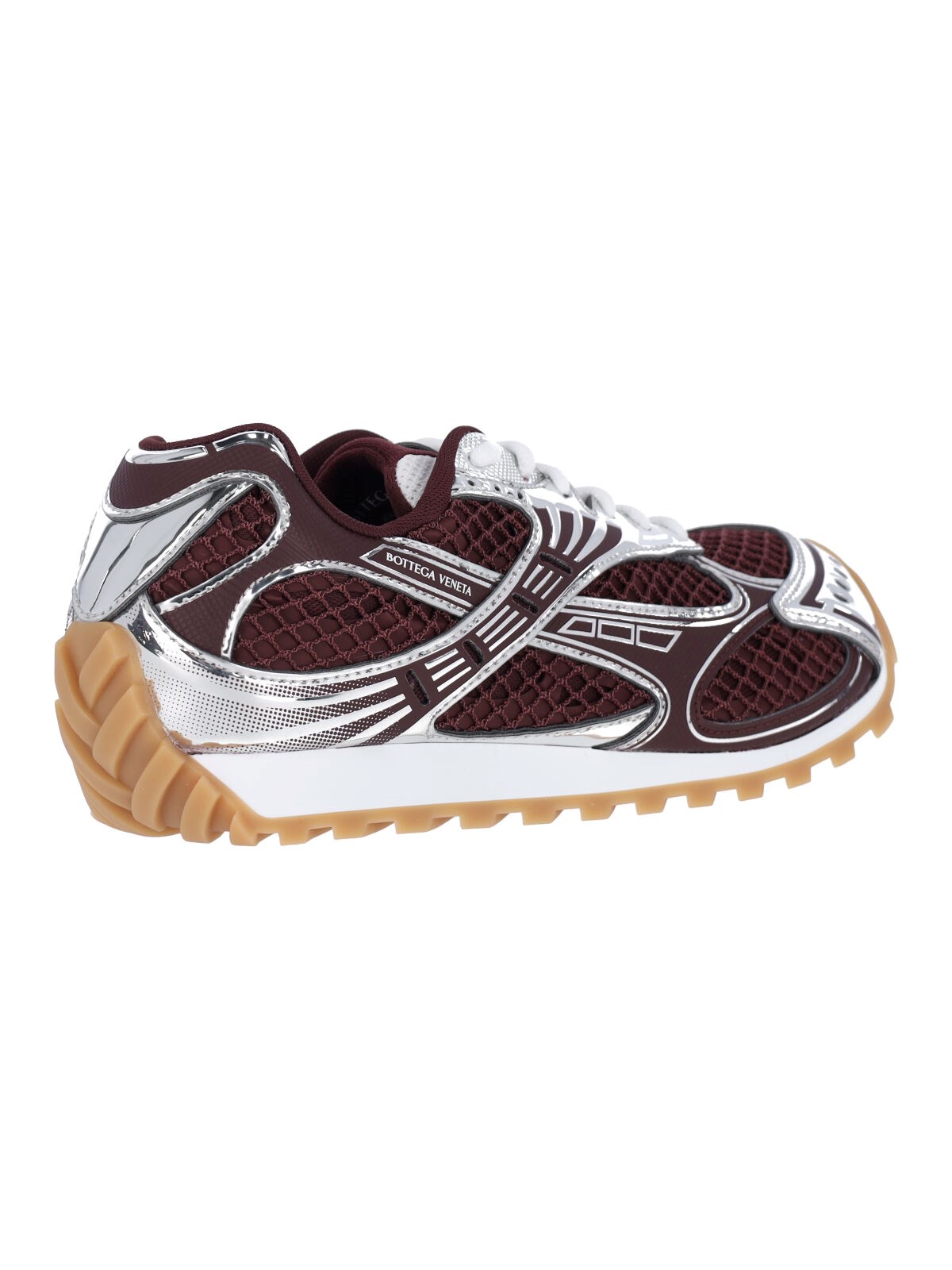 Sneakers 'Orbit' Bottega Veneta, in red mesh, burgundy shades, silver details, round toe, lace-up closure, logo patch on tongue, silver logo print on the side, textured rubber sole.