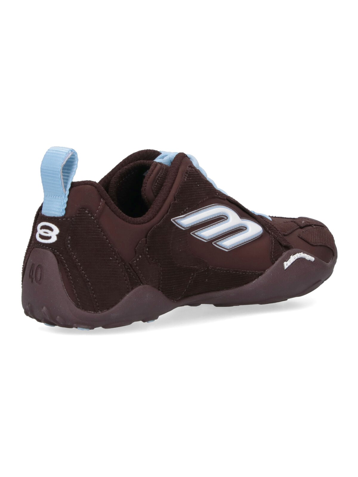 Balenciaga "Monday Ultra" brown fabric sneakers with pointed toe, lace-up closure, contrasting side logo, contrast back puller, rubber sole.