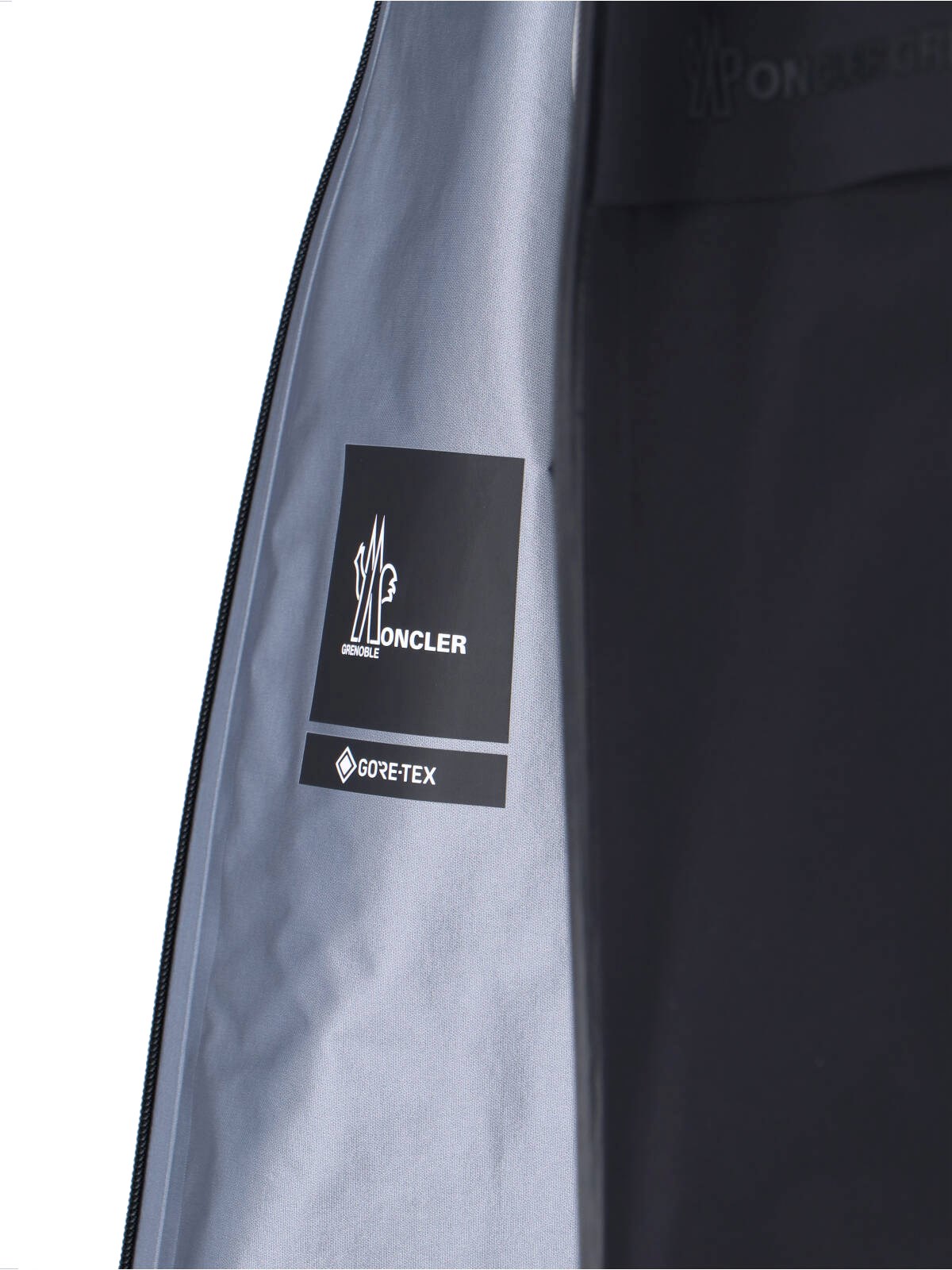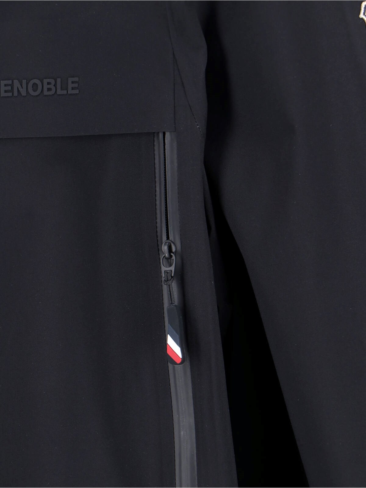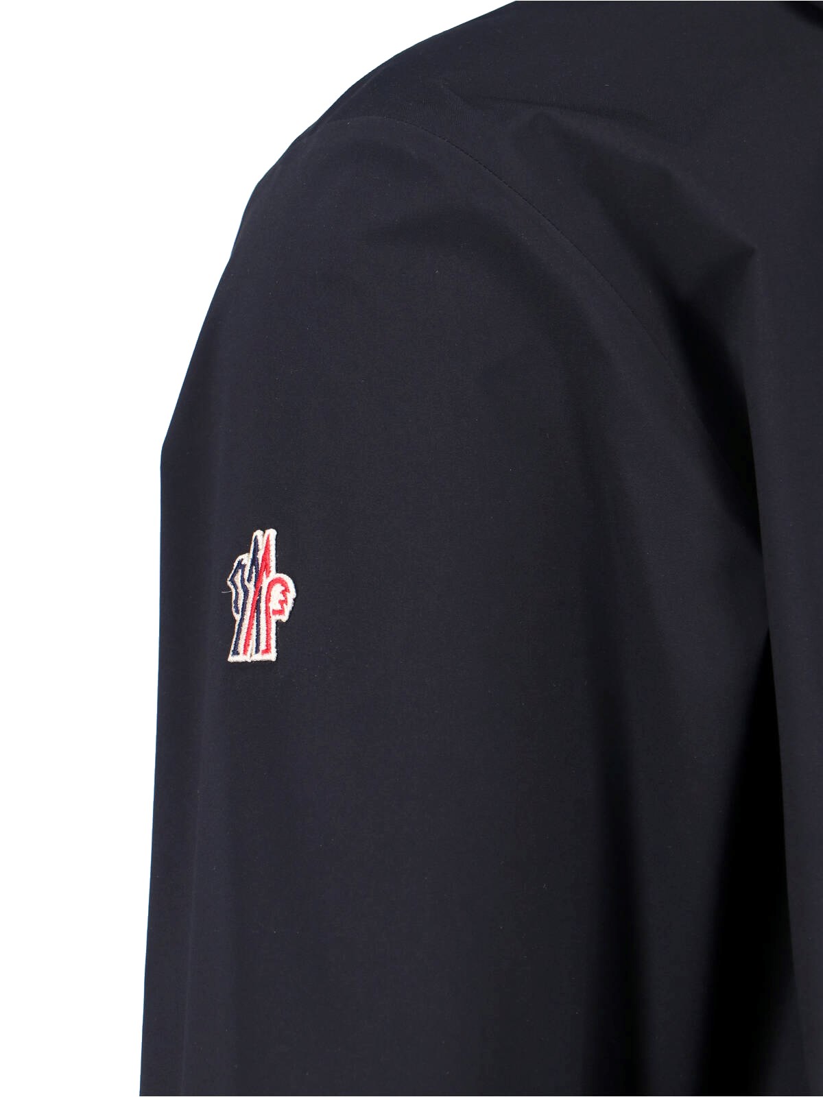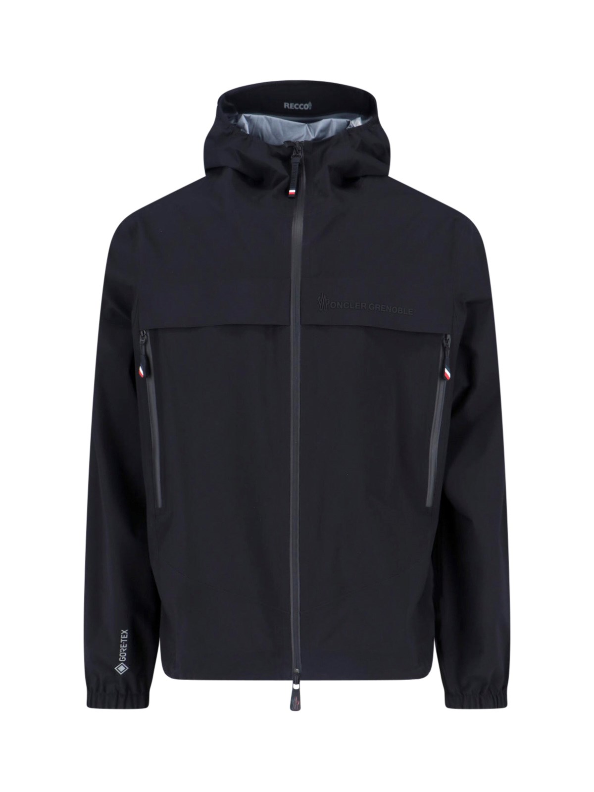 Moncler Grenoble "Shipton" jacket in black "GORE-TEX¢ç" with hood, zip closure, long sleeves, two front zip pockets, logo lettering on the front, multicolor logo patch on the side, straight hem.