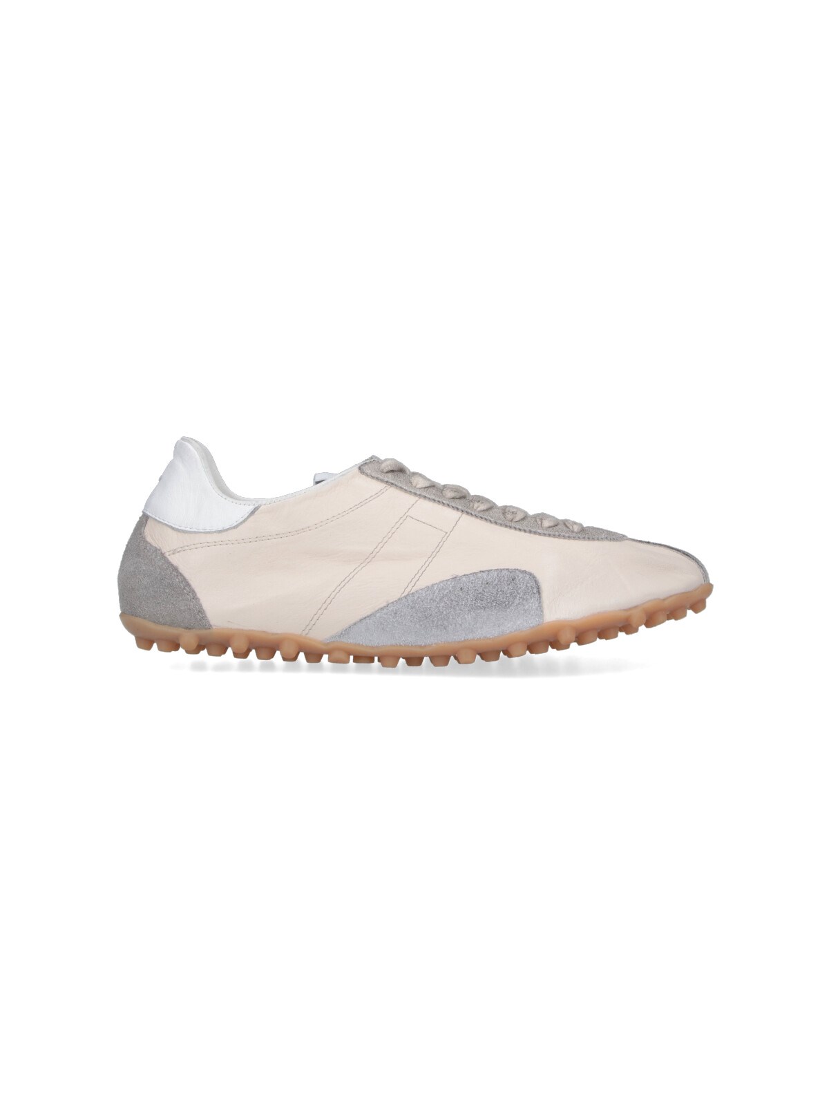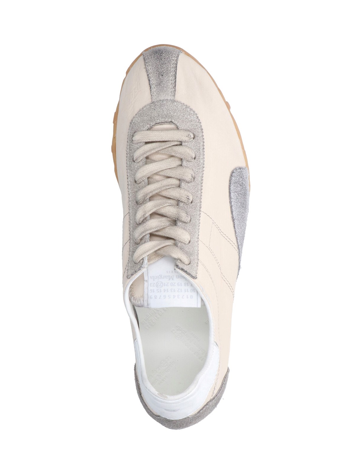 Maison Margiela "Sprinters" sneakers in goat leather and cream fabric with round toe, lace-up closure, "Numeric" logo tag on the tongue, contrast suede trim, back stitching, textured rubber sole.