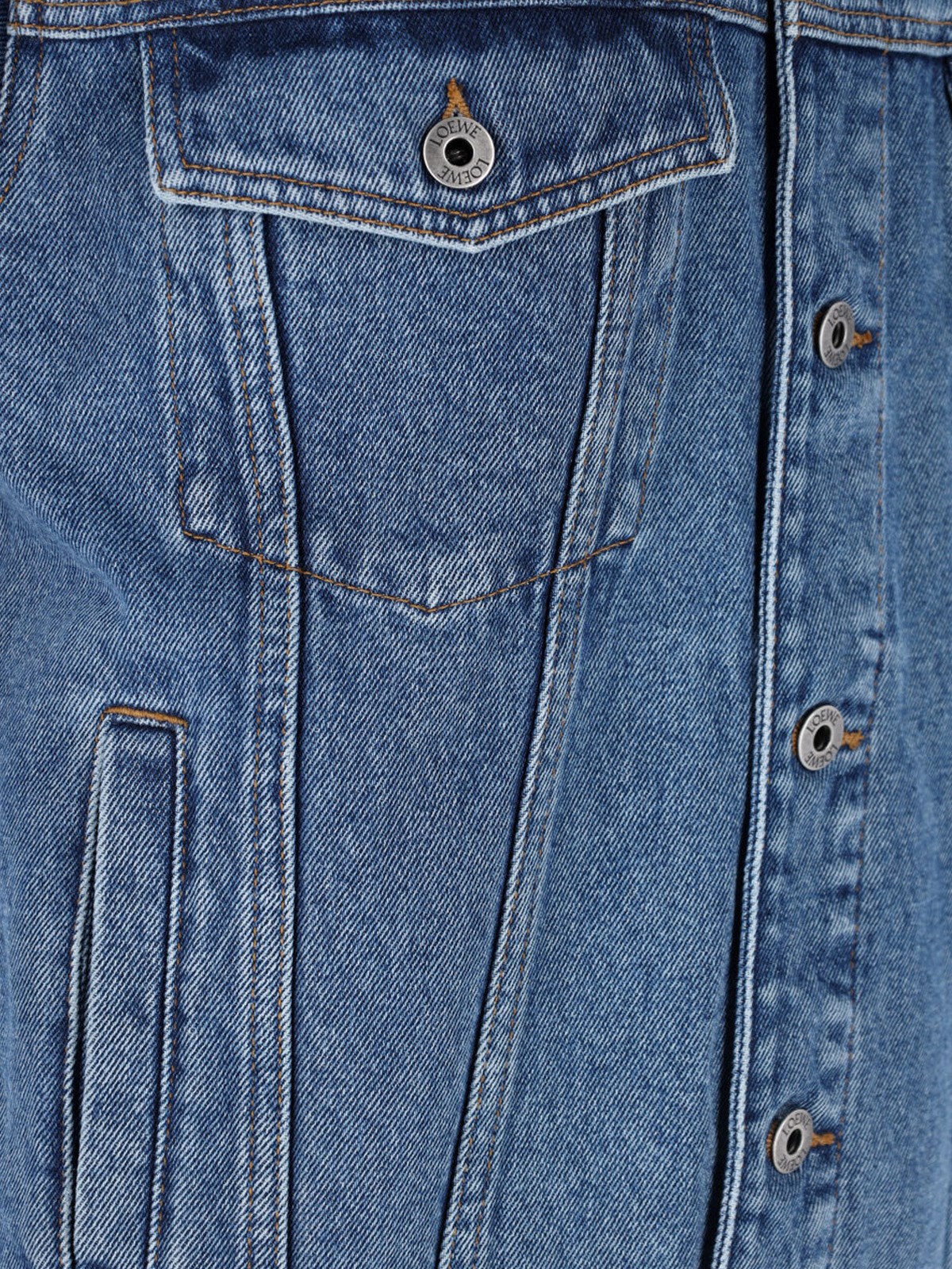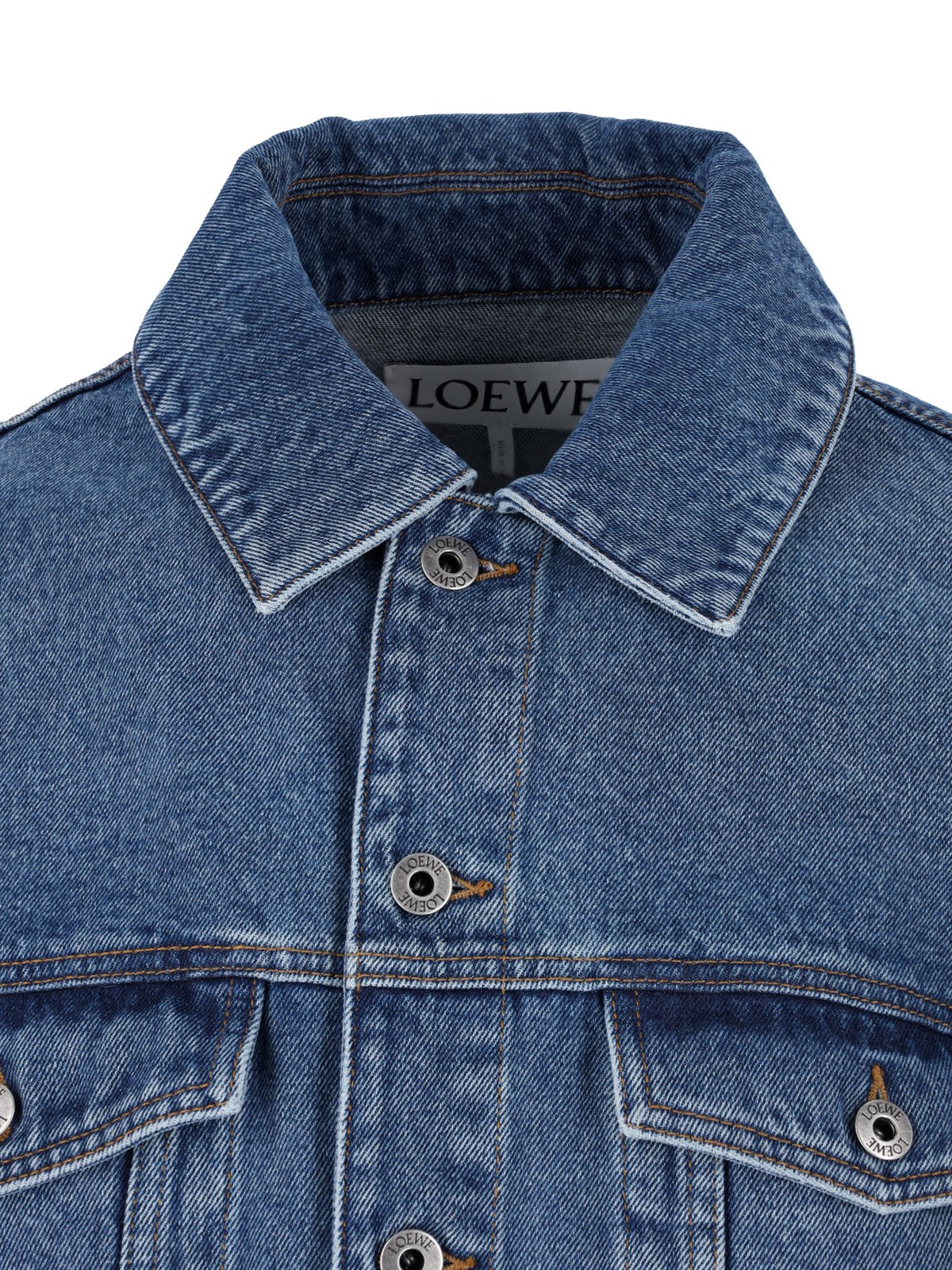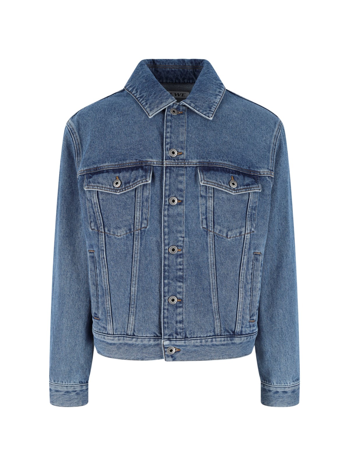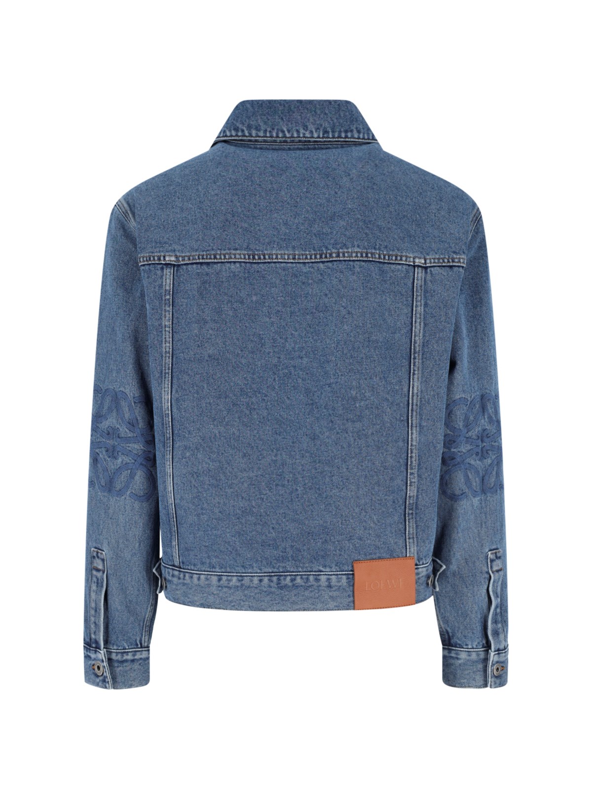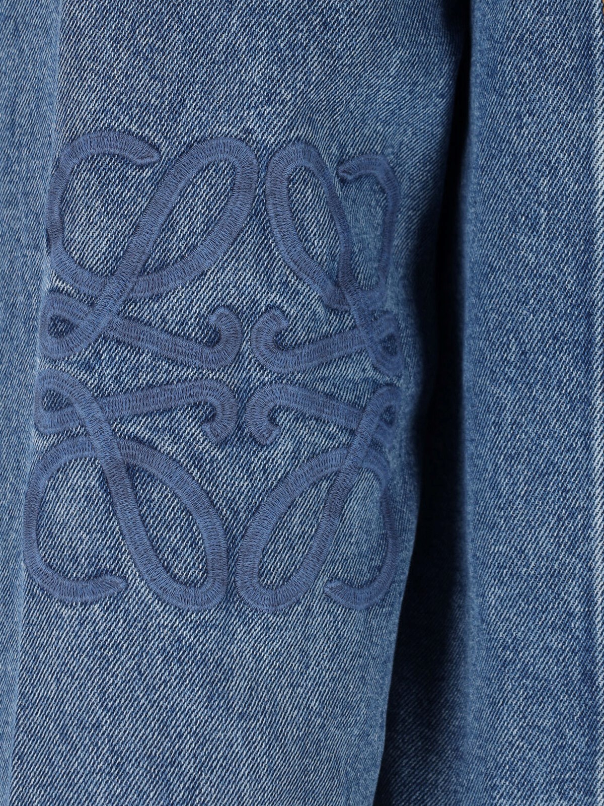 Loewe Anagram blue denim jacket with classic collar, button closure, two front flap pockets, two side flat pockets, tone-on-tone Anagram embroidered logo, elbows, buttons at the back, leather logo patch at the back, and straight hem.