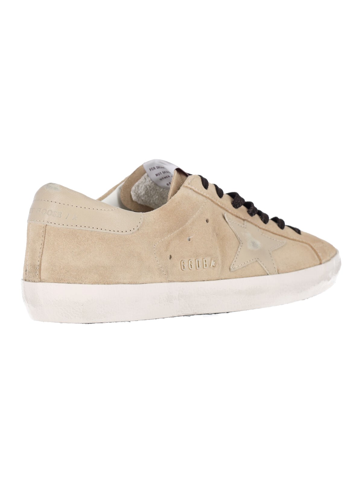 Sneakers "Super-Star" Golden Goose in beige calf suede, round toe, upper lace closure, front logo tag, side star logo, contrasting rubber sole.