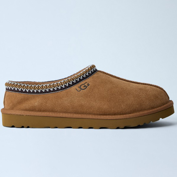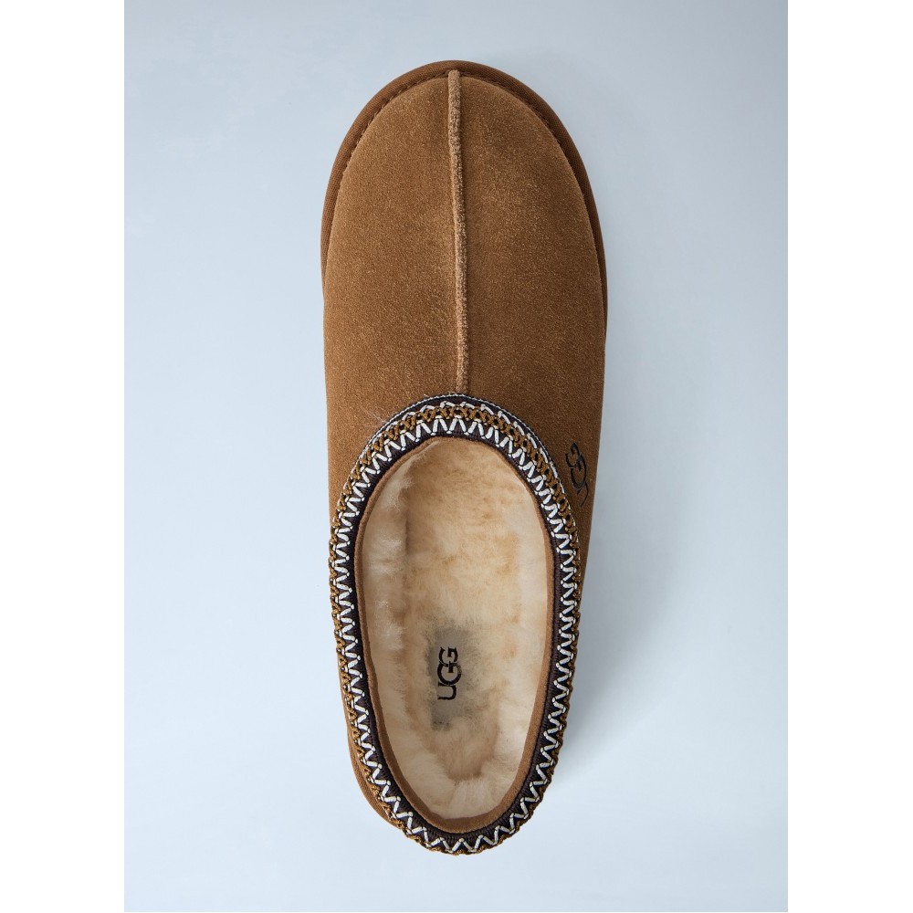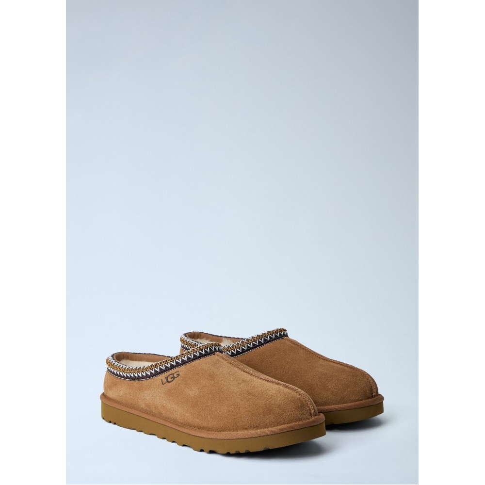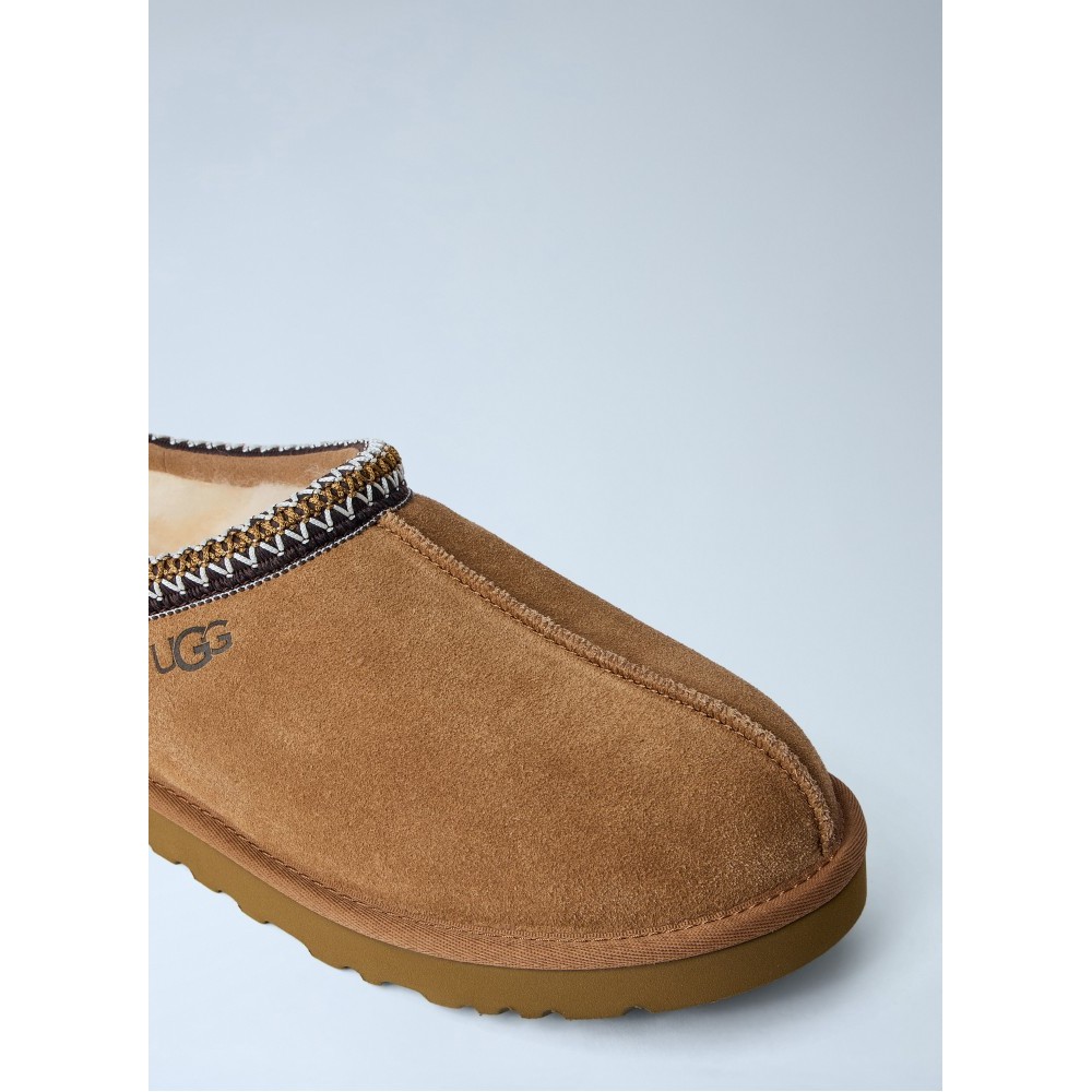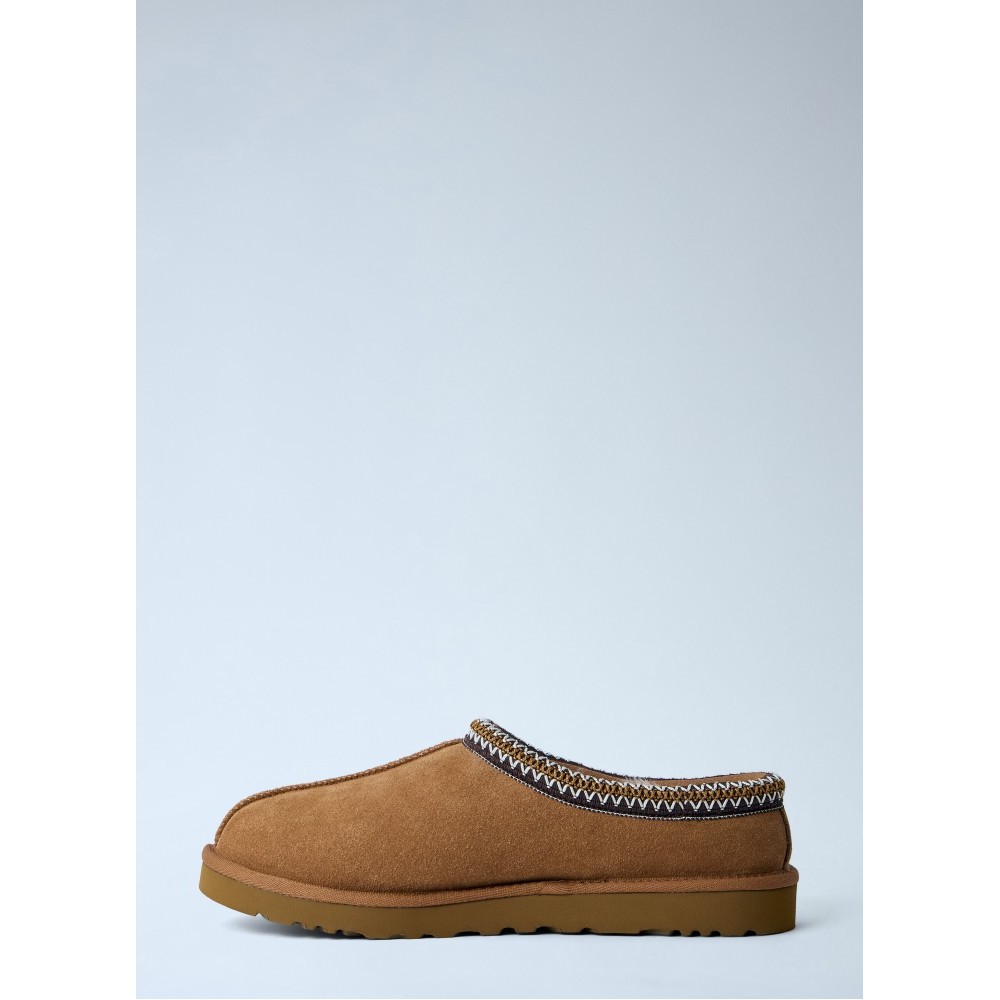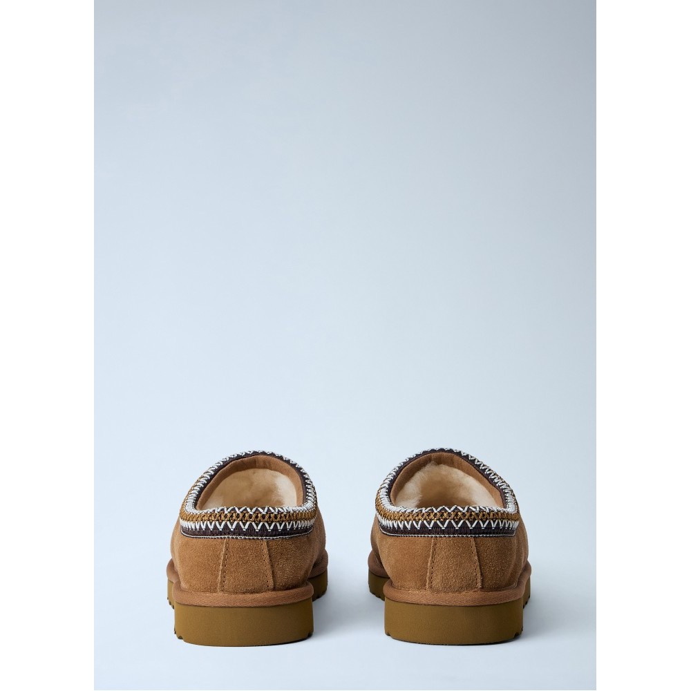 Suede slip-on slippers with embroidered trim detail.