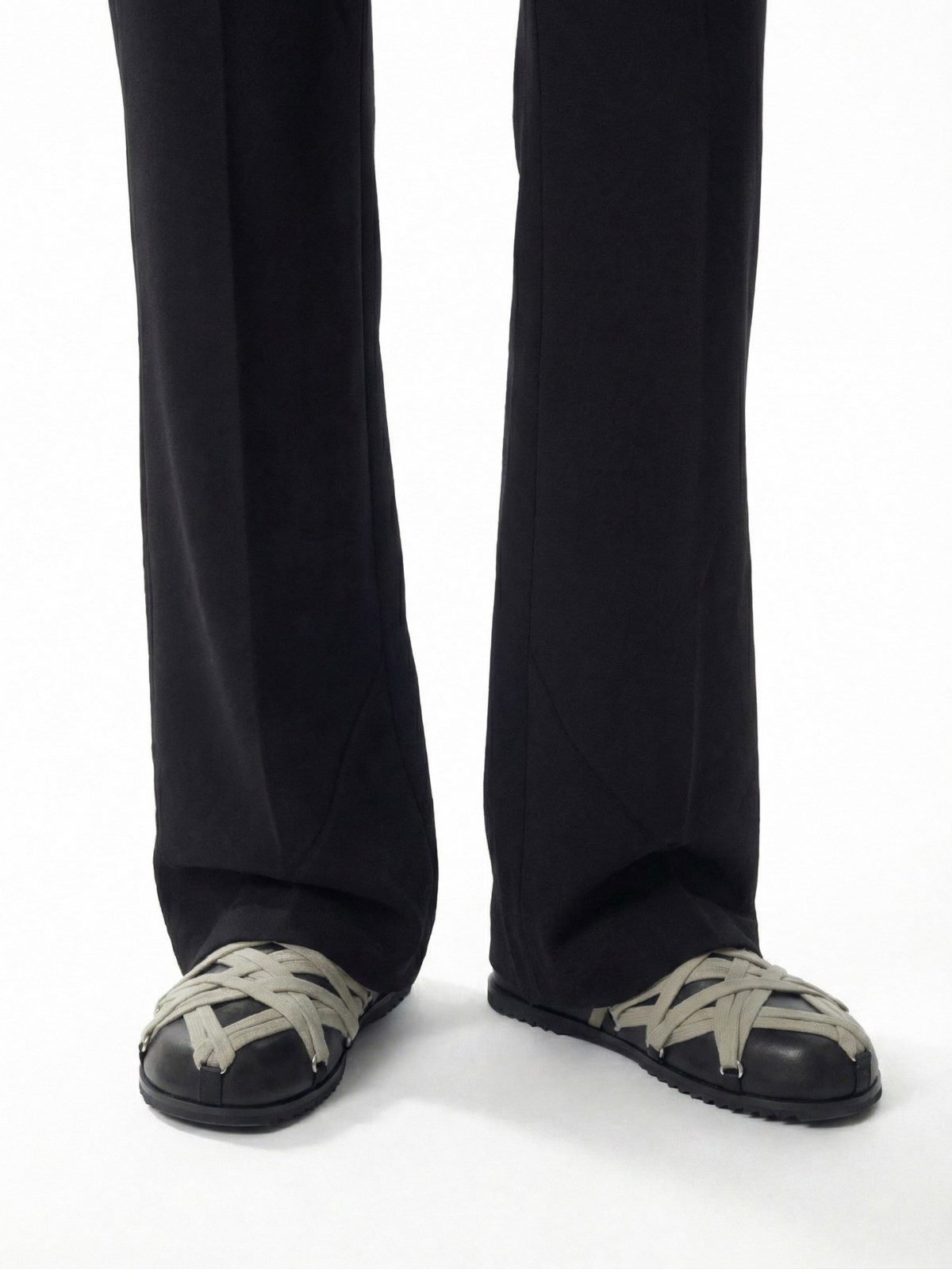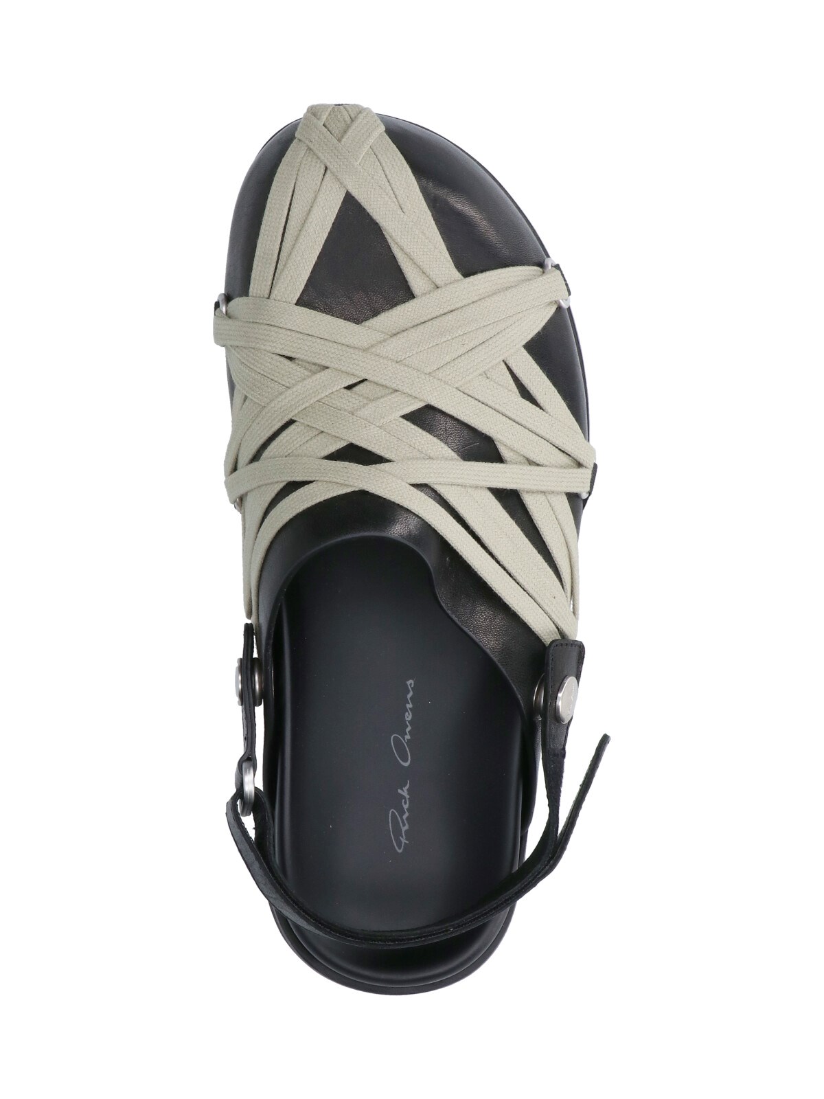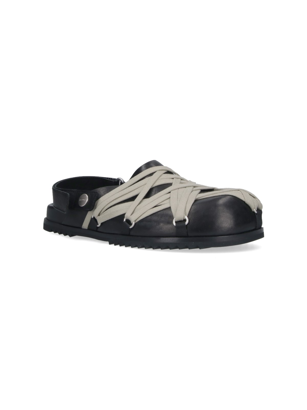 Rick Owens "Megalace Granola" black monone leather mules with round toe, contrast crossed laces, leather strap at the back, textured rubber sole.