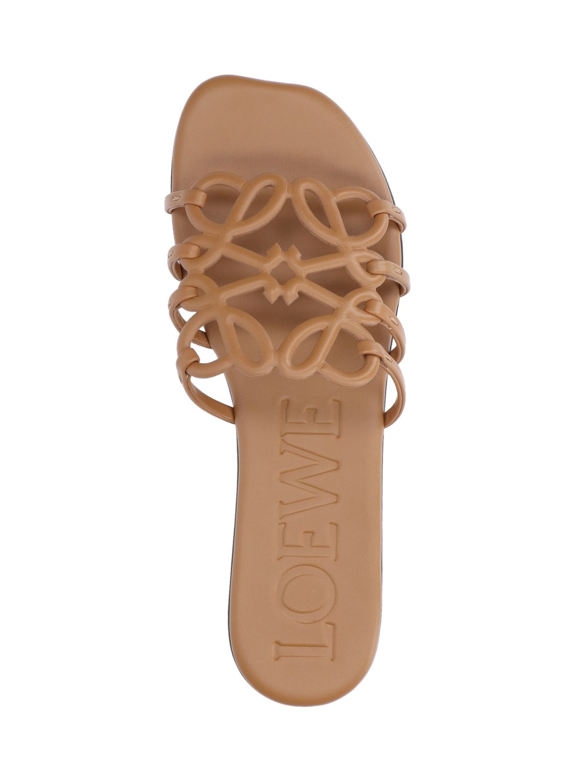 Loewe "anagram petal" brown calf leather sanadali with open round toe, carved "anagram" logo top band, leather sole.