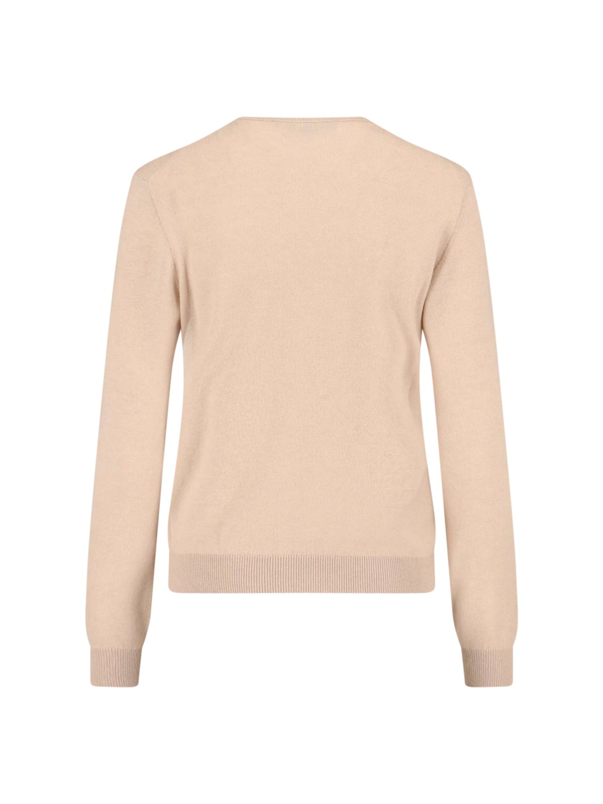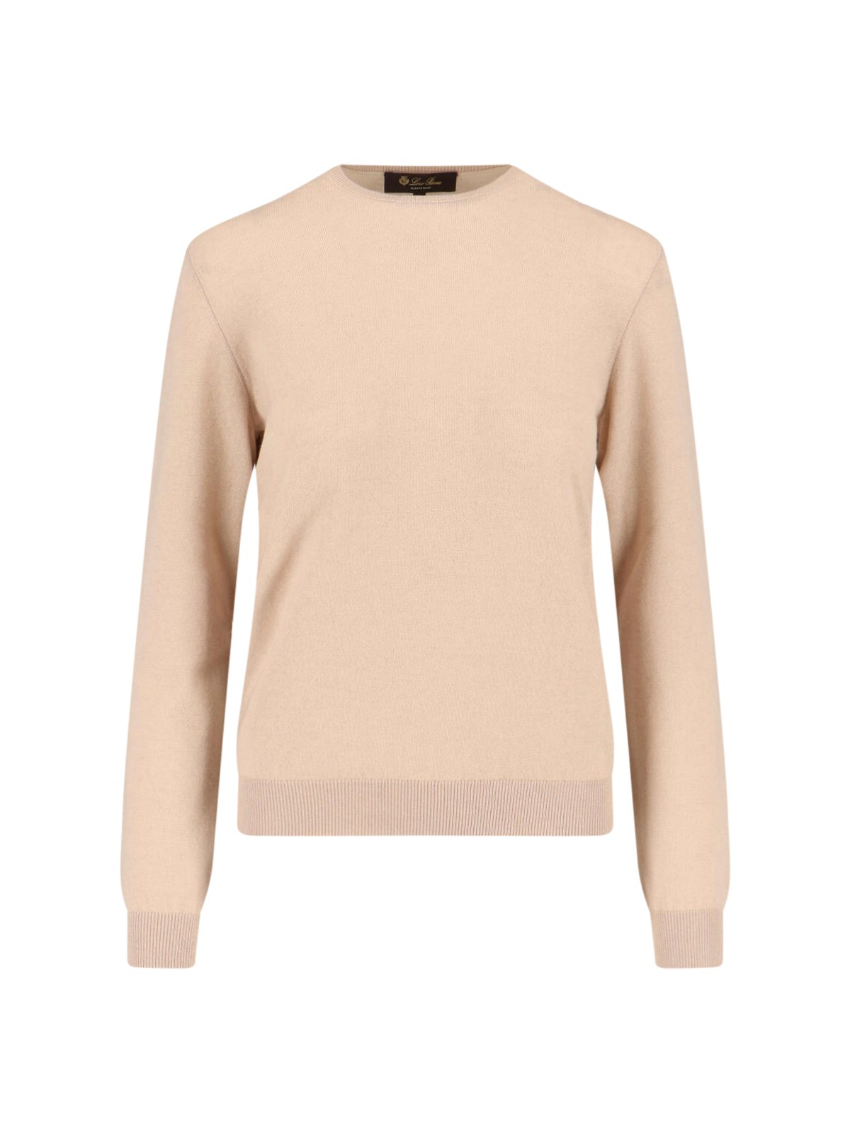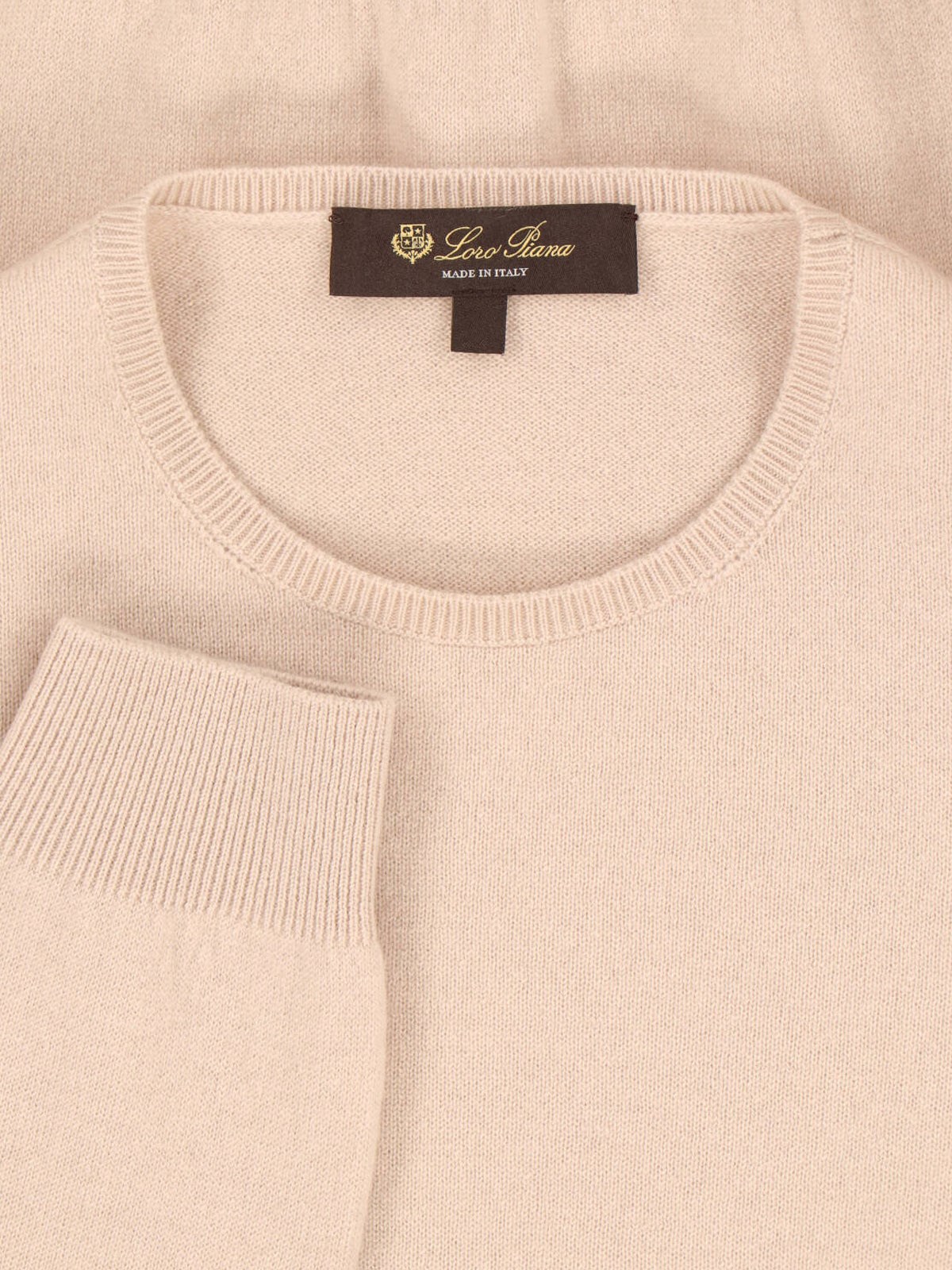 Loro Piana beige cashmere sweater with ribbed crew neck, long sleeves, ribbed stretch trim, straight hem.