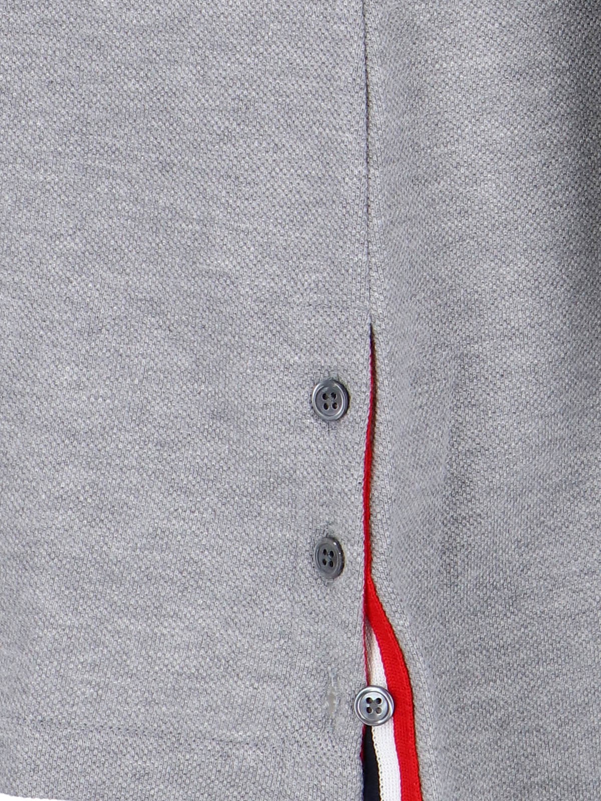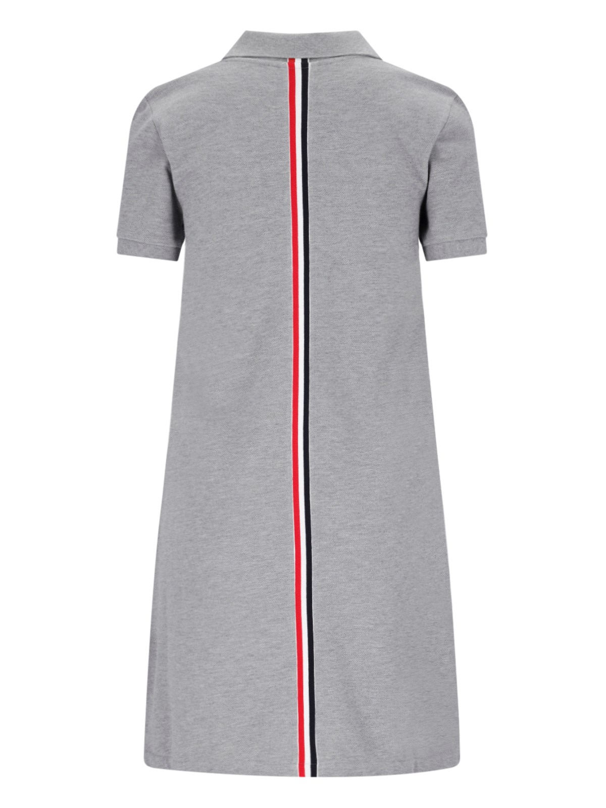 Thom Browne gray cotton minidress with classic collar, a button closure, short sleeves, a front logo label, a tricolor grosgrain tongue detail at the back, buttons on the hemline, and a long back hem.
