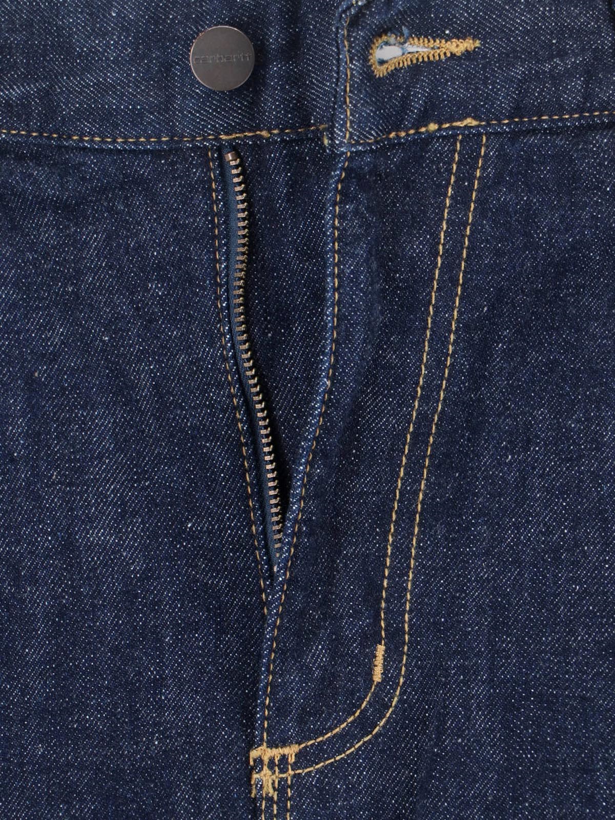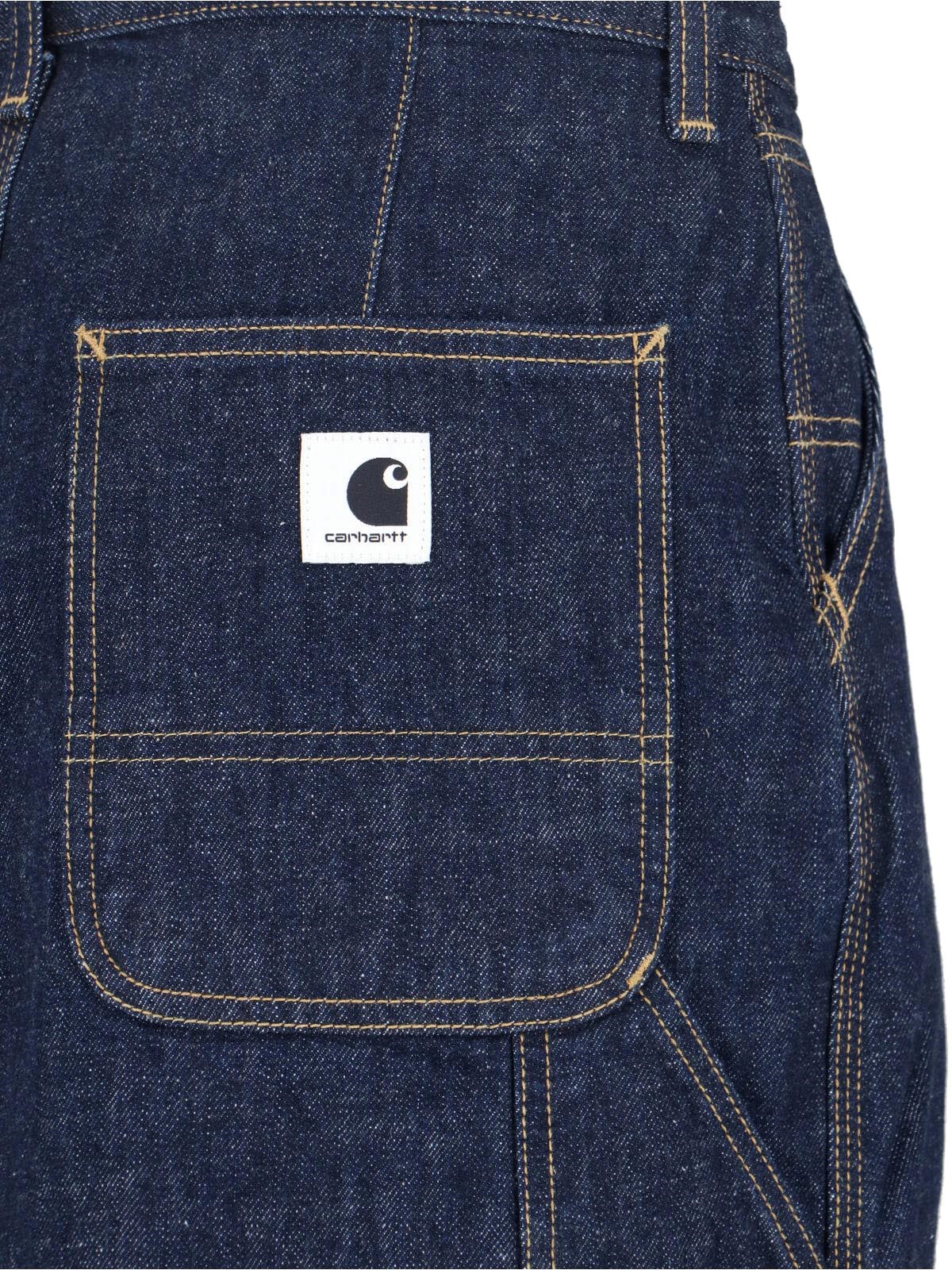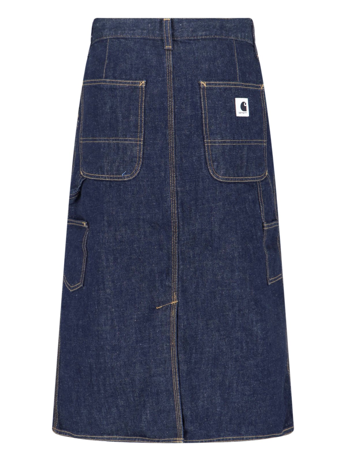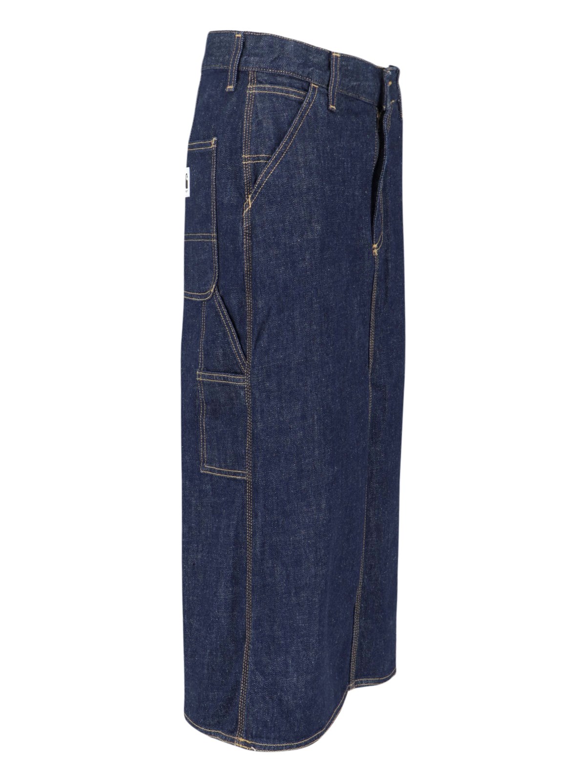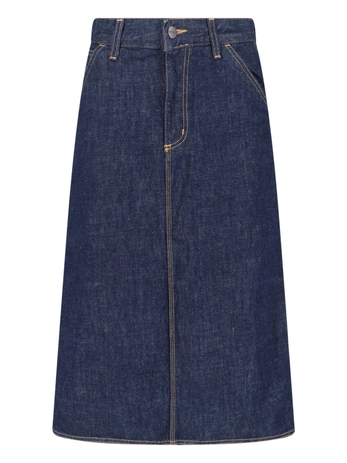 Carhartt WIP W Single Knee midi skirt in blue cotton denim with mid waist, zip and button closure, belt loops, two slanted side pockets, back pockets, back logo tag, straight hem.