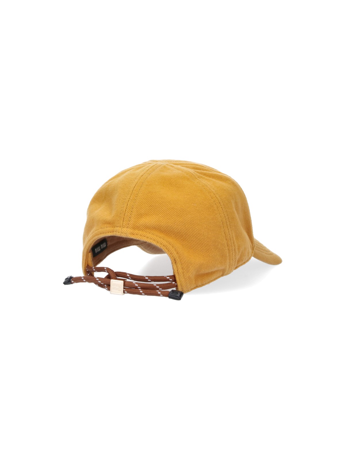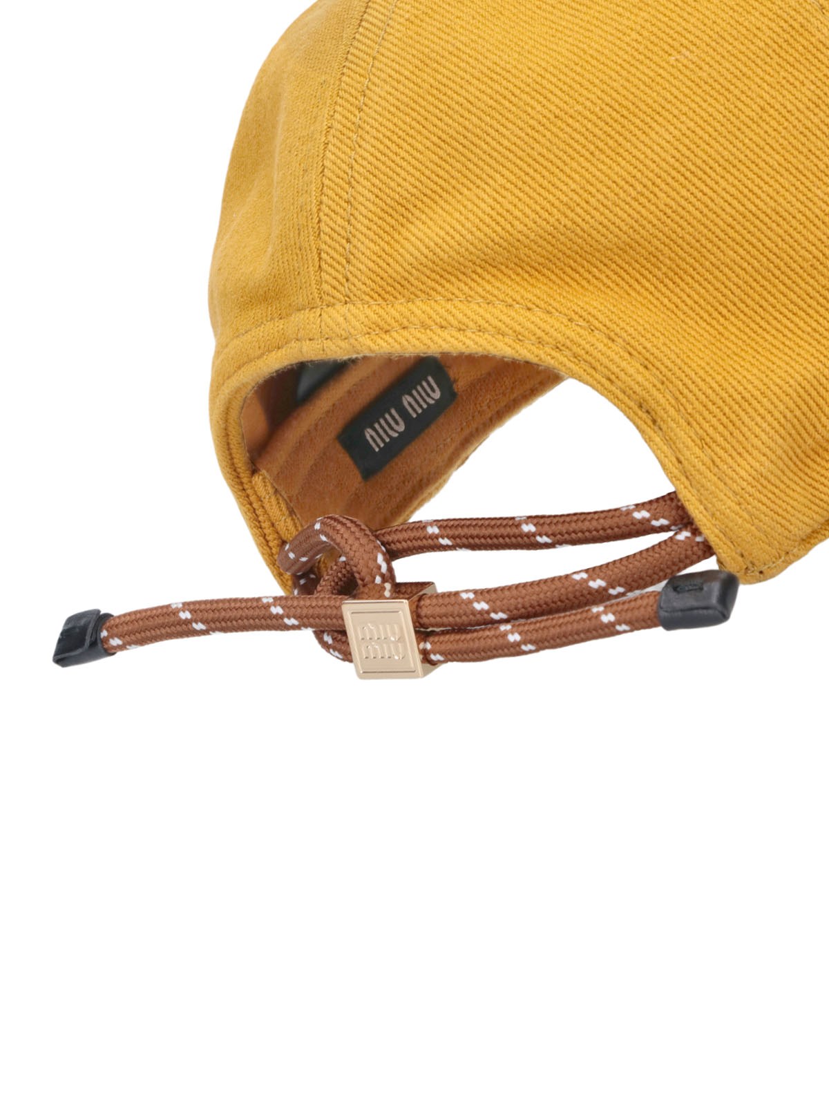 Miu Miu logo ball cap in yellow cotton denim with curved visor on the front, two-tone rope strap detail on the back, contrasting embroidered lettering logo on the front, metal logo charm on the back.