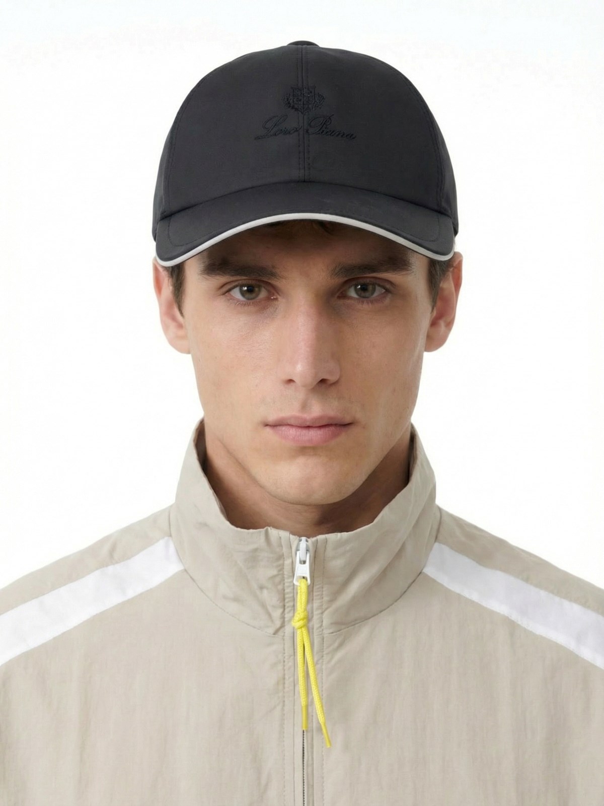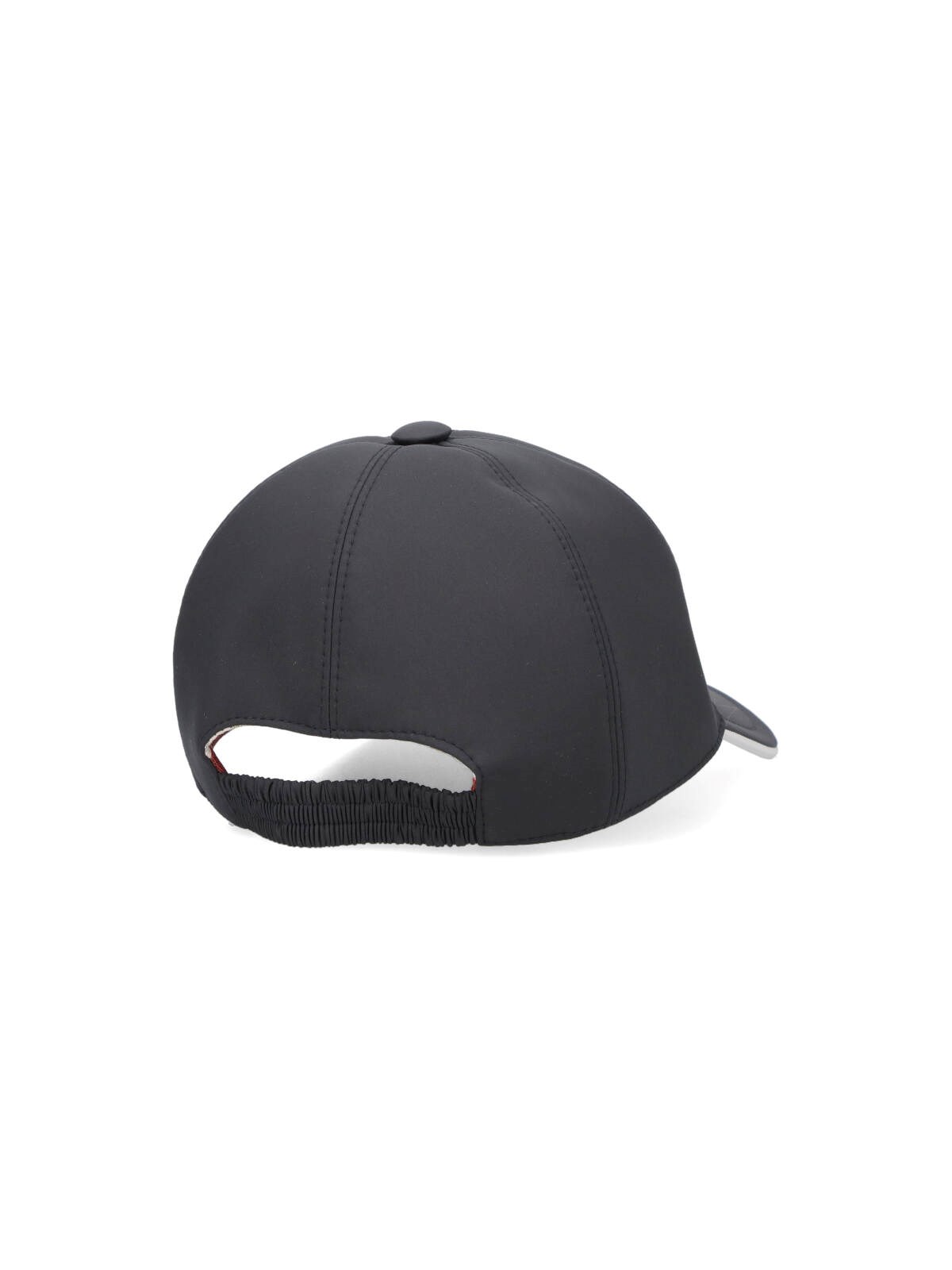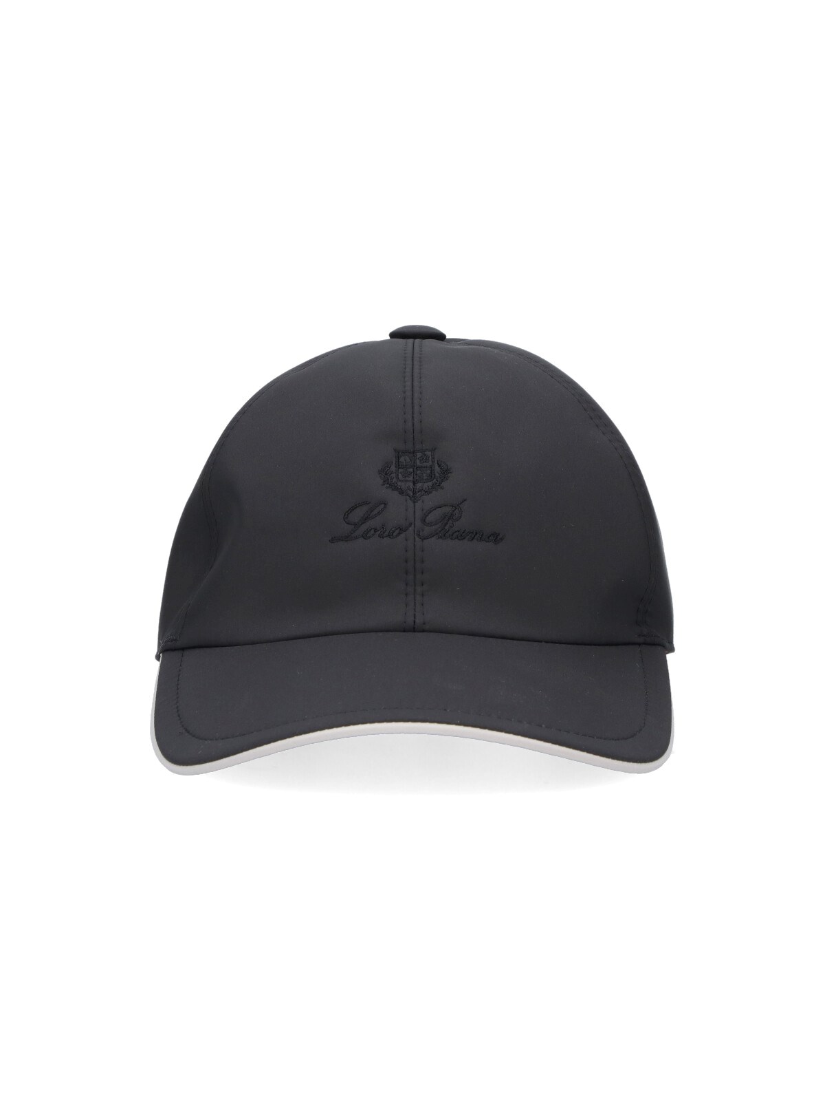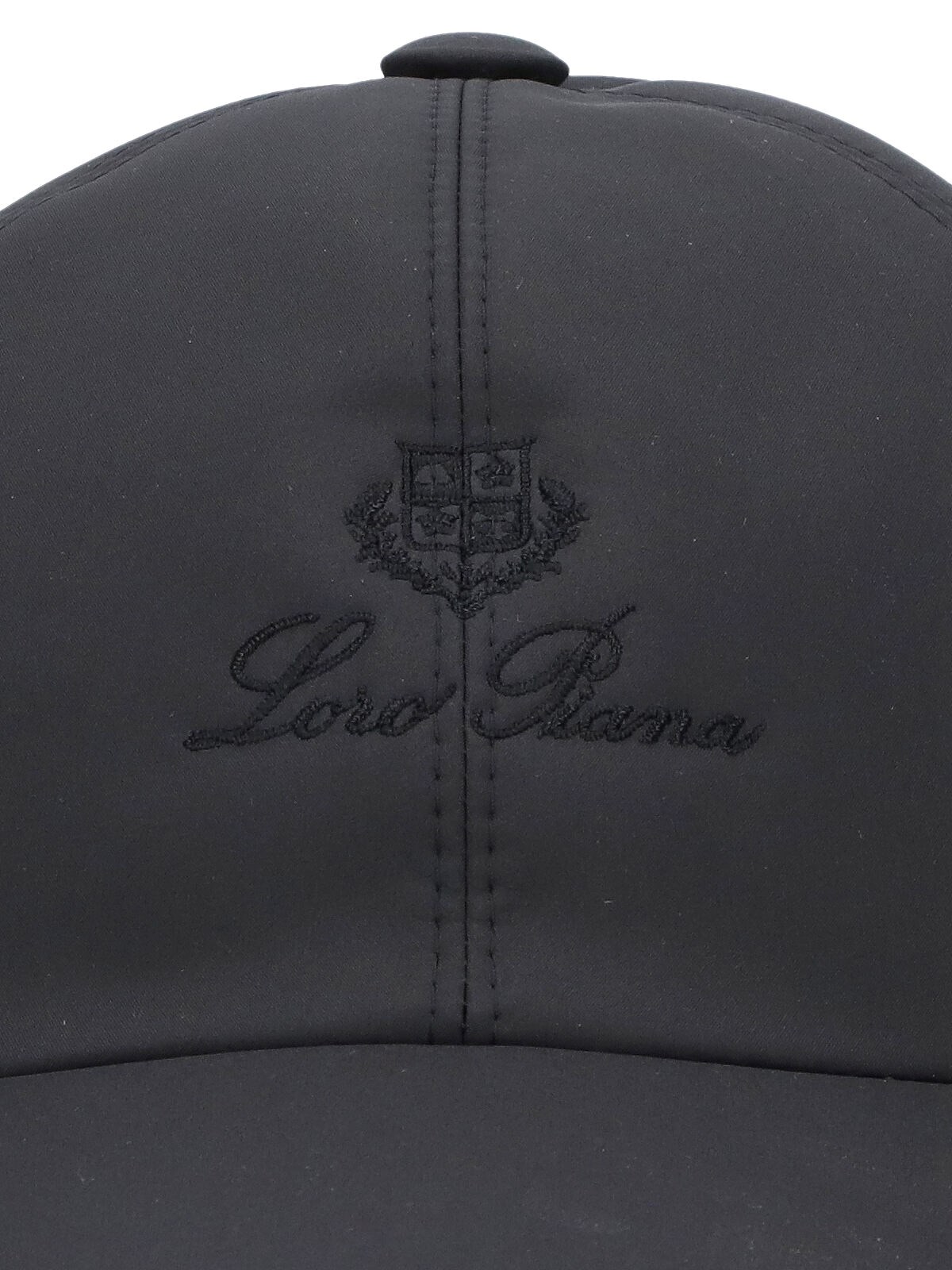 Loro Piana logo ball cap in black nylon with curved visor, tone-on-tone embroidered logo on the front, elastic strap on the back.