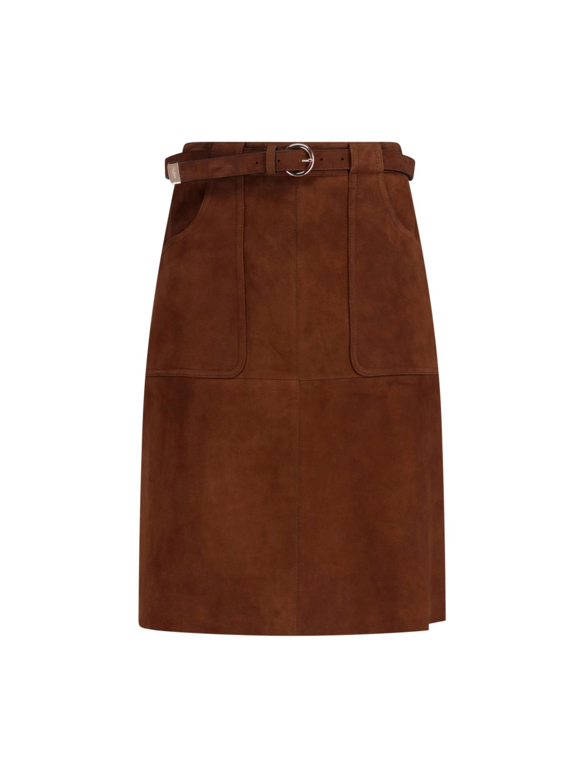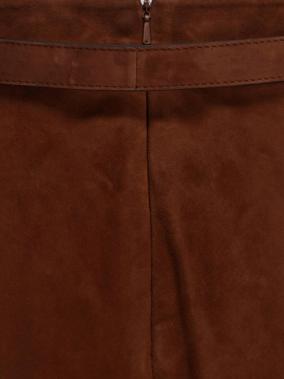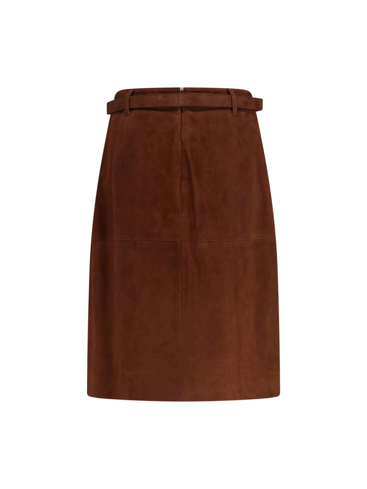 Max Mara Studio midi skirt in brown lamb suede with medium waist, adjustable belt at the waist, back zip closure, two side pockets, straight hem.