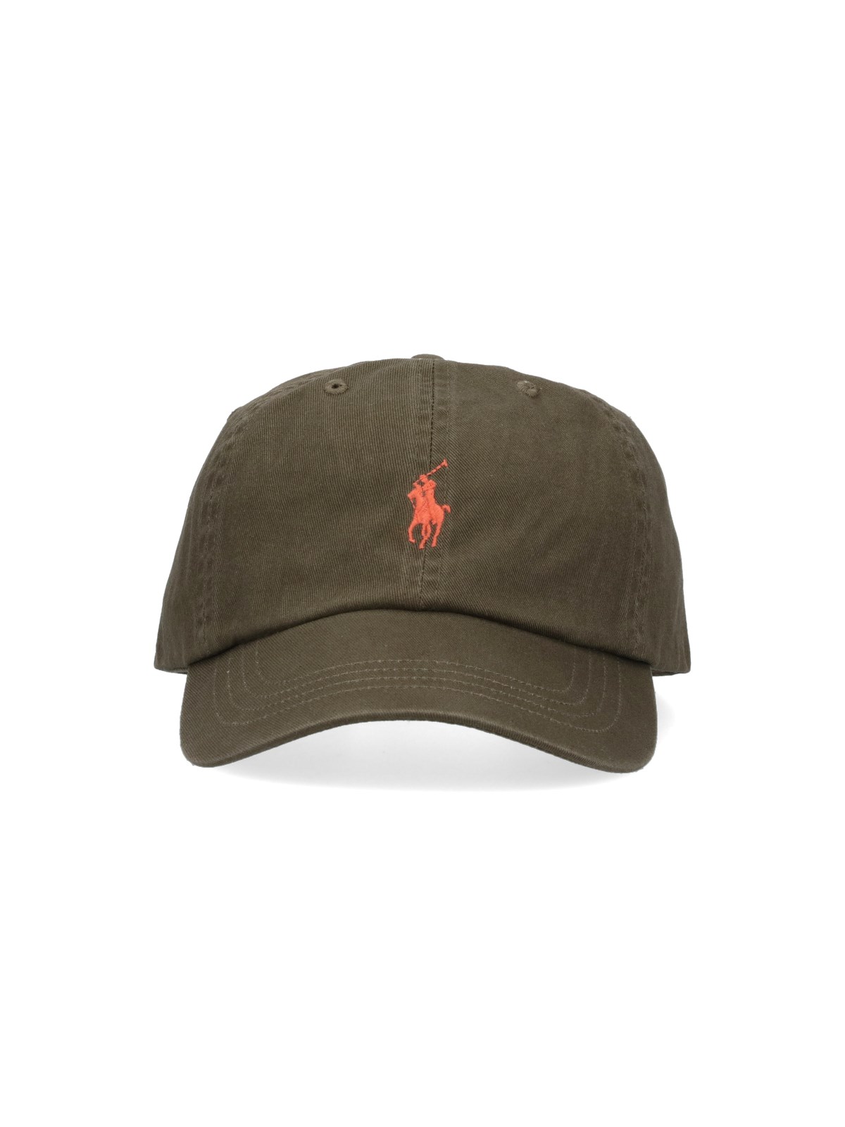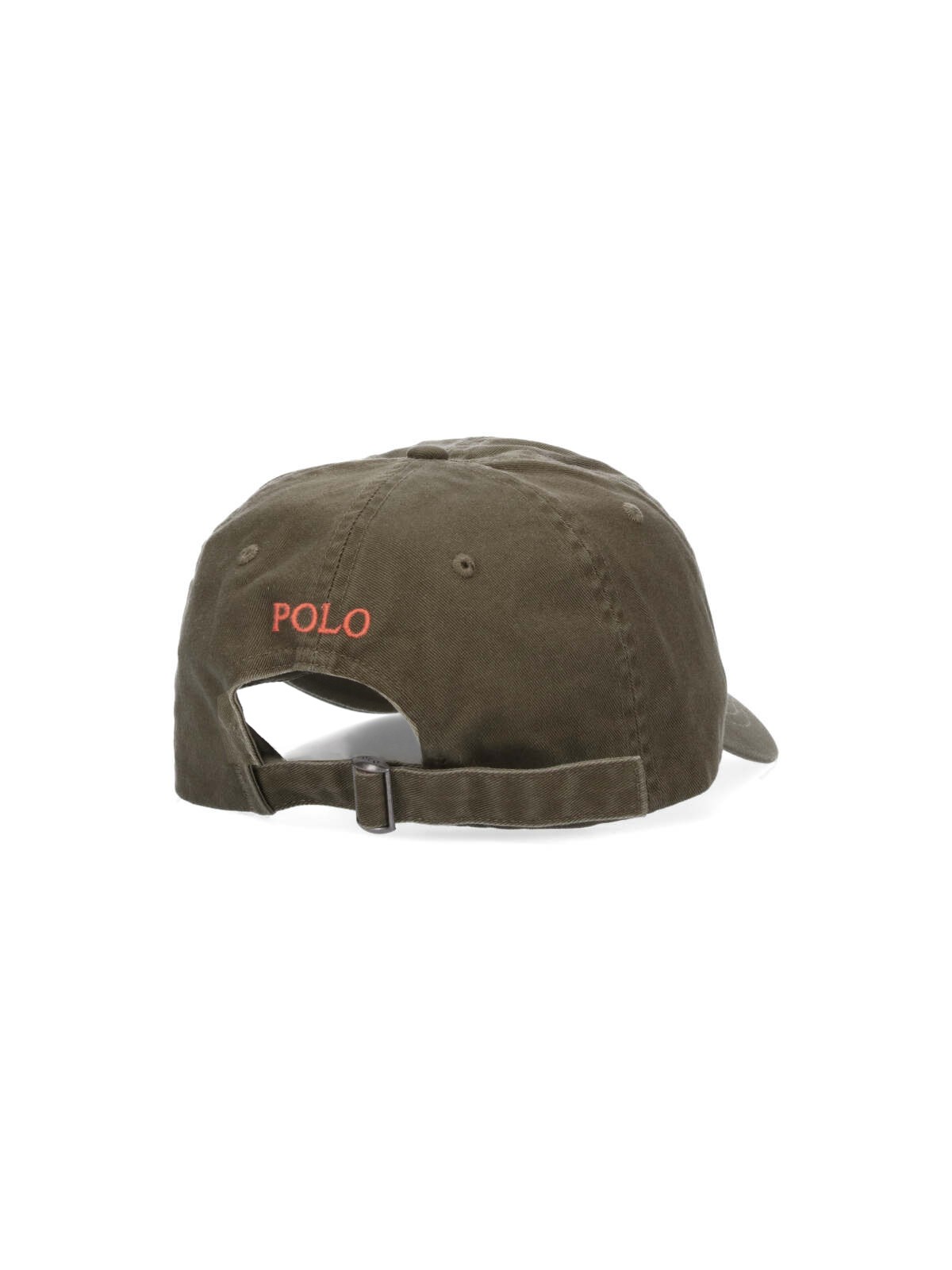Polo Ralph Lauren ball cap in green cotton with orange logo embroidery on the front and back, curved visor, adjustable strap at the back.