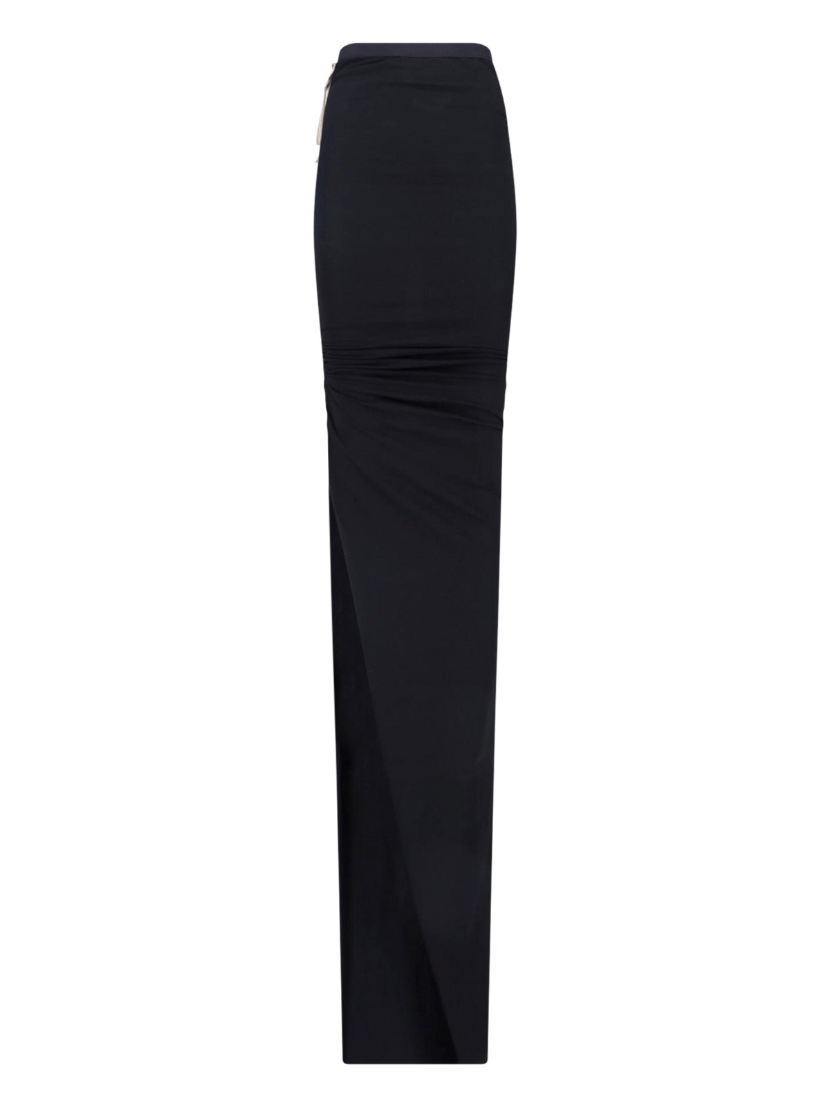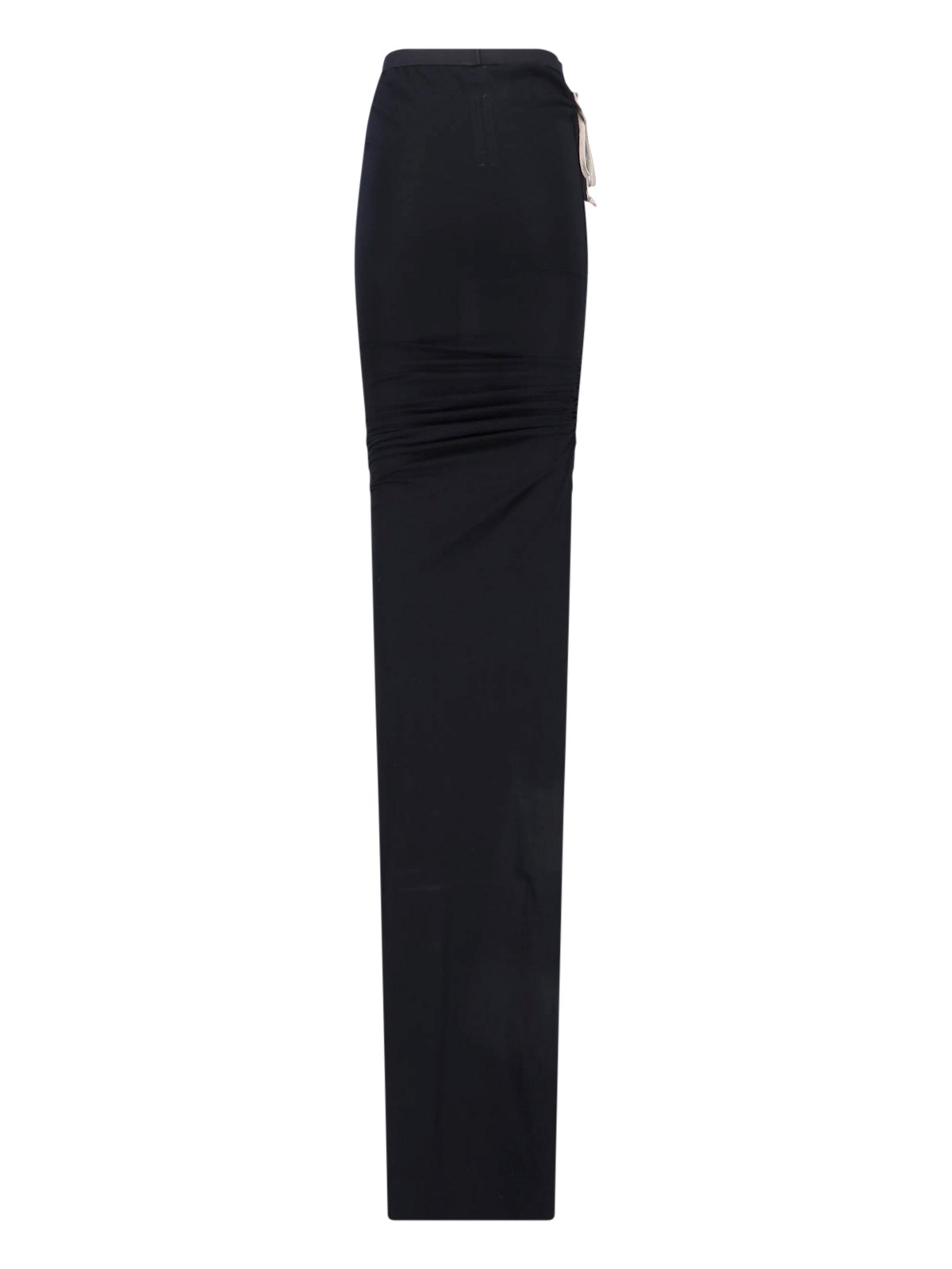 Rick Owens 'EDFU' maxi skirt in black cotton with high waist, side adjust-length straps, maxi side split, straight hem.