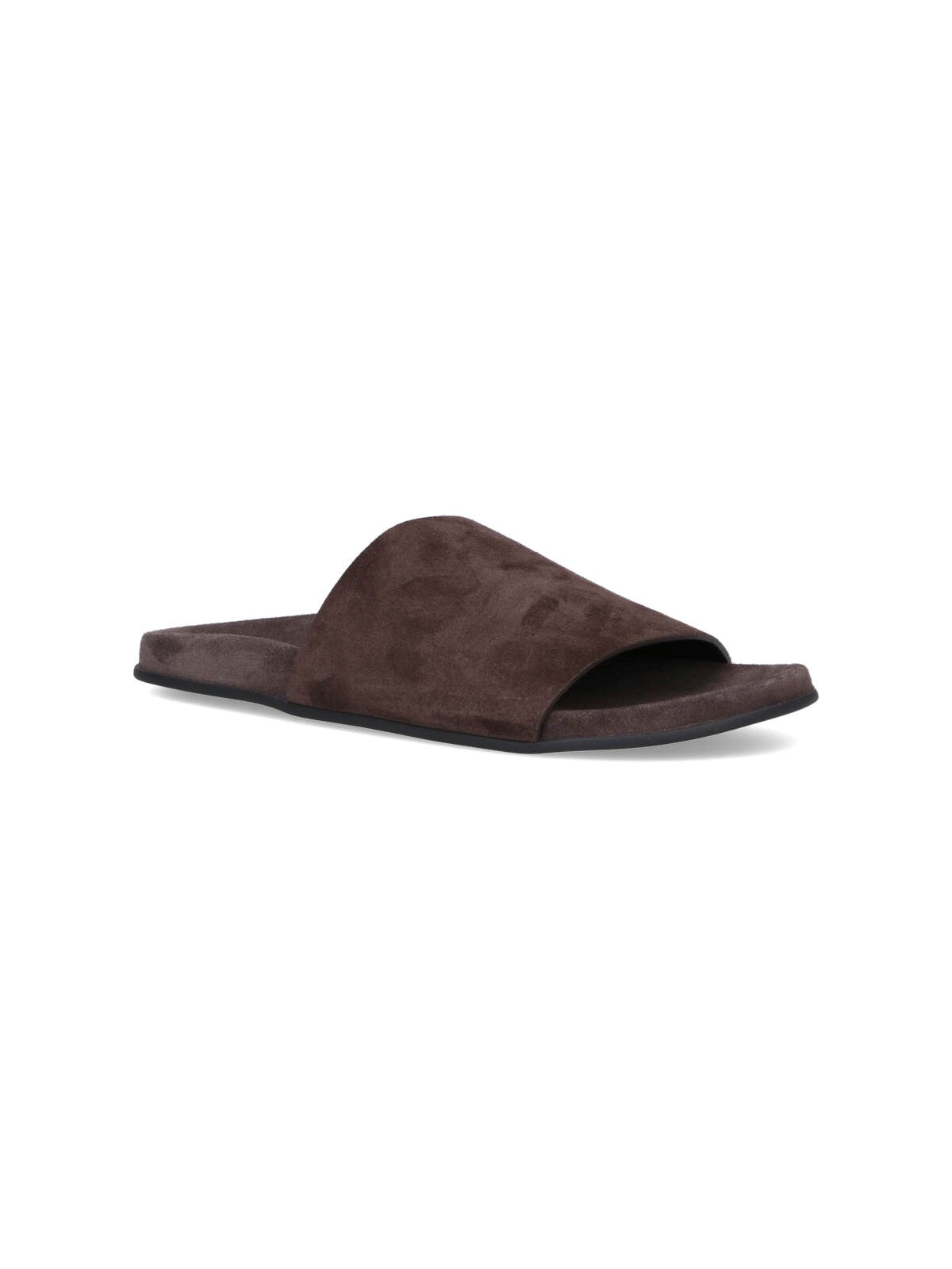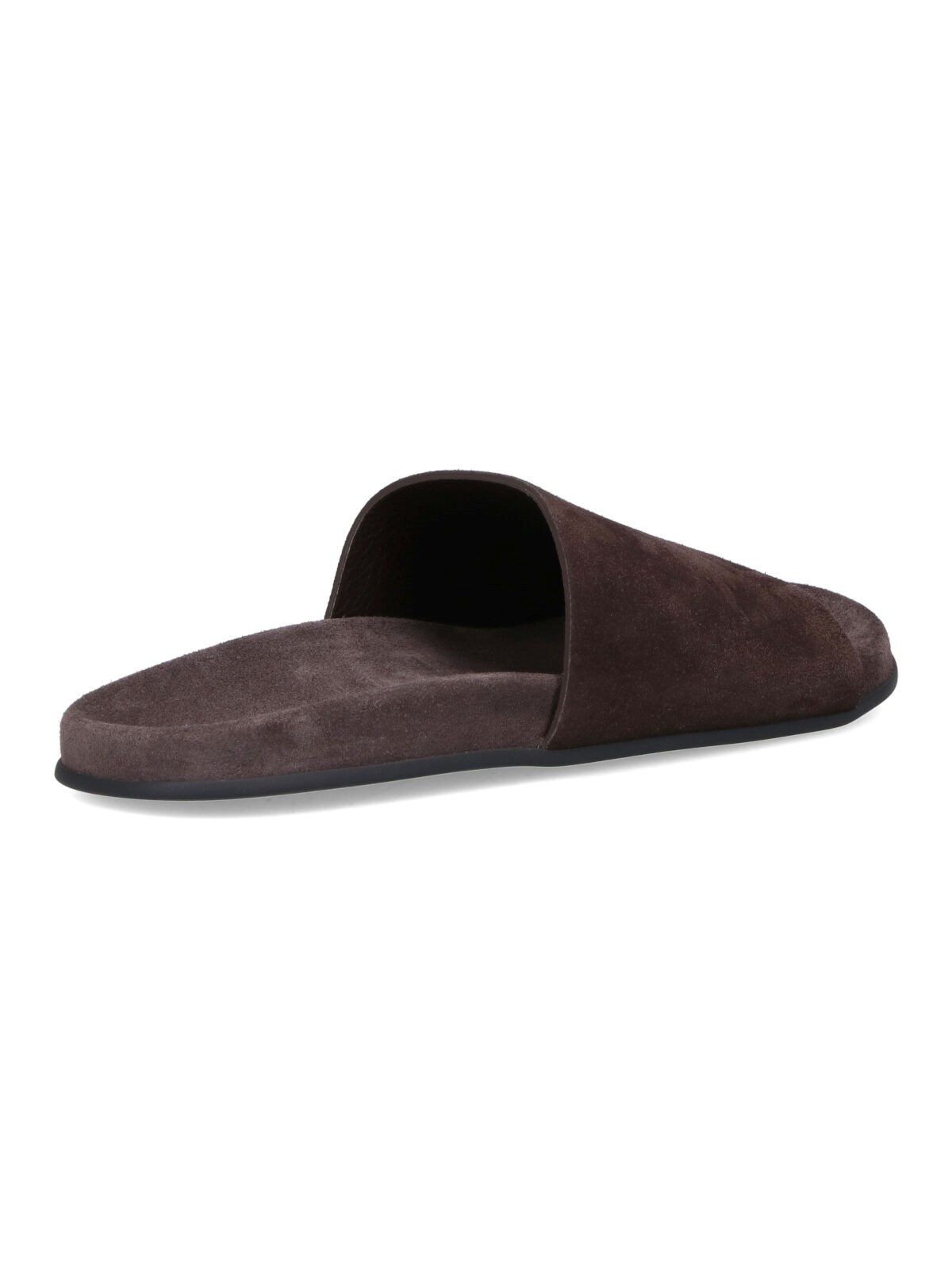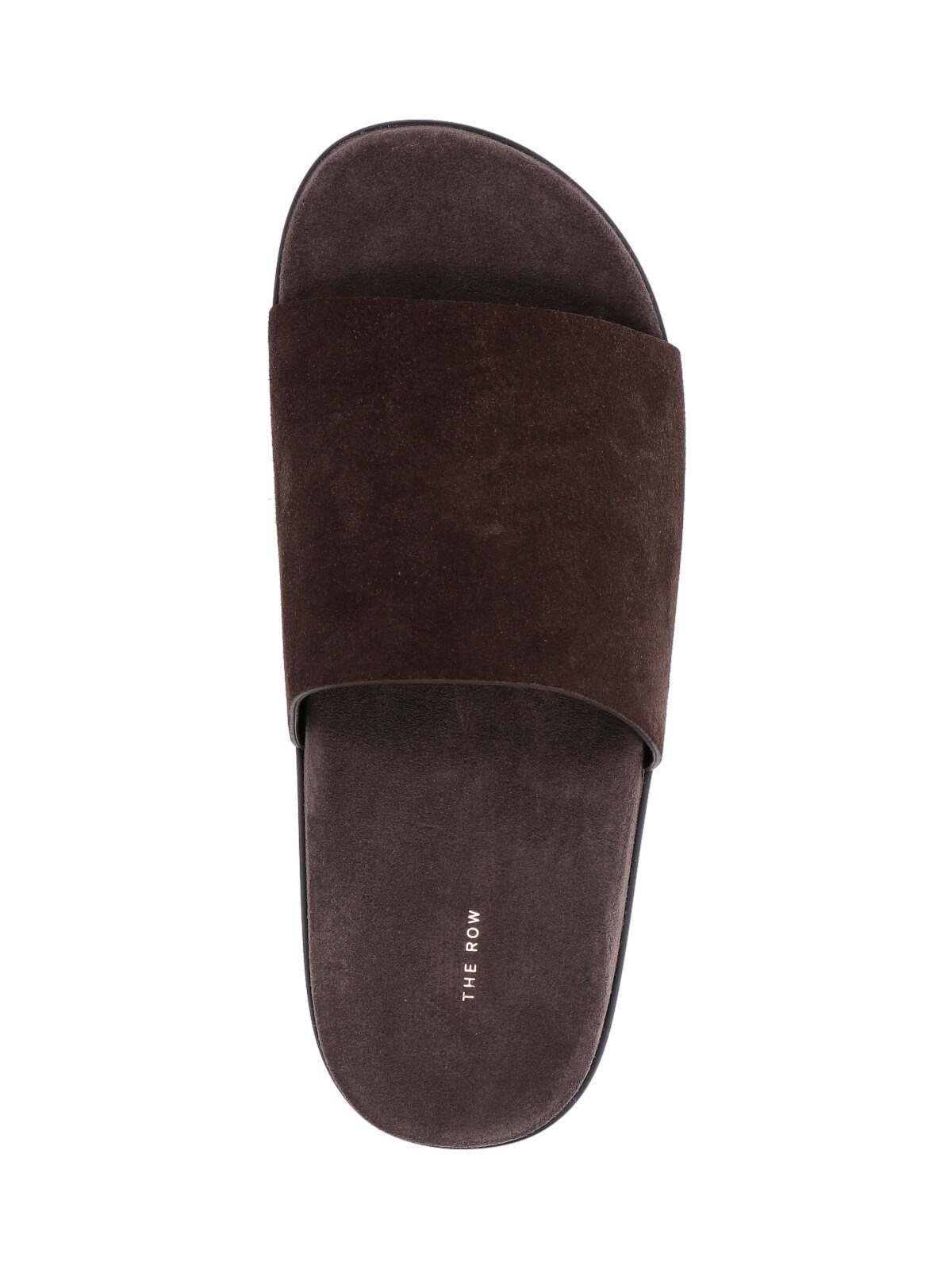 The Row "Hugo" slide sandals in brown suede calf leather with round toe, top band, slip-on fit, rubber sole.