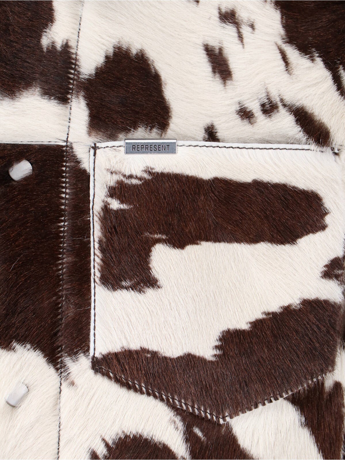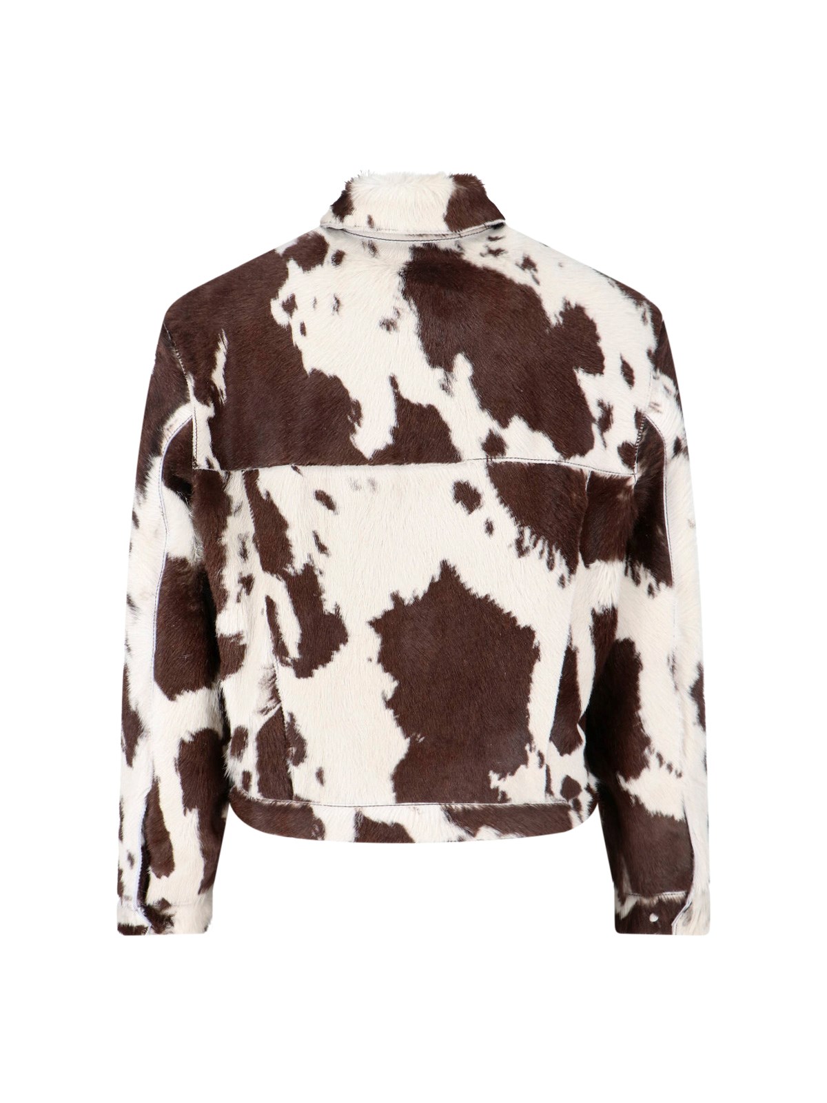Represent multicolor leather animal jacket with Cow Print collar, button closure, long sleeves, two front pockets.