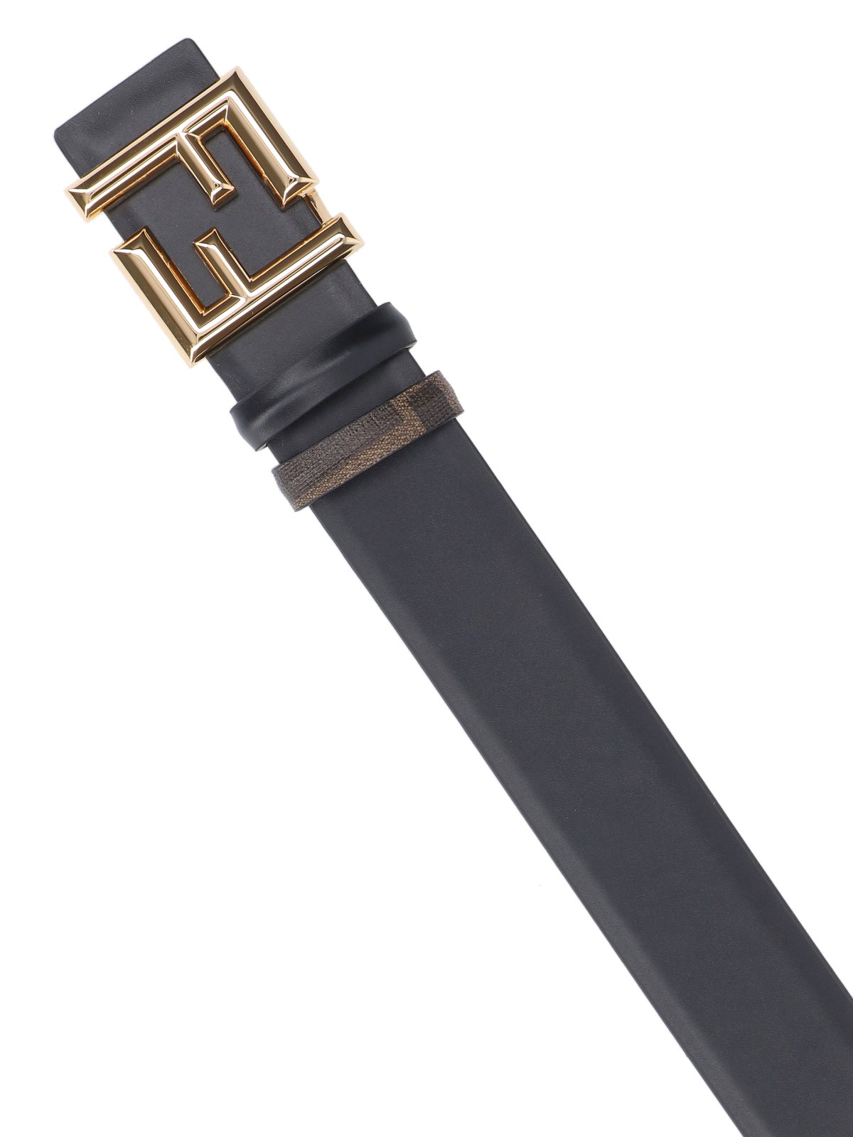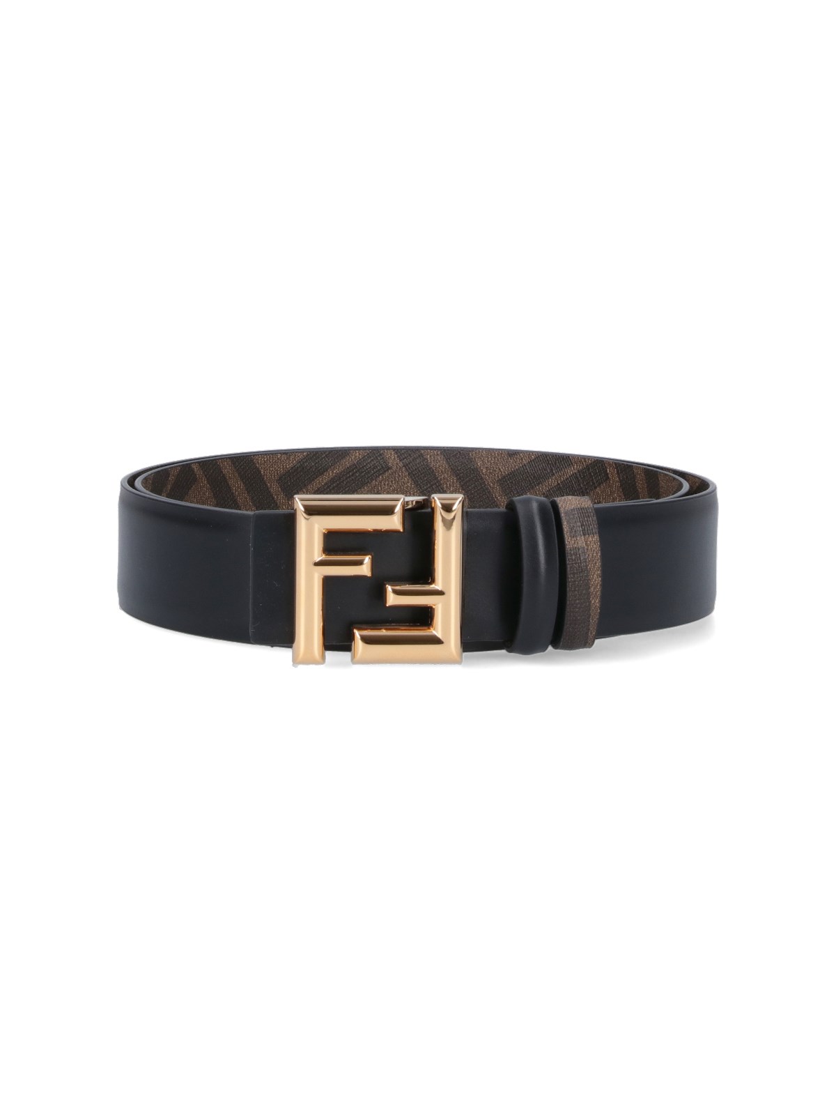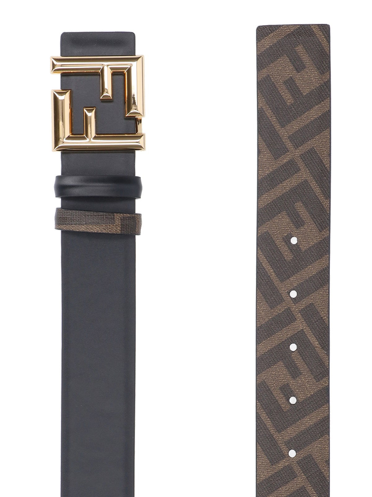 Fendi 'FF Rounded' reversible black leather belt on one side, woven belt with brown 'FF' pattern on the other, gold metal buckle on the front.